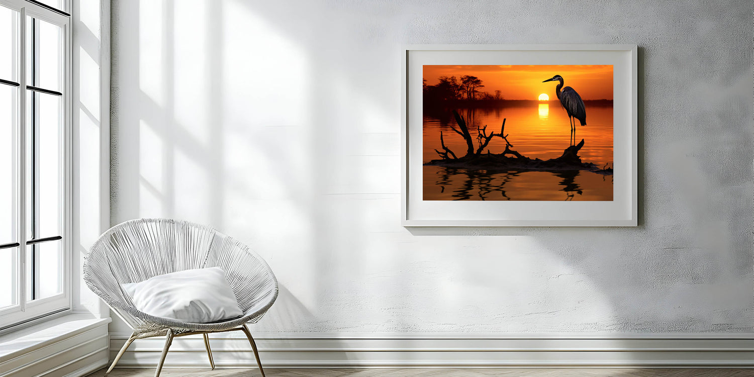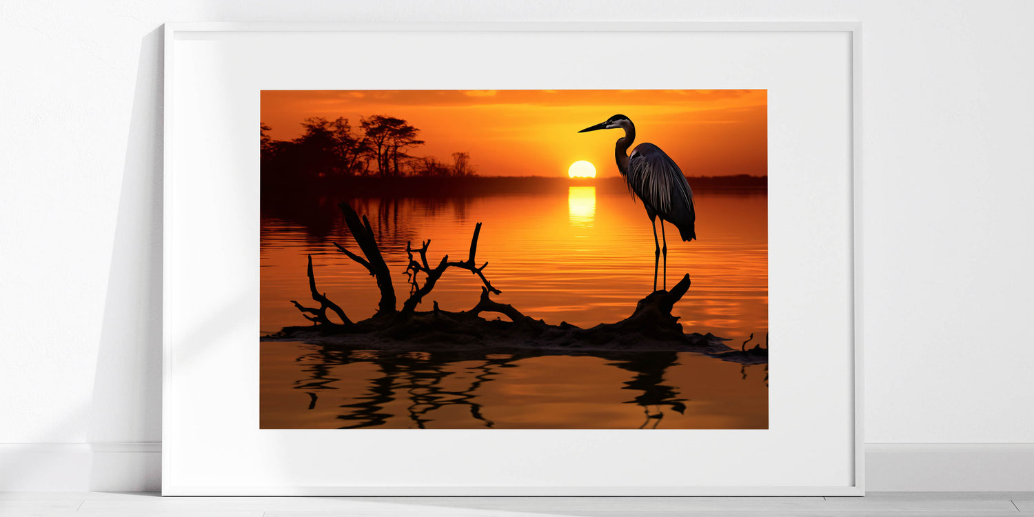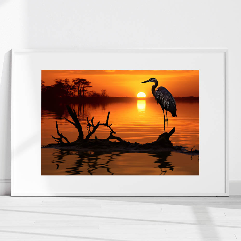 Heron Sunset Wall Art - Majestic Heron in Fiery Sunset Silhouette