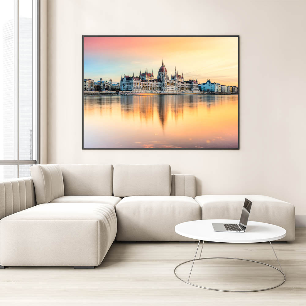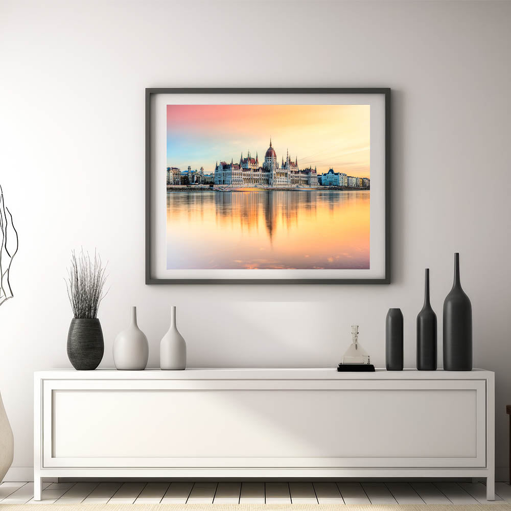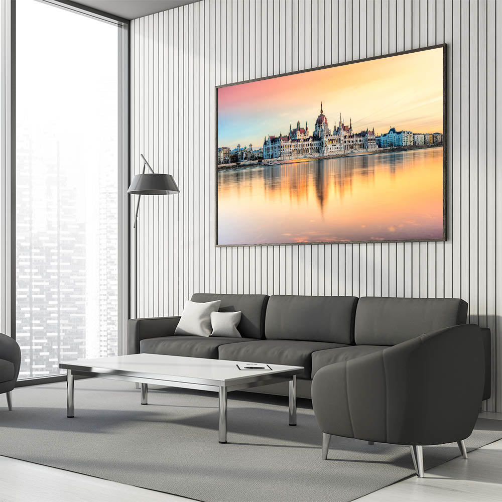 Experience the serene beauty of Budapest with this Hungary Wall Art featuring the iconic Parliament Building at sunset. The soft pastel colors of the sky reflect over the Danube River, creating a mesmerizing and peaceful scene. This Budapest Cityscape Art is a perfect piece for adding warmth and elegance to any space, capturing the essence of Hungary’s capital with its stunning architecture and breathtaking reflections.