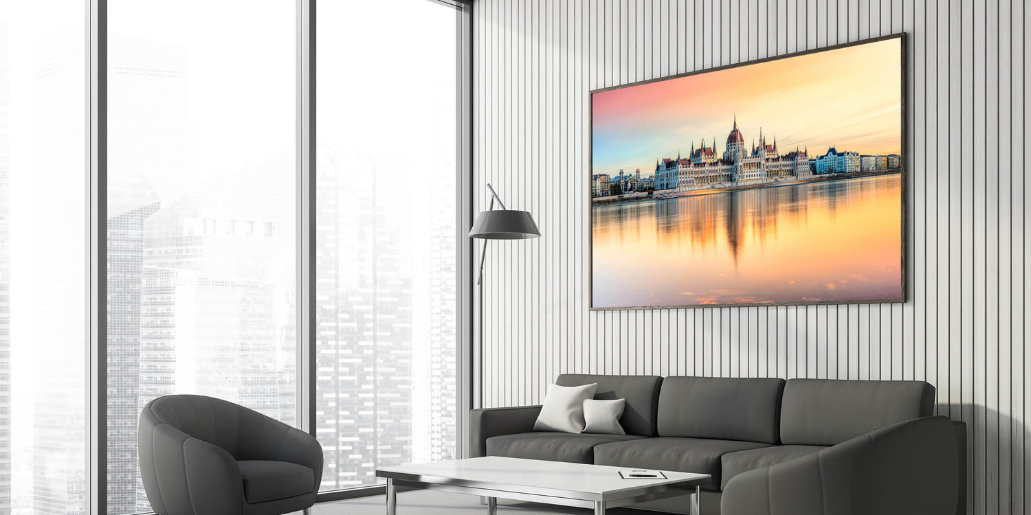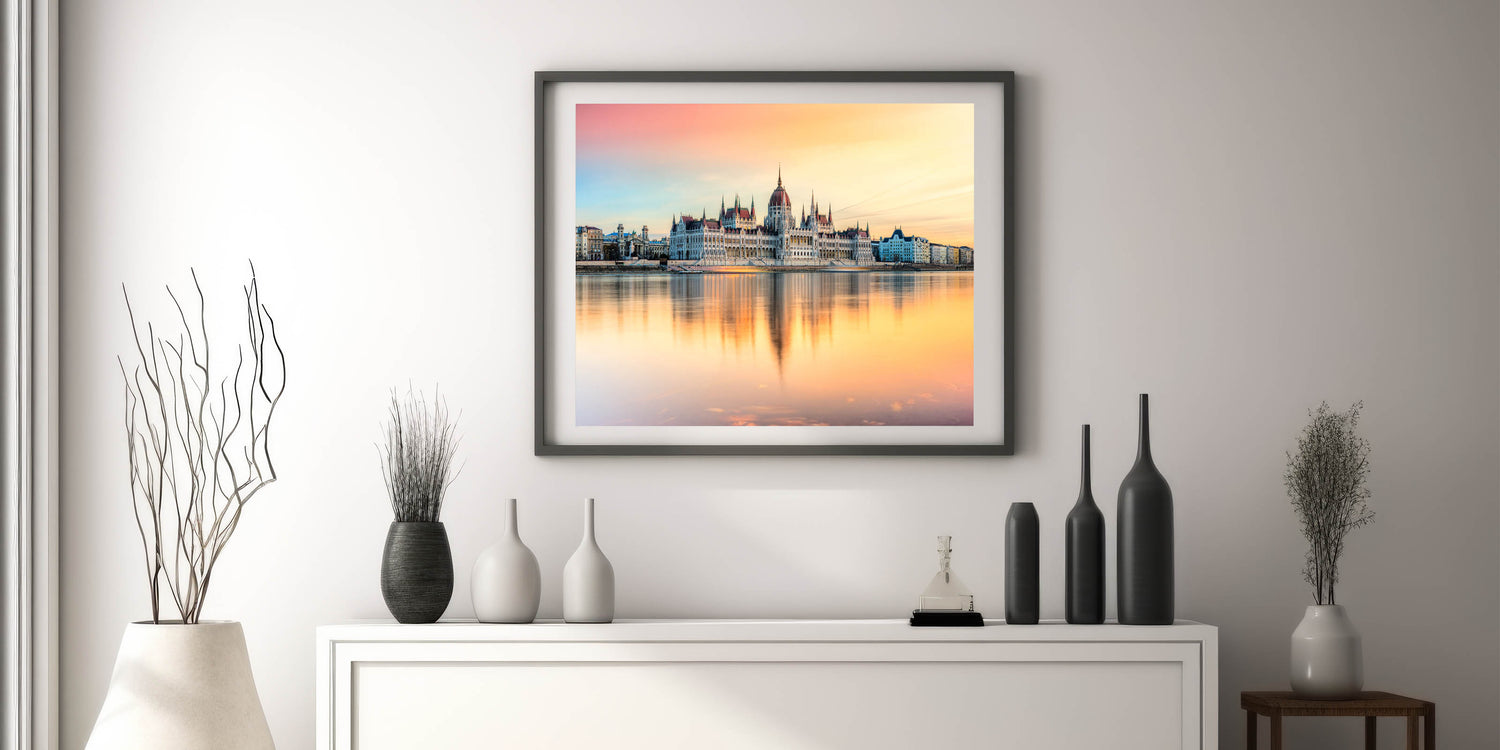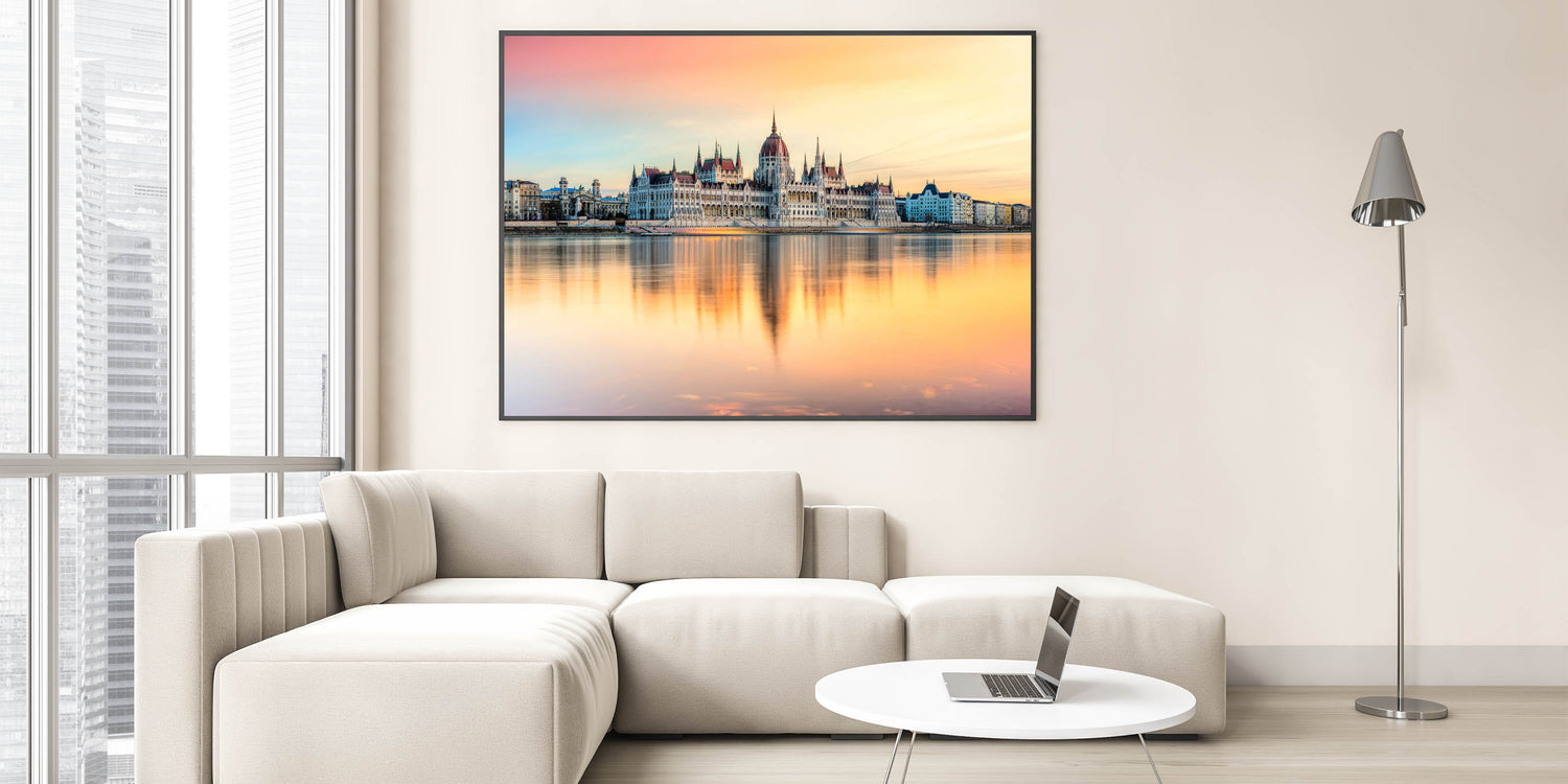 Experience the serene beauty of Budapest with this Hungary Wall Art featuring the iconic Parliament Building at sunset. The soft pastel colors of the sky reflect over the Danube River, creating a mesmerizing and peaceful scene. This Budapest Cityscape Art is a perfect piece for adding warmth and elegance to any space, capturing the essence of Hungary’s capital with its stunning architecture and breathtaking reflections.