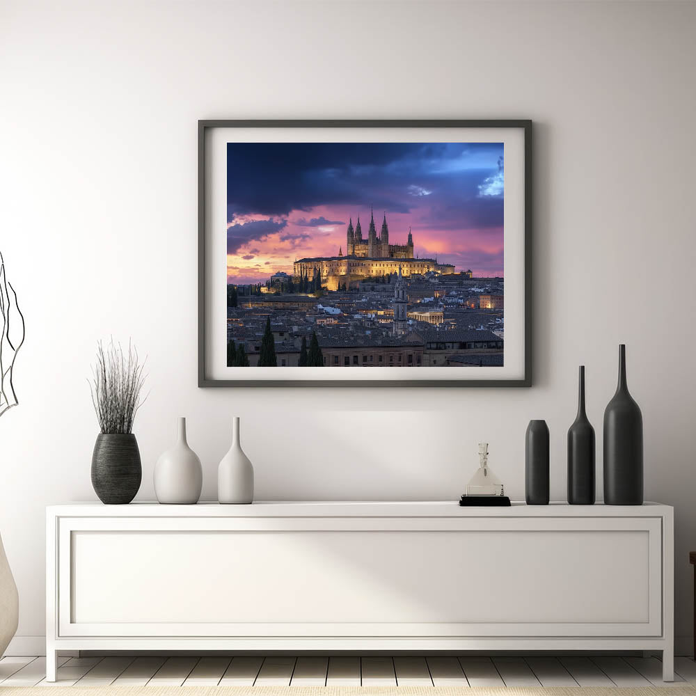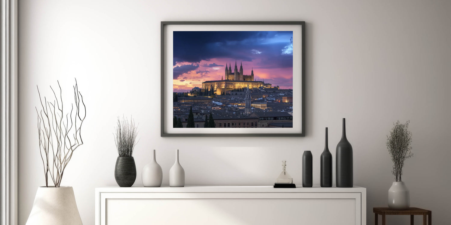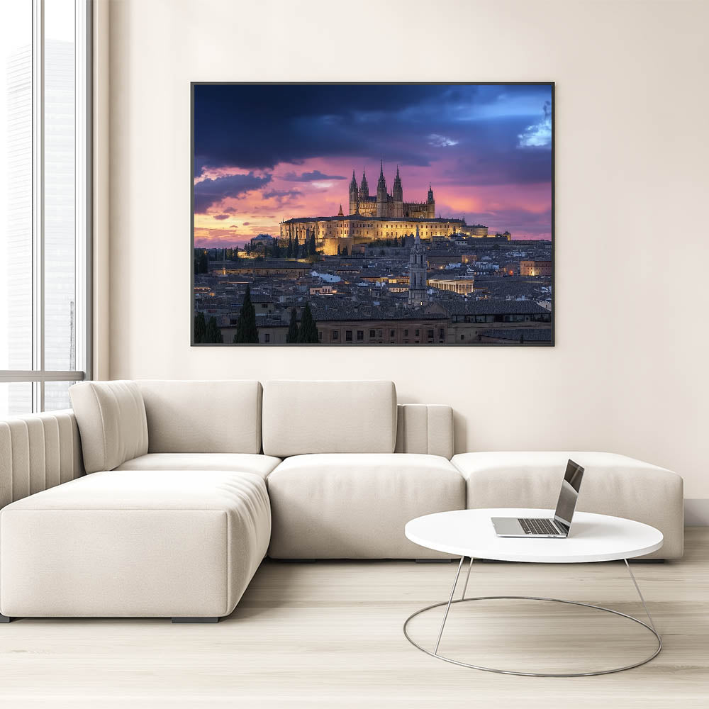 Embrace the grandeur of this illuminated castle artwork, featuring a majestic fortress glowing brilliantly under a dramatic sunset sky. The vivid hues of pink, purple, and blue contrast beautifully with the intricate architecture of the castle and the bustling cityscape below. This stunning castle art print is a harmonious blend of history, art, and the breathtaking allure of dusk.