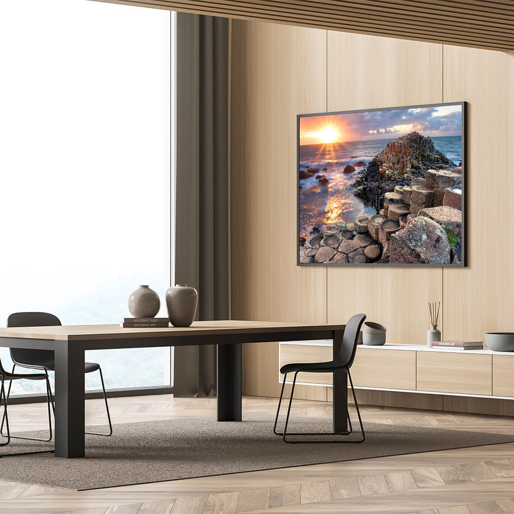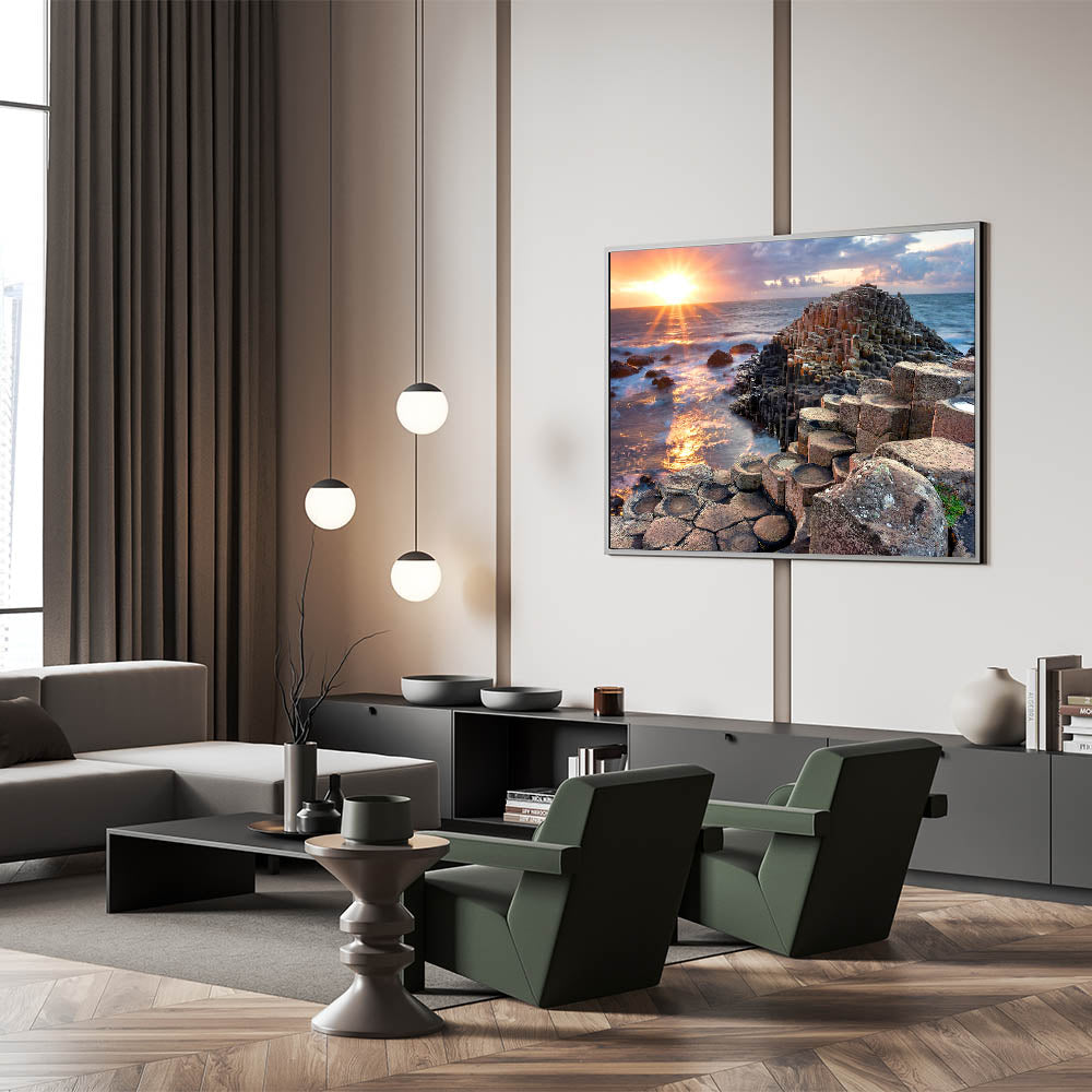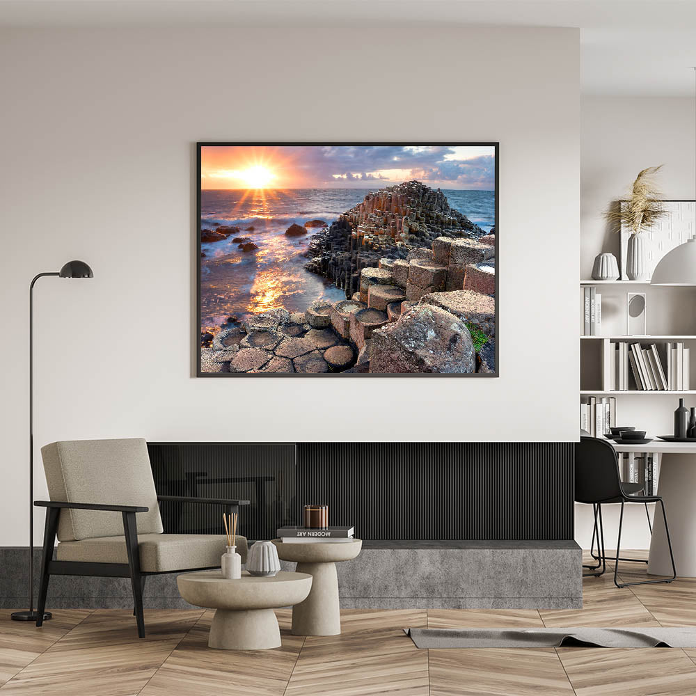 Experience the breathtaking beauty of Ireland's coast with this captivating Ireland nature artwork, showcasing the iconic Giant's Causeway at sunrise. The unique basalt columns, formed by volcanic activity millions of years ago, stand boldly against the backdrop of a stunning sunrise over the Atlantic Ocean. This high-quality Irish landscape print captures the interplay of light and water, bringing the natural wonder of the Giant's Causeway into your living space.