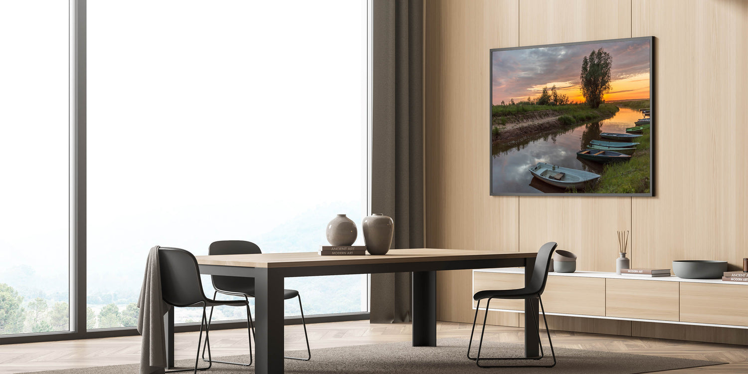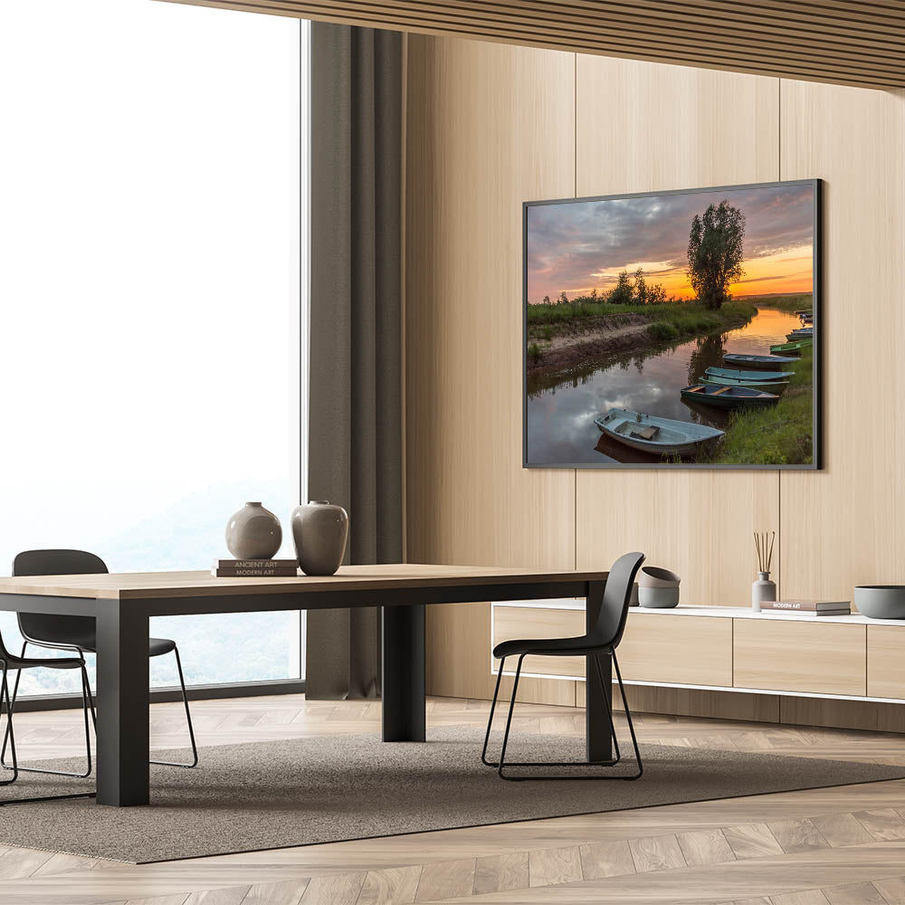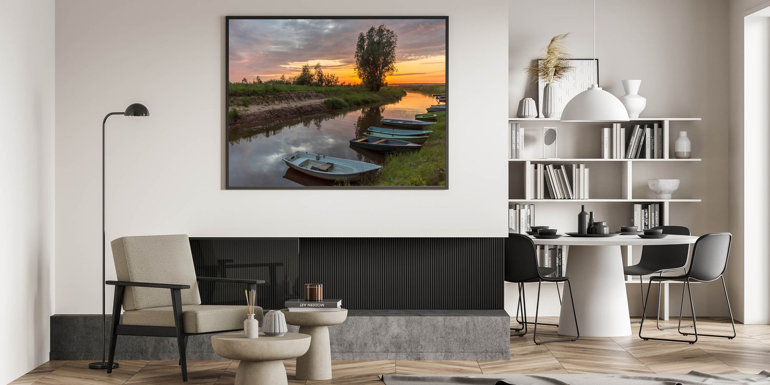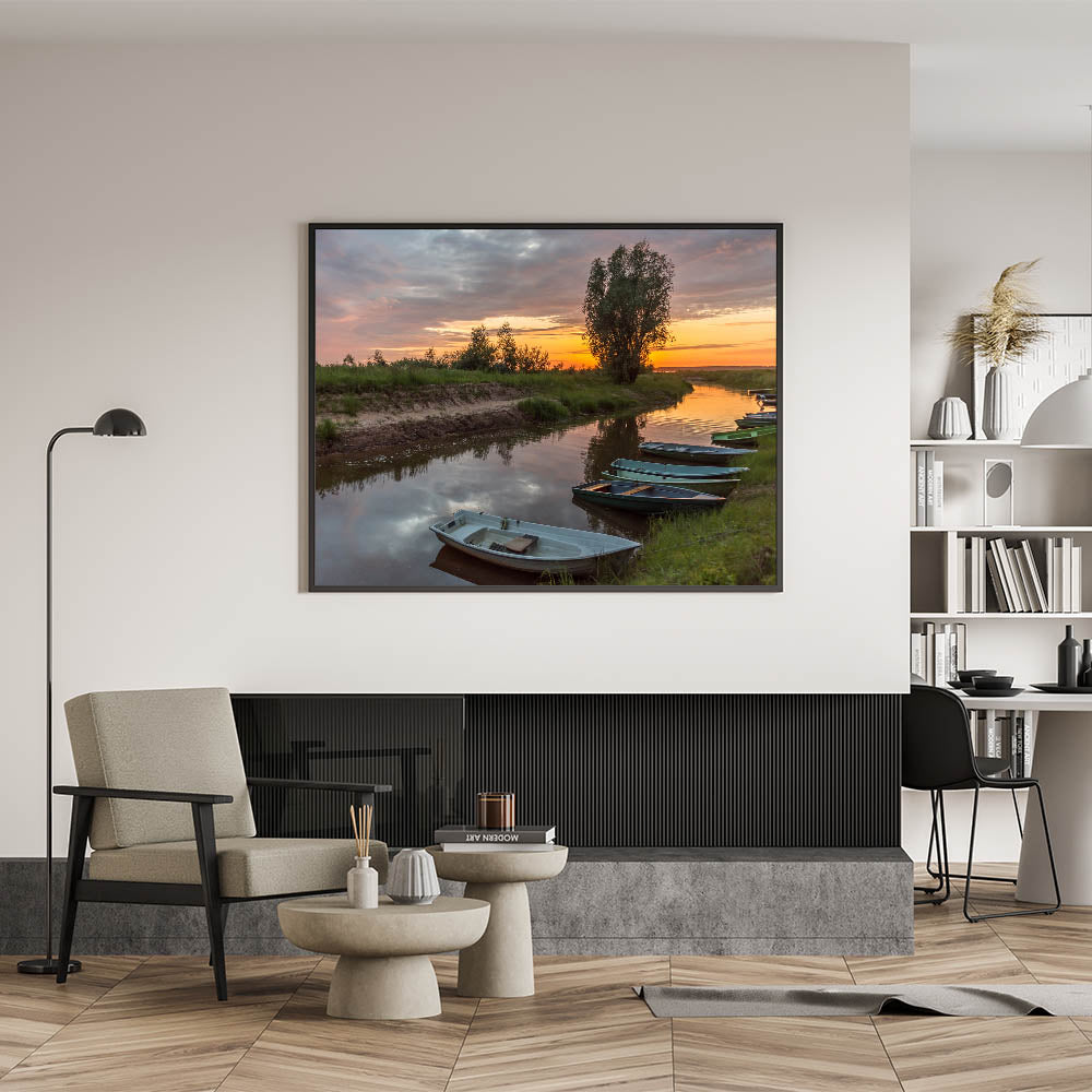 Capture the serene beauty of Latvia with this stunning wall art, featuring an idyllic riverside scene at sunset. The tranquil waters, lined with wooden boats, reflect the vibrant hues of the sky as the sun sets behind a lush tree line. This artwork perfectly embodies the peaceful charm of Latvian landscapes, making it a wonderful addition to any space seeking to capture the essence of nature.