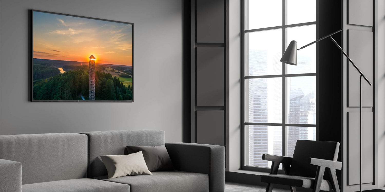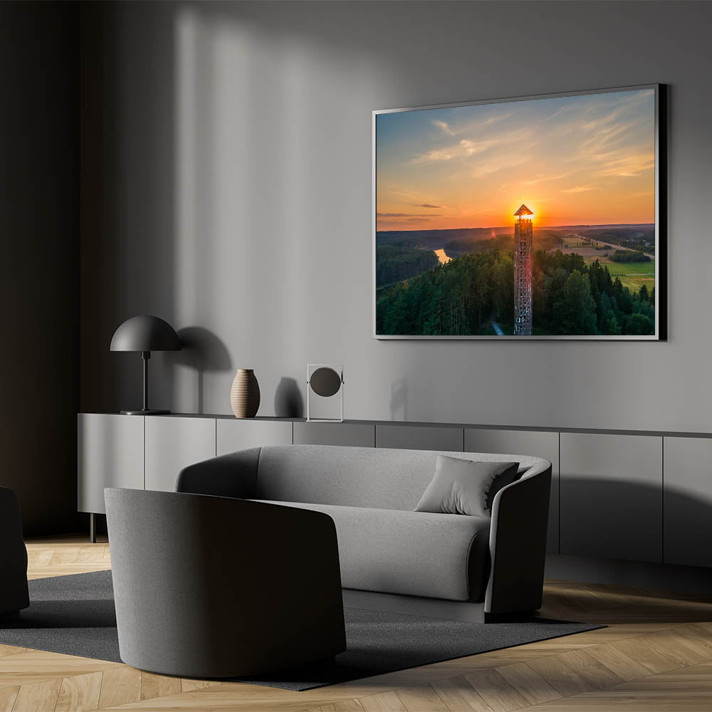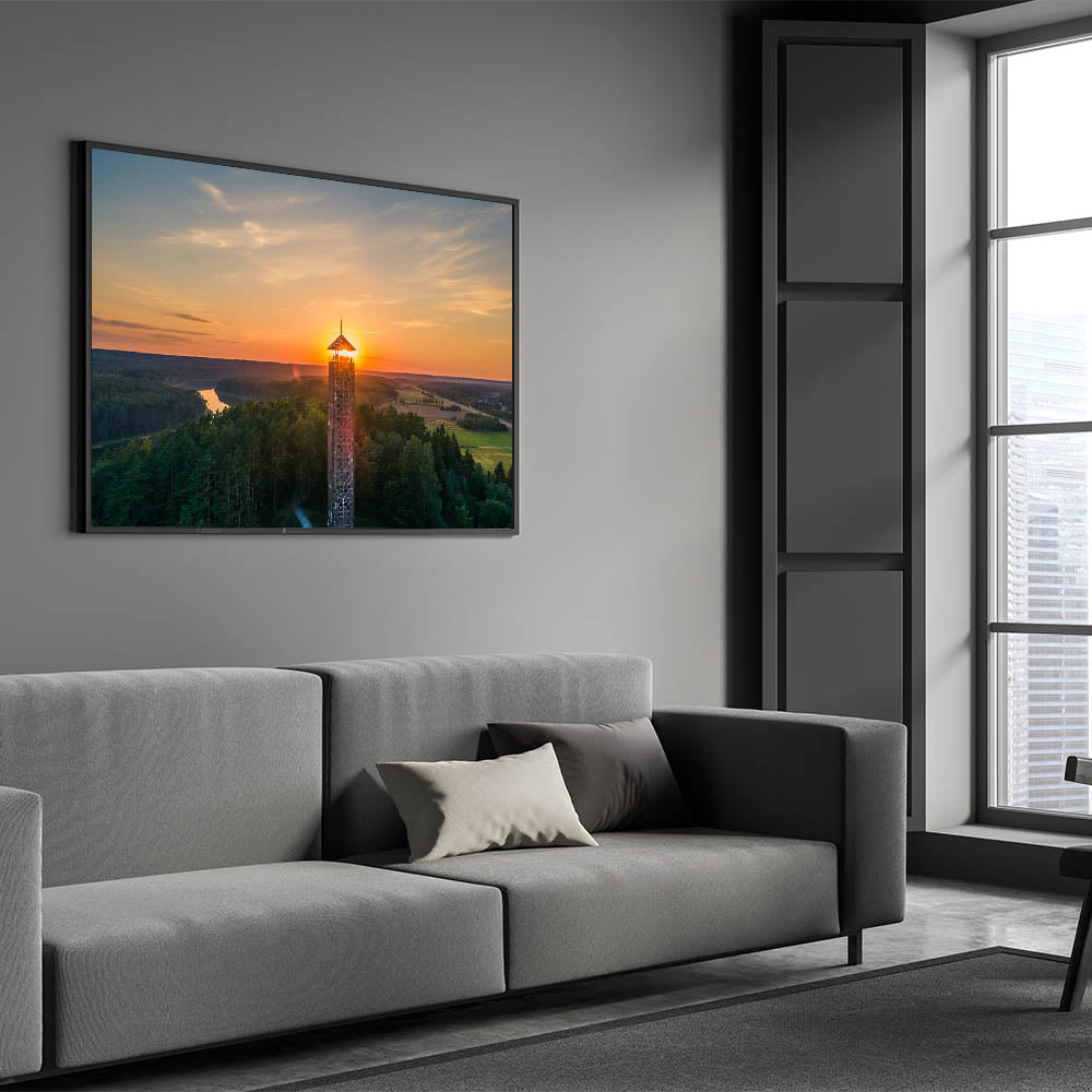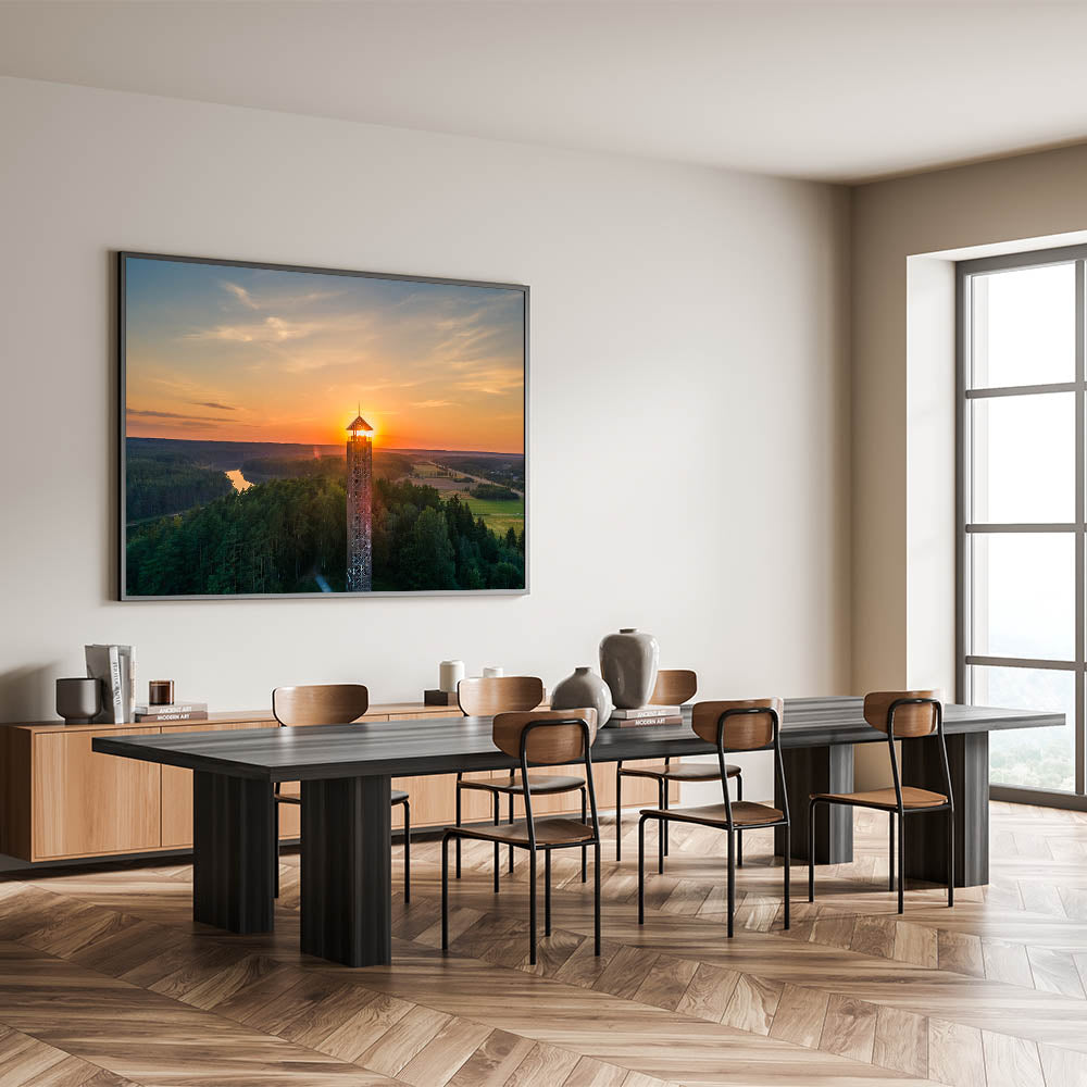This captivating wall art showcases a stunning sunset over a panoramic overlook tower, surrounded by the vast and serene Lithuanian landscape. The vibrant hues of the sunset contrast beautifully with the lush green forests and the distant winding river, making this artwork a perfect representation of the Baltic region’s natural beauty. This Lithuania wall art is ideal for anyone who appreciates nature photography and the calm, reflective moments that the landscape offers at dusk.