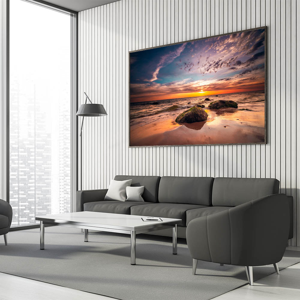 Bring the captivating beauty of Lithuania's Baltic coast into your home with this stunning wall art piece. Featuring a mesmerizing sunset over the Baltic Sea, this artwork highlights the natural splendor of the region. The vibrant hues of orange, blue, and pink are perfectly captured, making this a must-have addition to any home or office decor.
