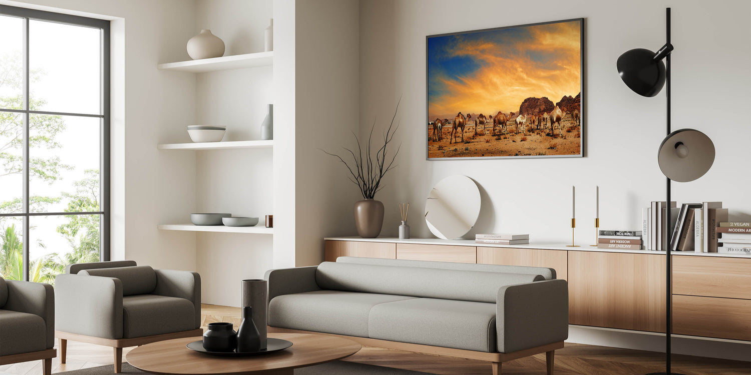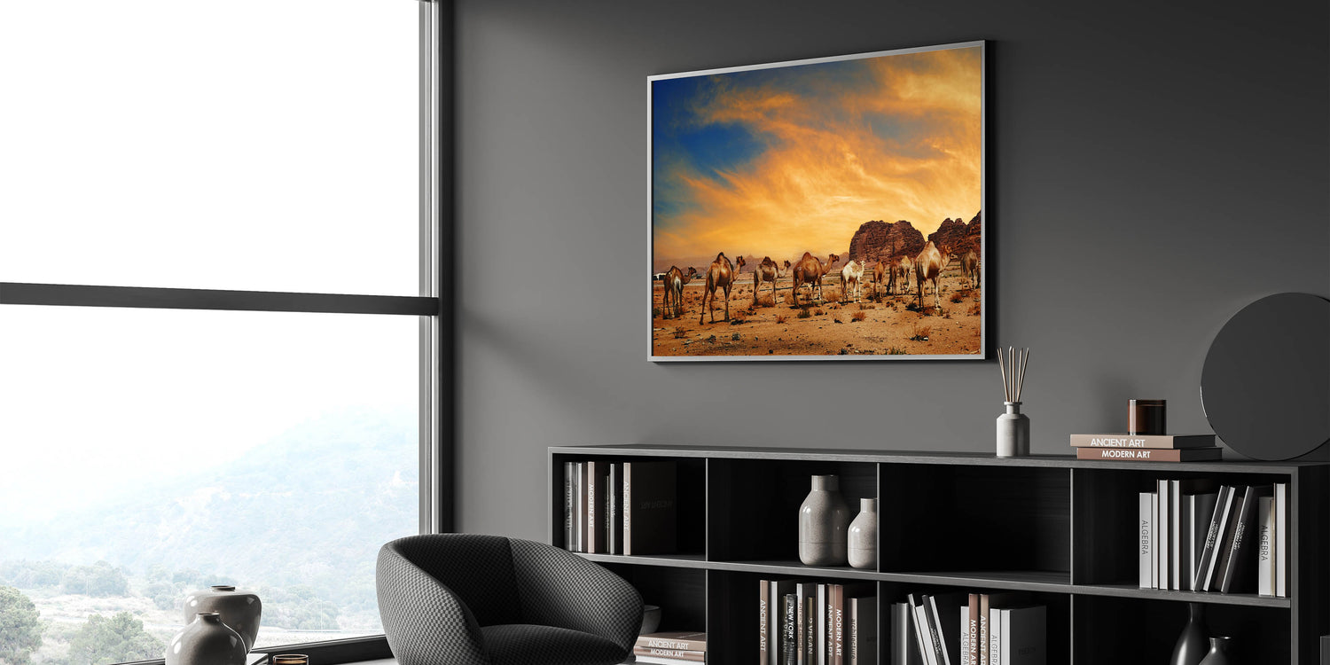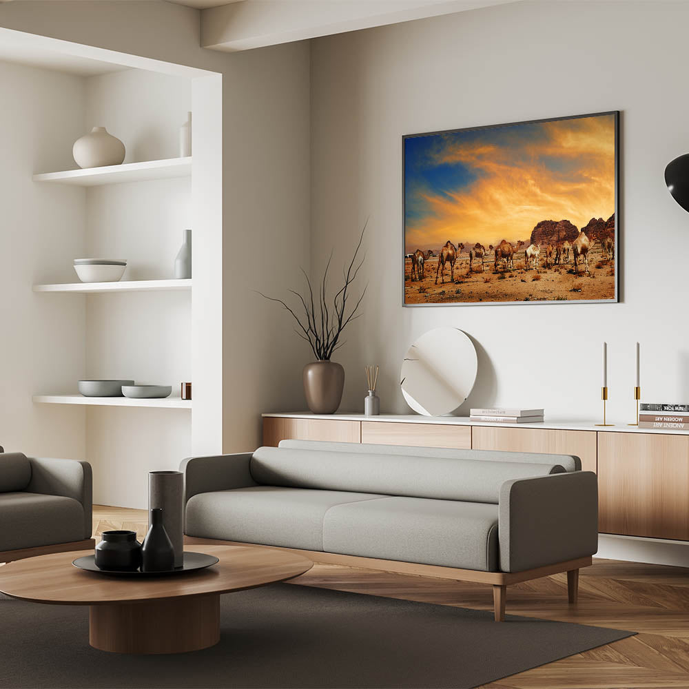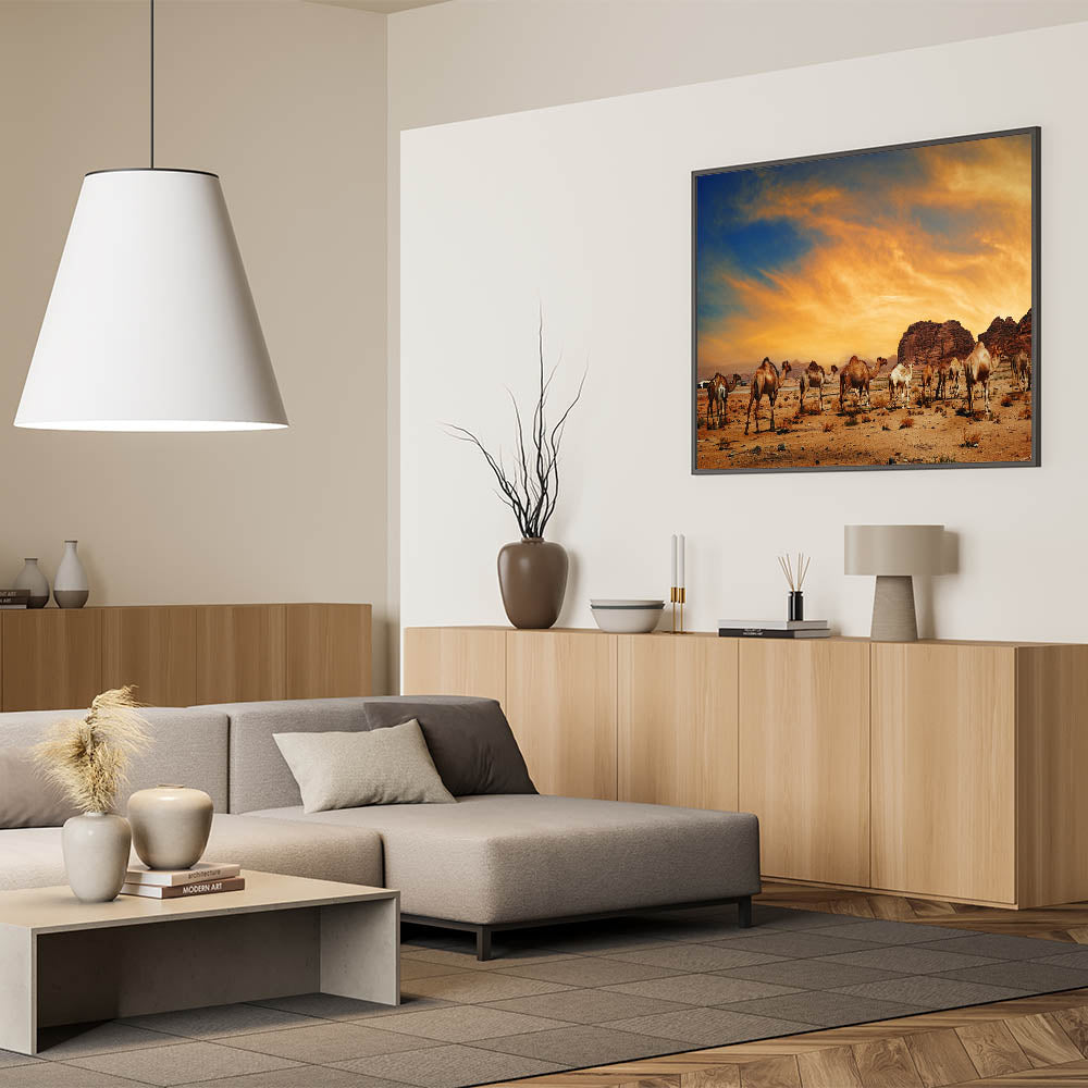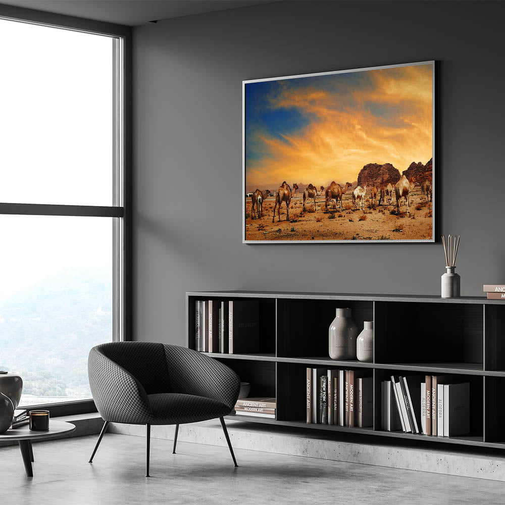 Bring the spirit of the desert into your home with this stunning wall art, featuring a group of majestic camels set against a vibrant sunset sky. The warm, golden tones of the sky and the rugged desert terrain create a captivating scene that embodies the timeless beauty of the desert. This artwork is perfect for adding a touch of exotic elegance to any room, making it an ideal piece for those who appreciate the allure of desert landscapes.