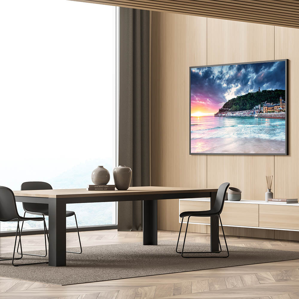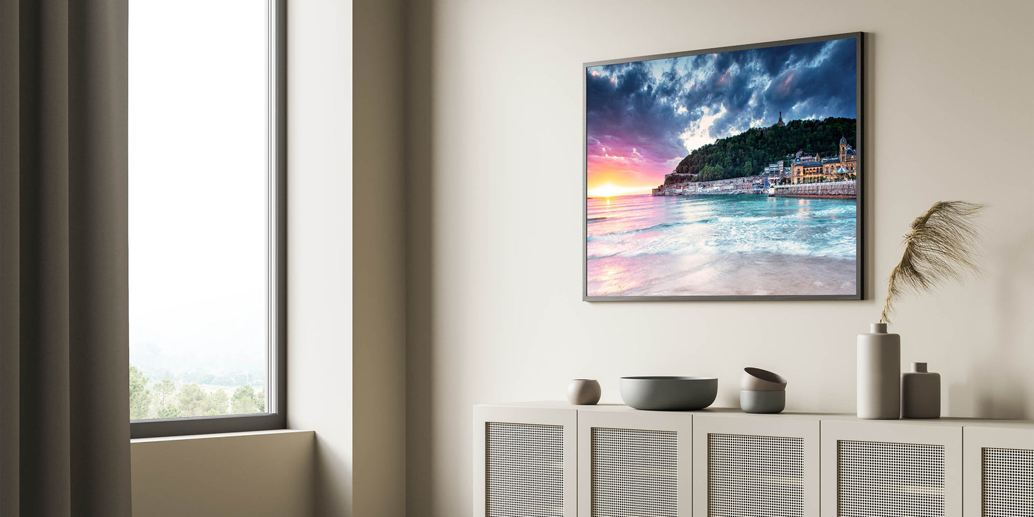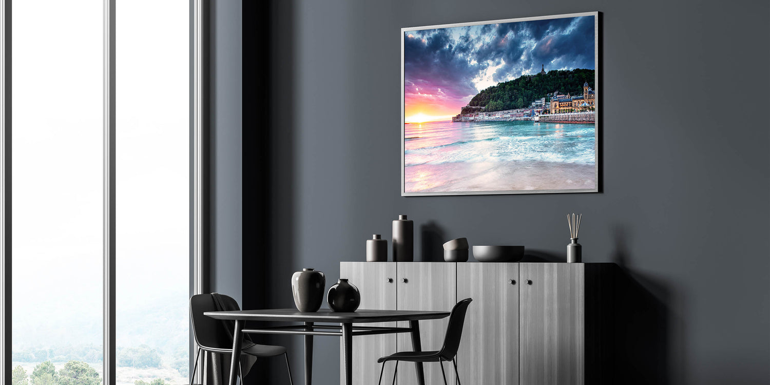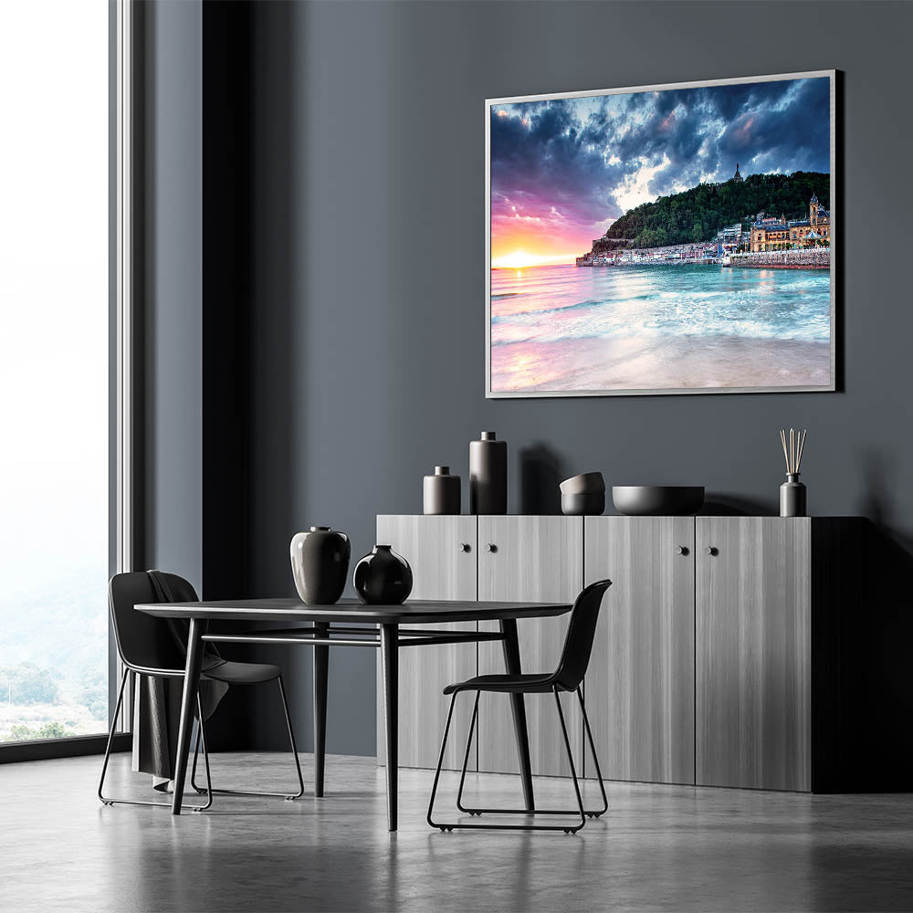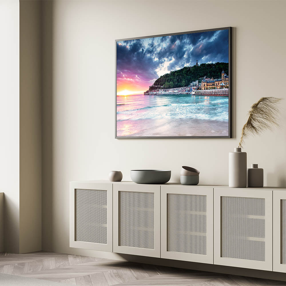 Capture the breathtaking beauty of the Mediterranean with this stunning sunset scene, featuring a serene coastal town nestled against a lush hillside. The vibrant sunset colors blend with the calming blues of the sea, creating a picturesque landscape that brings warmth and tranquility into any space. This Mediterranean sunset wall art is perfect for those who love coastal Mediterranean decor and want to bring the calming essence of the region into their home.