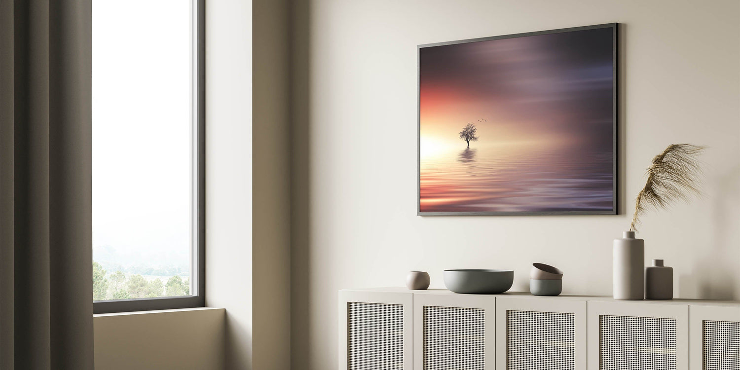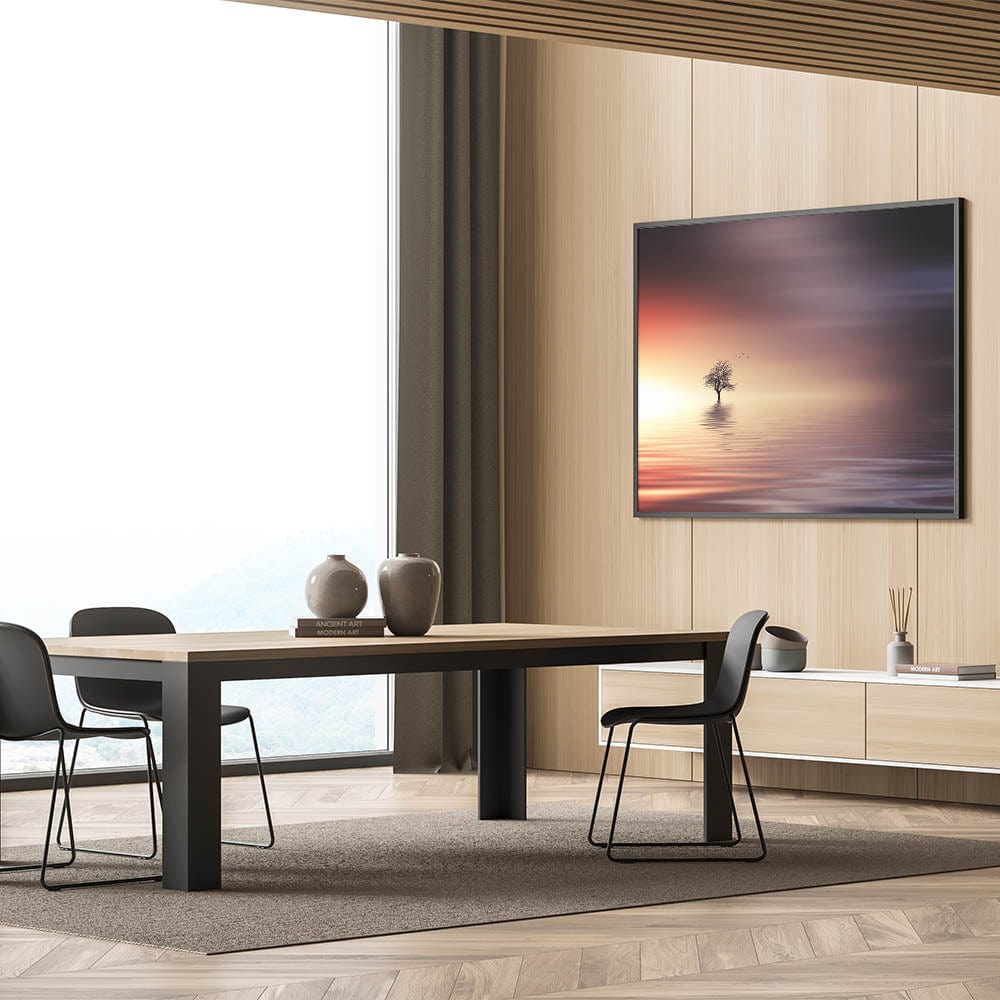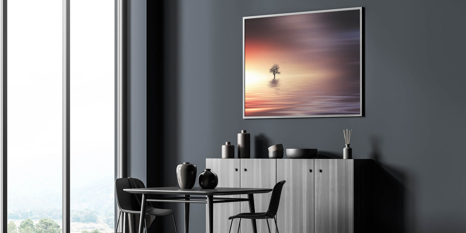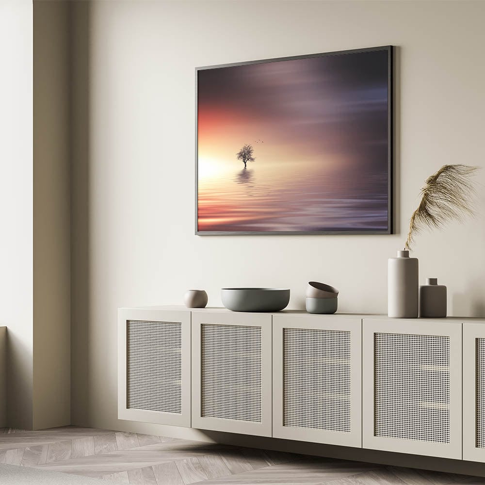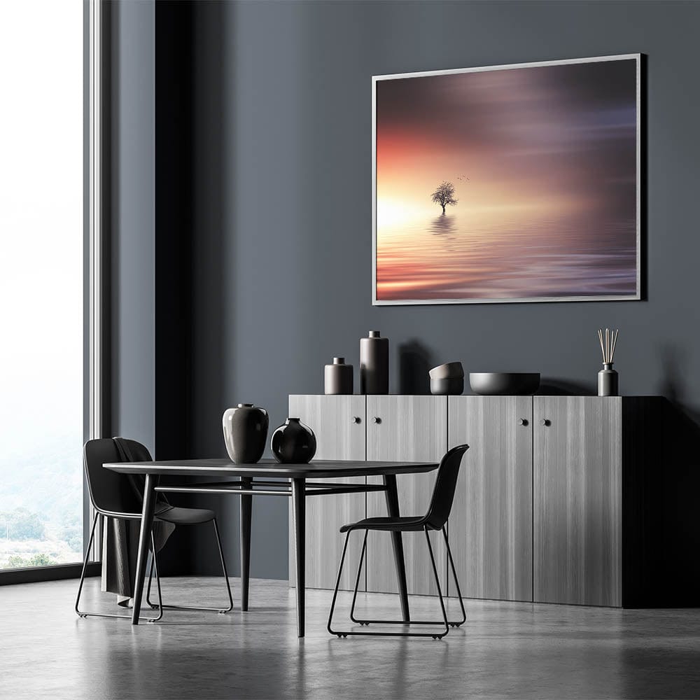 Minimalist Mountain Wall Art – Solitary Tree at Sunset Water Scene