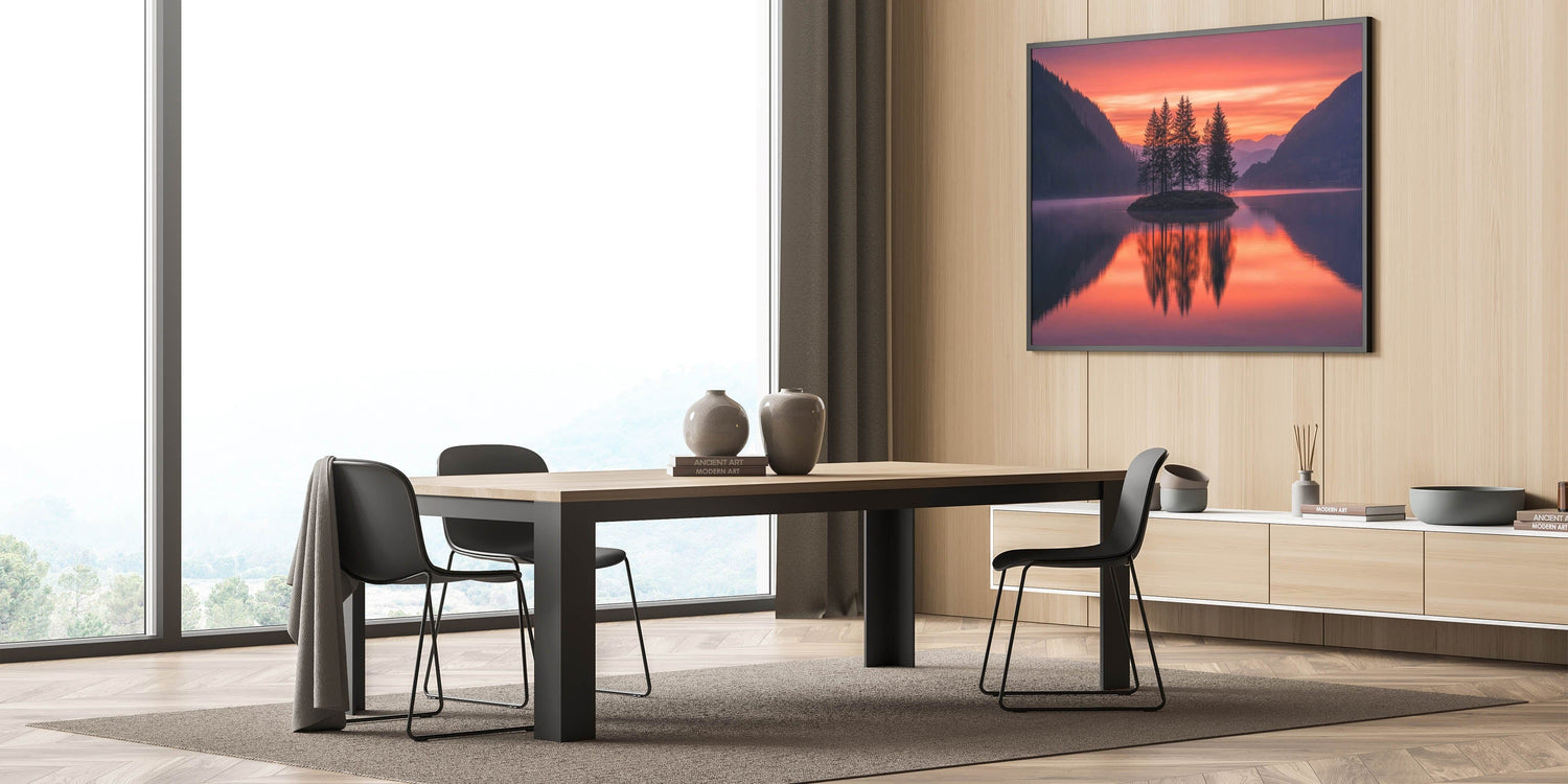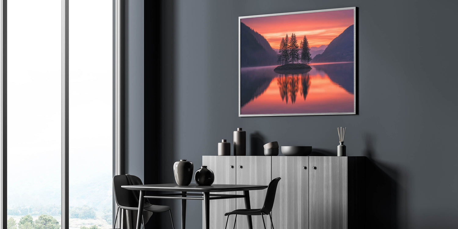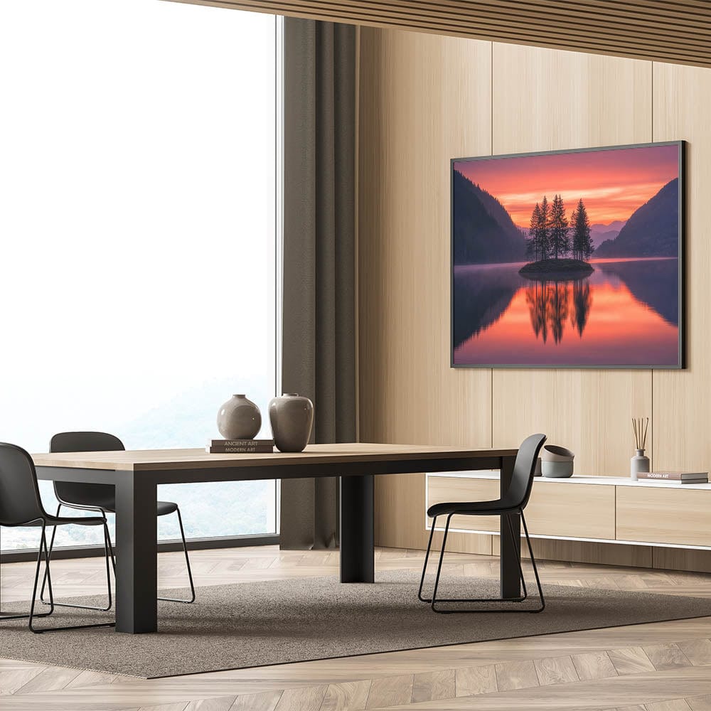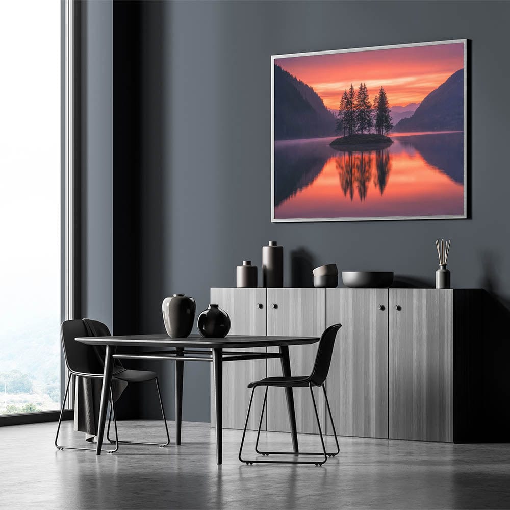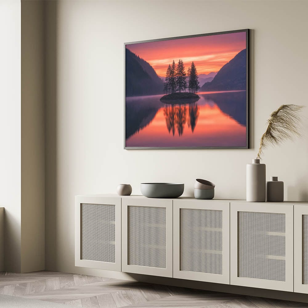 This Minimalist Scenic Art Print captures the beauty of nature in its purest form—a cluster of trees on a serene island, mirrored in a still lake beneath a vibrant sunset sky. The warm hues of orange, red, and purple blend seamlessly with the surrounding dark mountains, creating a Modern Minimalist Landscape Print that radiates tranquility and balance.