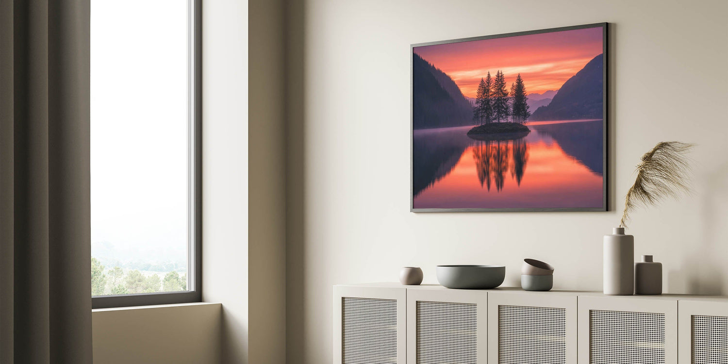 - High-quality minimalist scenic art print with a dreamy lake reflection
