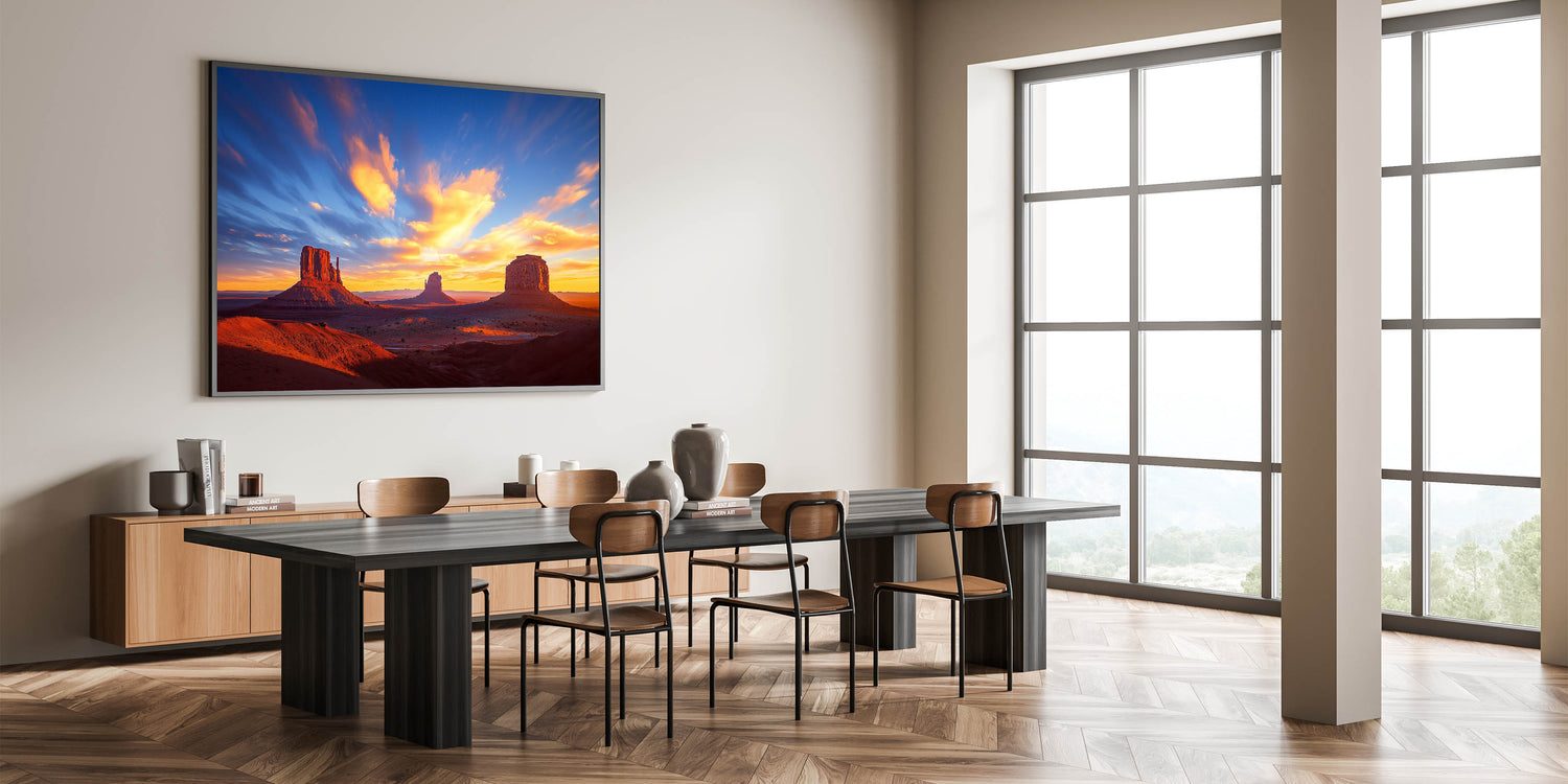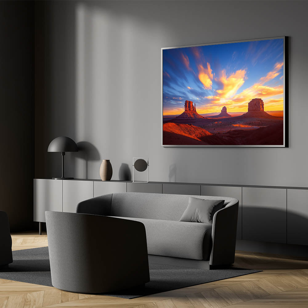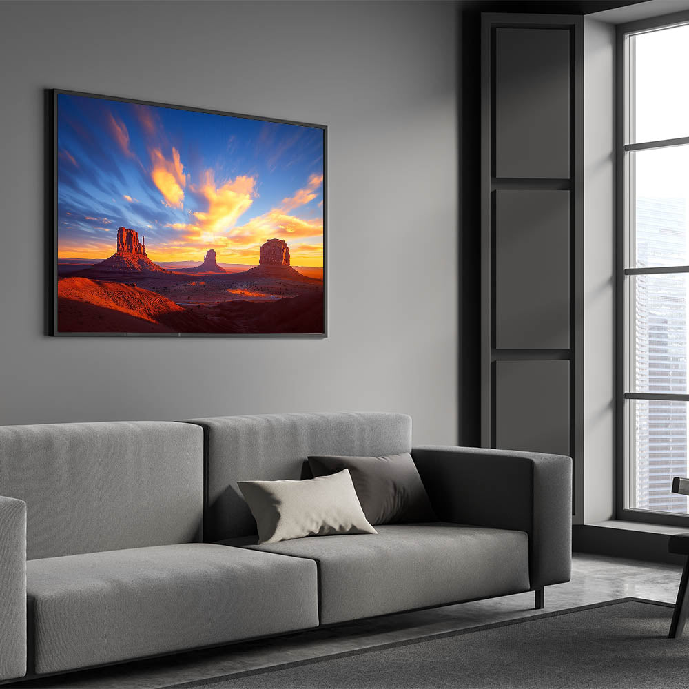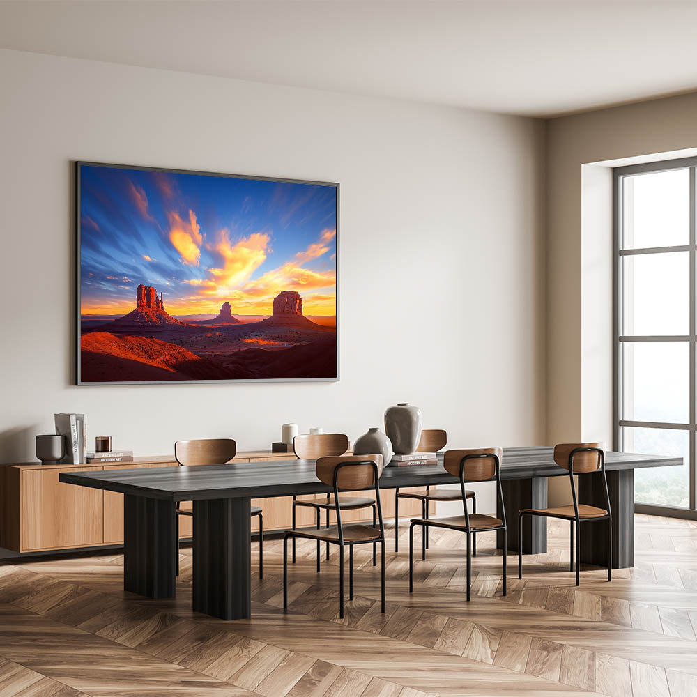 Bring the radiant beauty of the Southwest into your home with Monument Valley Sunrise Glow Wall Art. Featuring the iconic buttes of Monument Valley bathed in the warm hues of sunrise and framed by a dramatic, colorful sky, this piece is a stunning representation of desert scenery prints. Perfect for adding warmth and elegance to your space, it captures the magic of nature's palette.