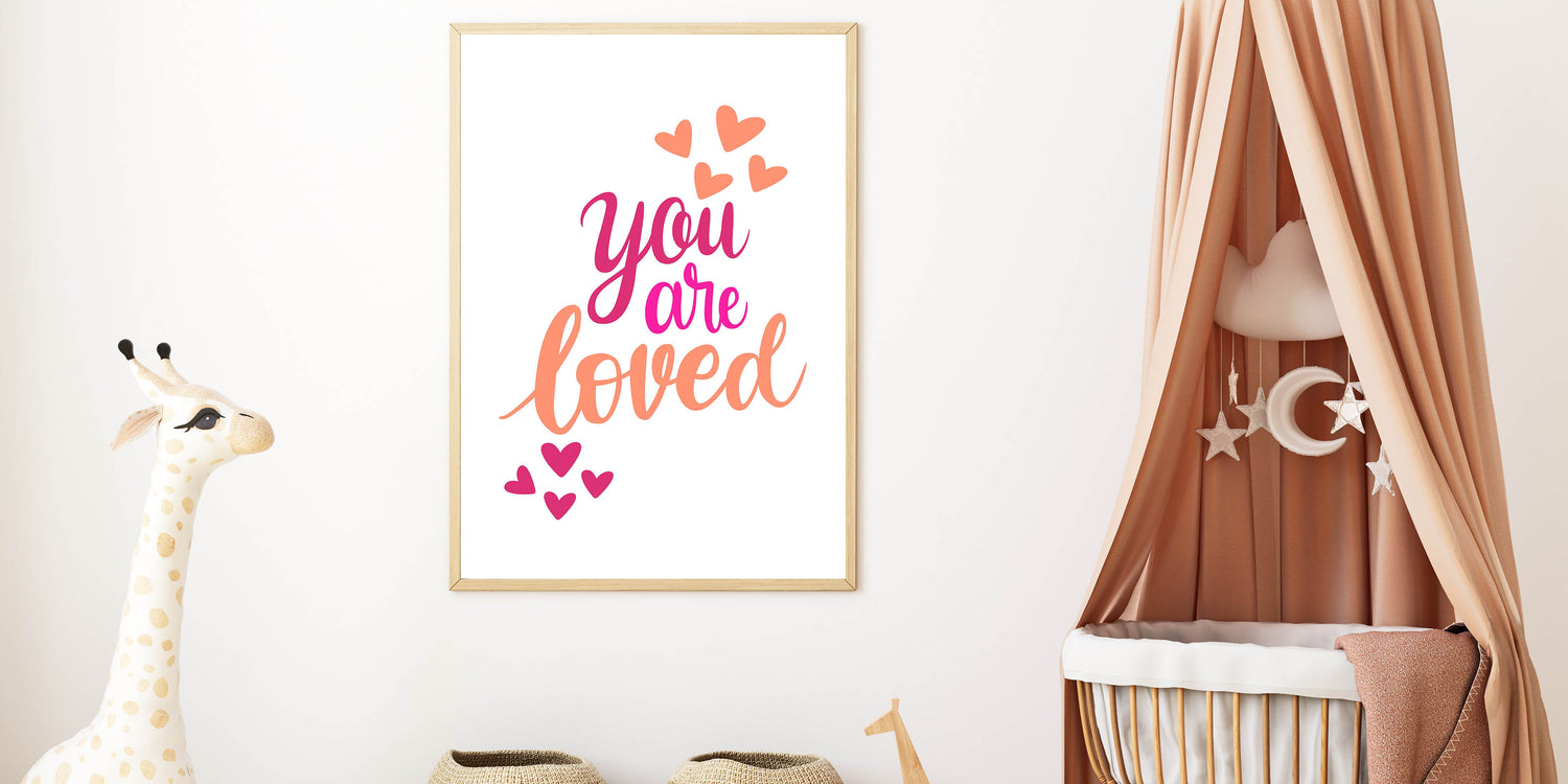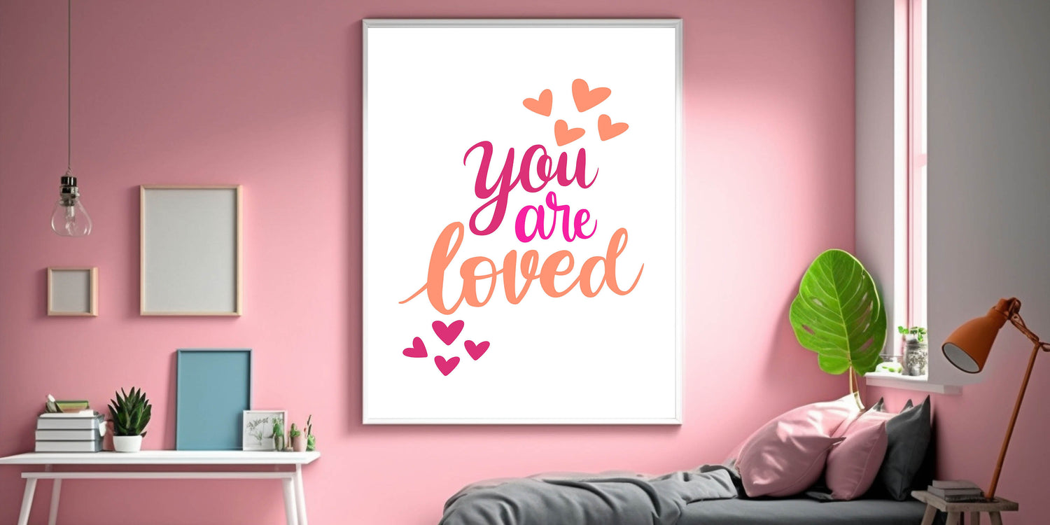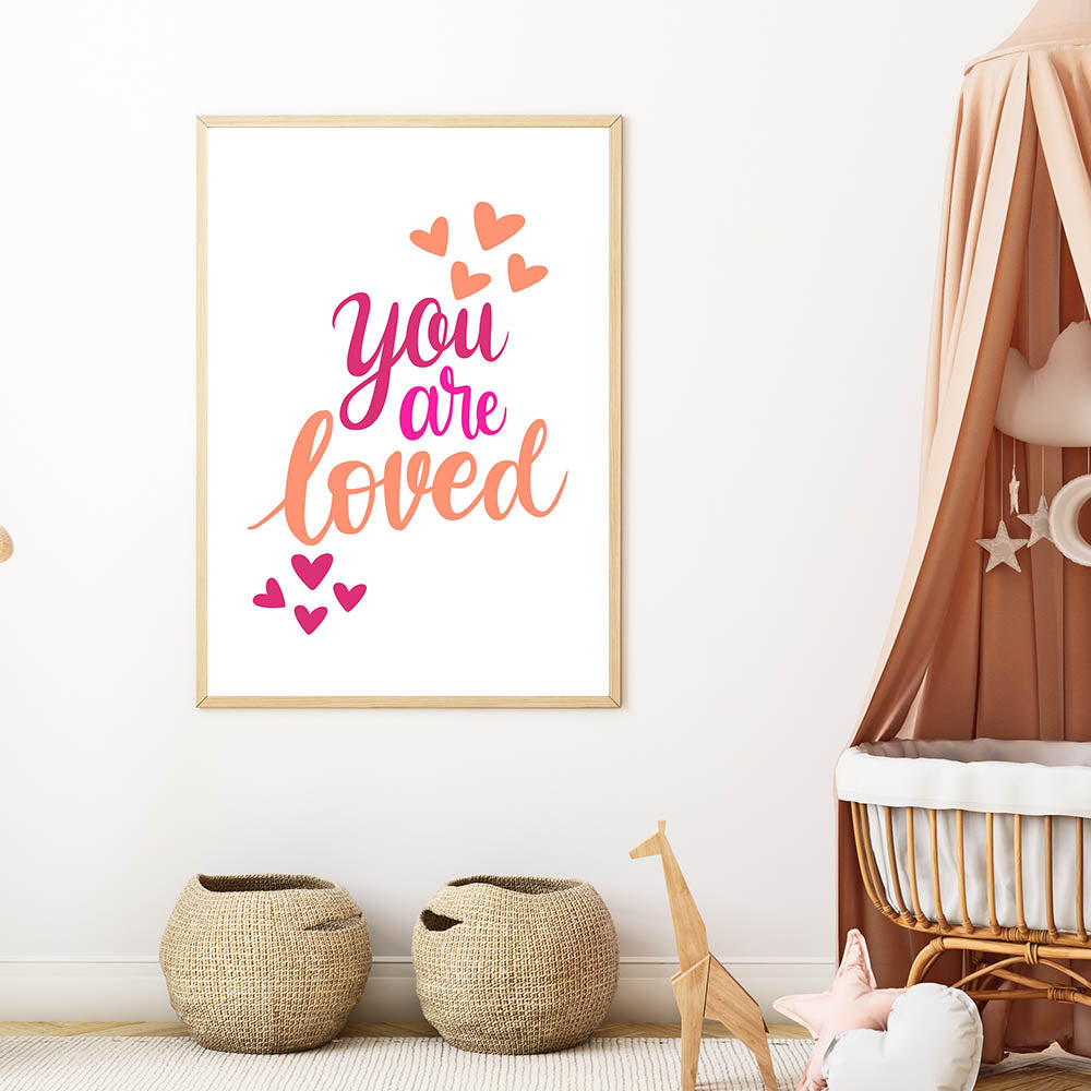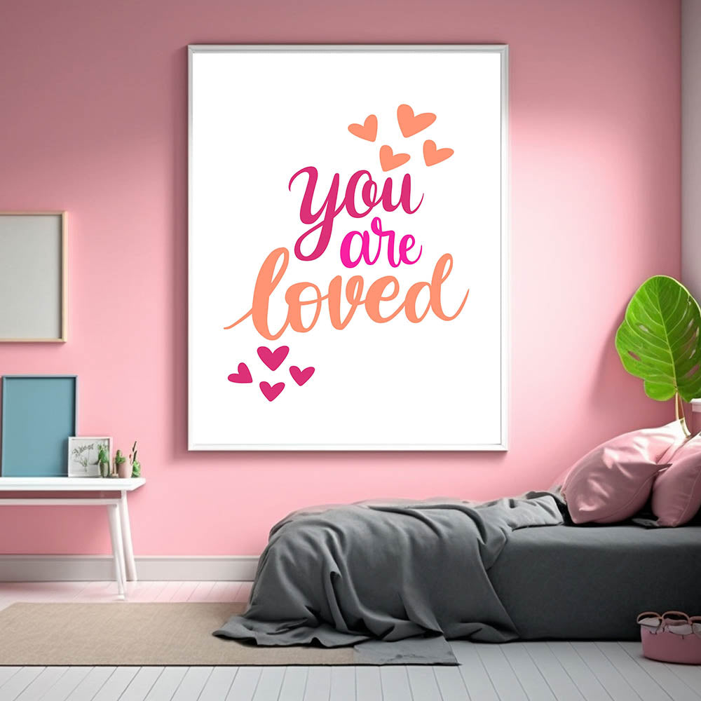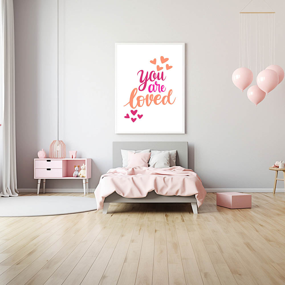 Add warmth and positivity to your child's space with this inspiring "You Are Loved" wall art, perfect for nurseries, girls' bedrooms, and playrooms. Featuring elegant hand-lettering in shades of pink, fuchsia, and orange with playful heart accents, this artwork radiates joy and love. The clean white background enhances the vibrant colors, making it an eye-catching yet soothing piece.