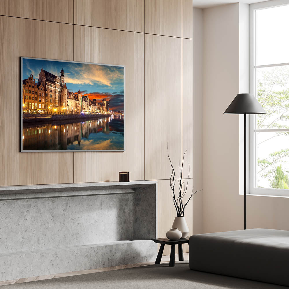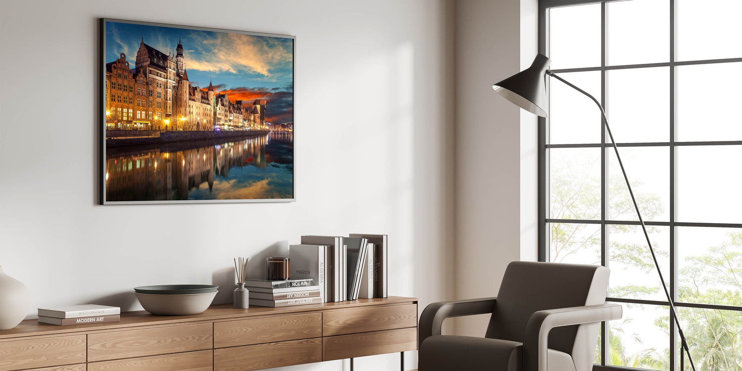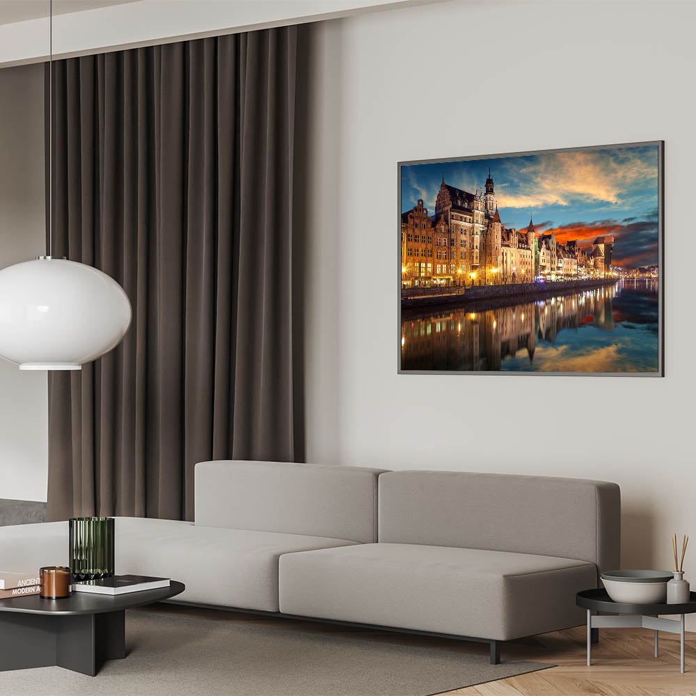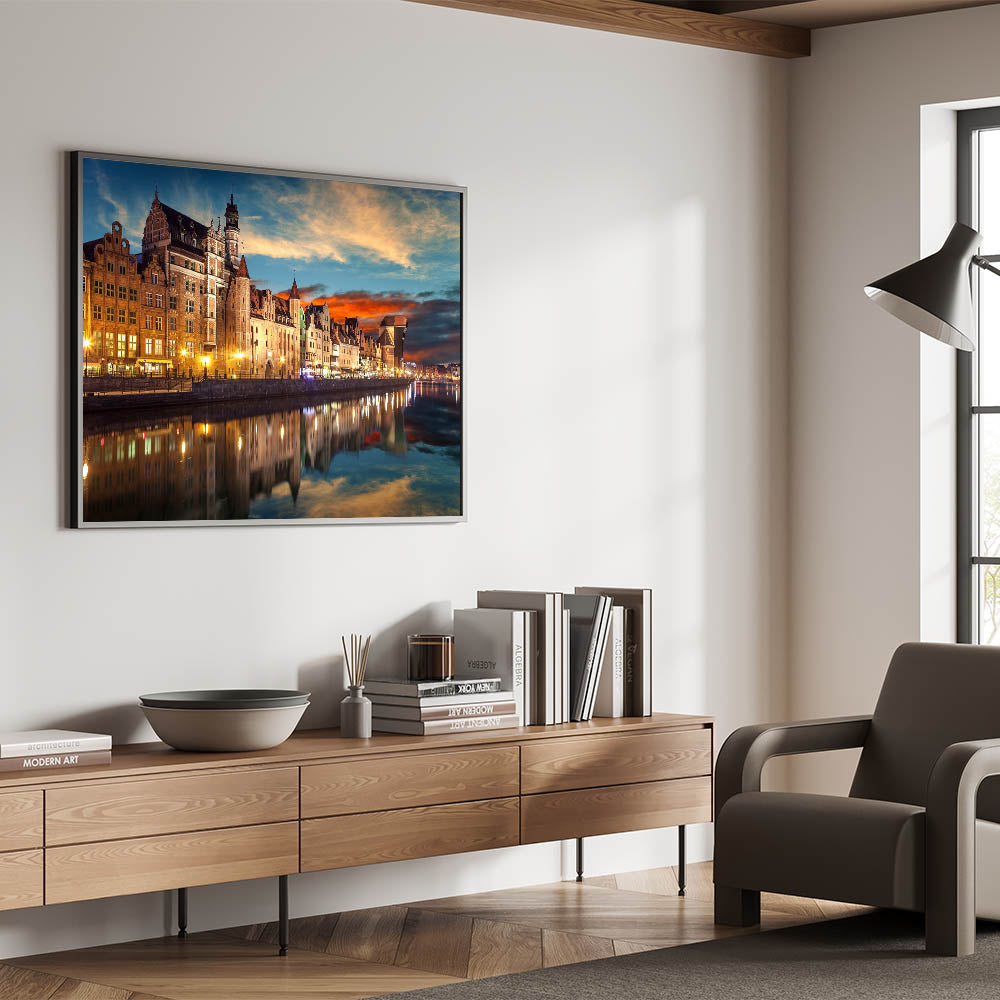 Experience the beauty of Poland with this stunning Gdańsk cityscape print, showcasing the iconic architecture of this historic city. Captured at sunset, the vibrant sky reflects off the peaceful water, highlighting the charm and elegance of Gdańsk’s renowned waterfront. Perfect for lovers of Polish architecture, this artwork brings a touch of Polish culture and serene beauty into your home.