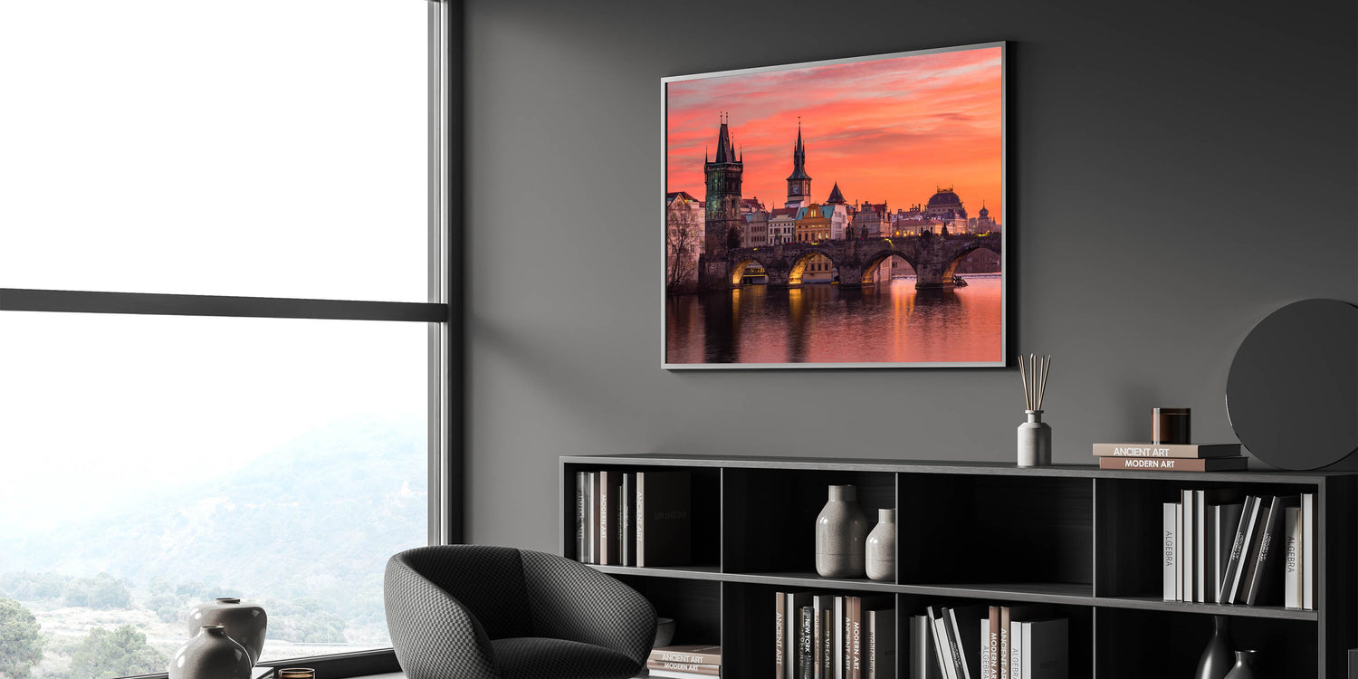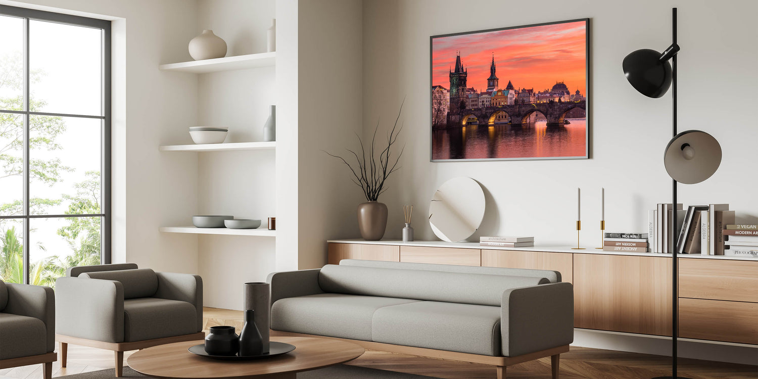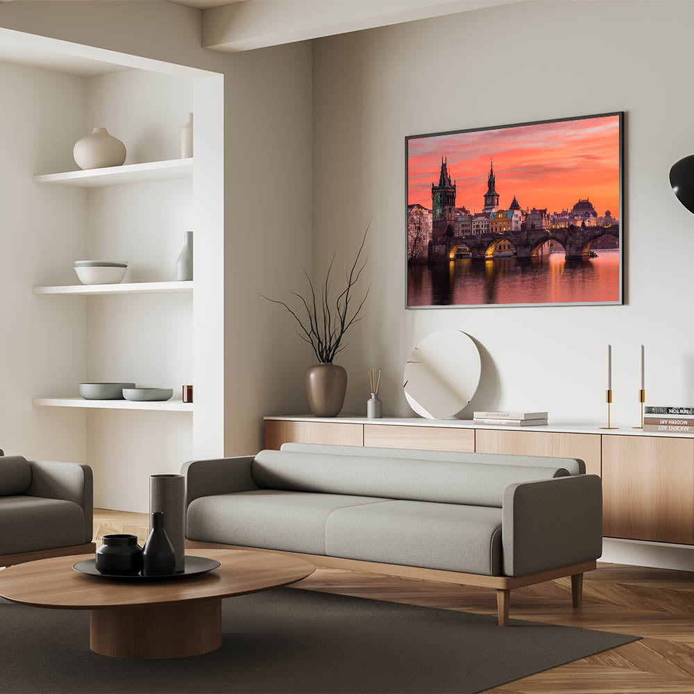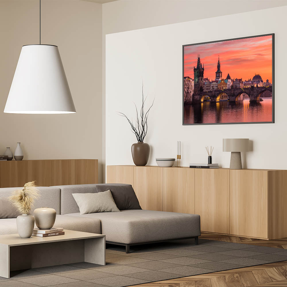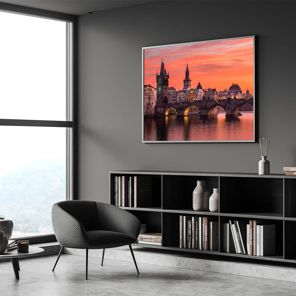 Step into the vibrant sunset hues of our "Enchanting Evening Cityscape" print, capturing Prague's majestic silhouette against a backdrop of fiery skies. This wall art showcases a panoramic view of the iconic Charles Bridge and surrounding historical buildings, bathed in the golden light of dusk.