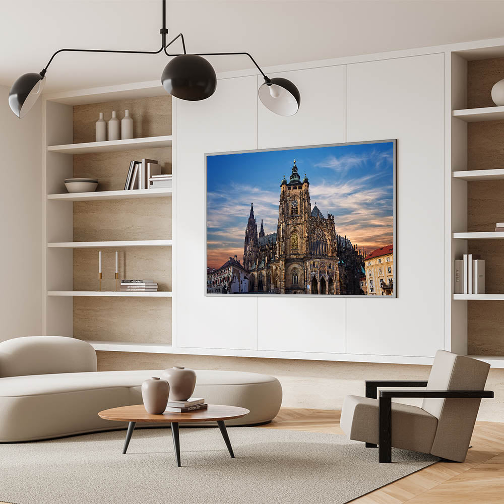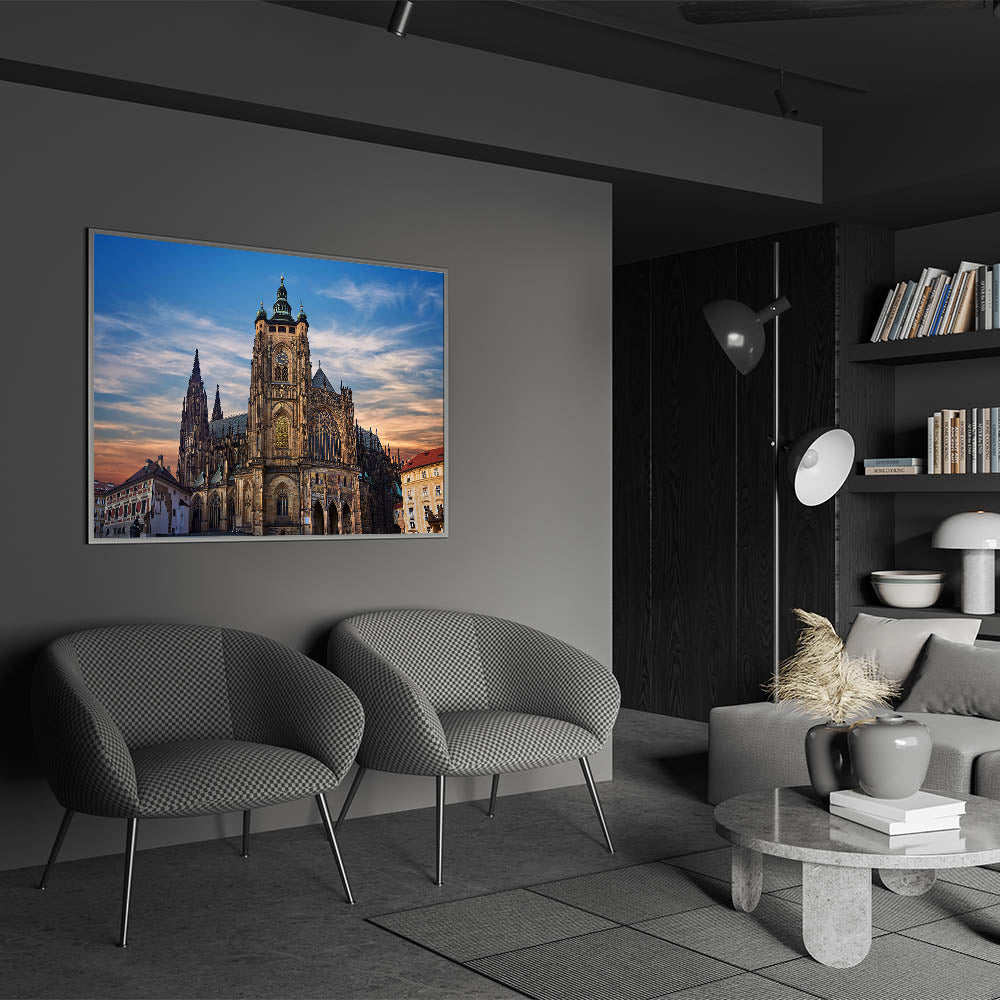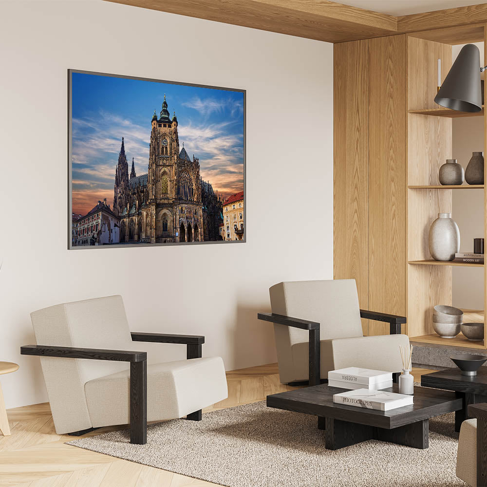 Our "Majestic Cathedral at Sunset" print captures the stunning architectural splendor of one of Prague’s most iconic landmarks. This breathtaking image features the cathedral's intricate facades and soaring spires silhouetted against a softly lit evening sky, providing a dramatic and spiritual ambiance.