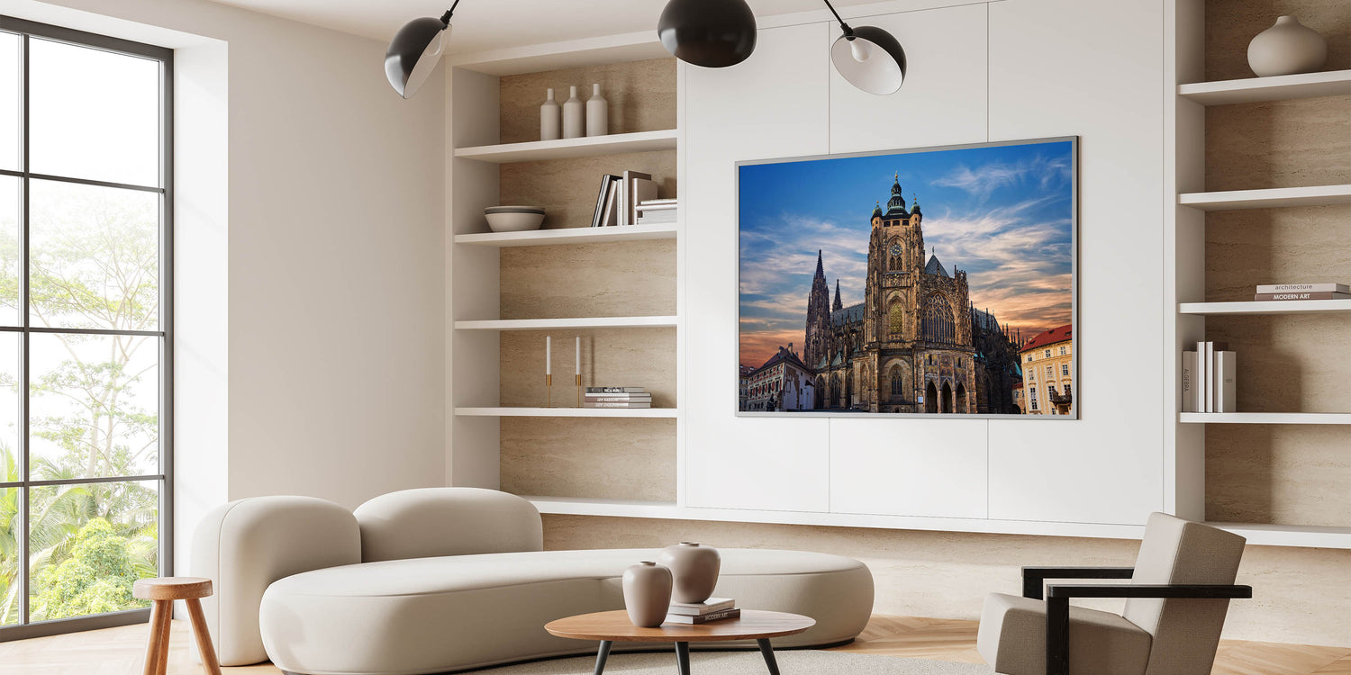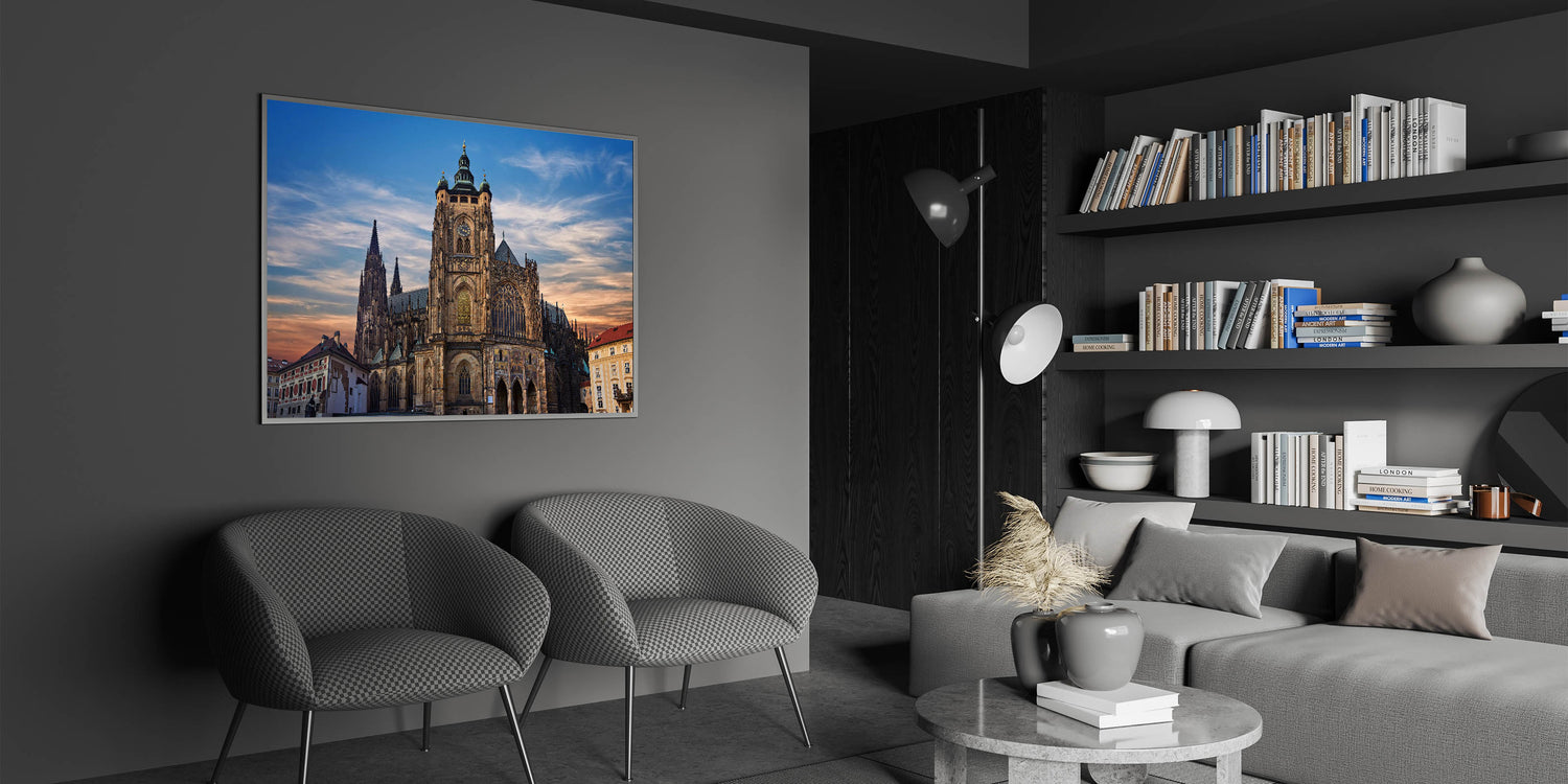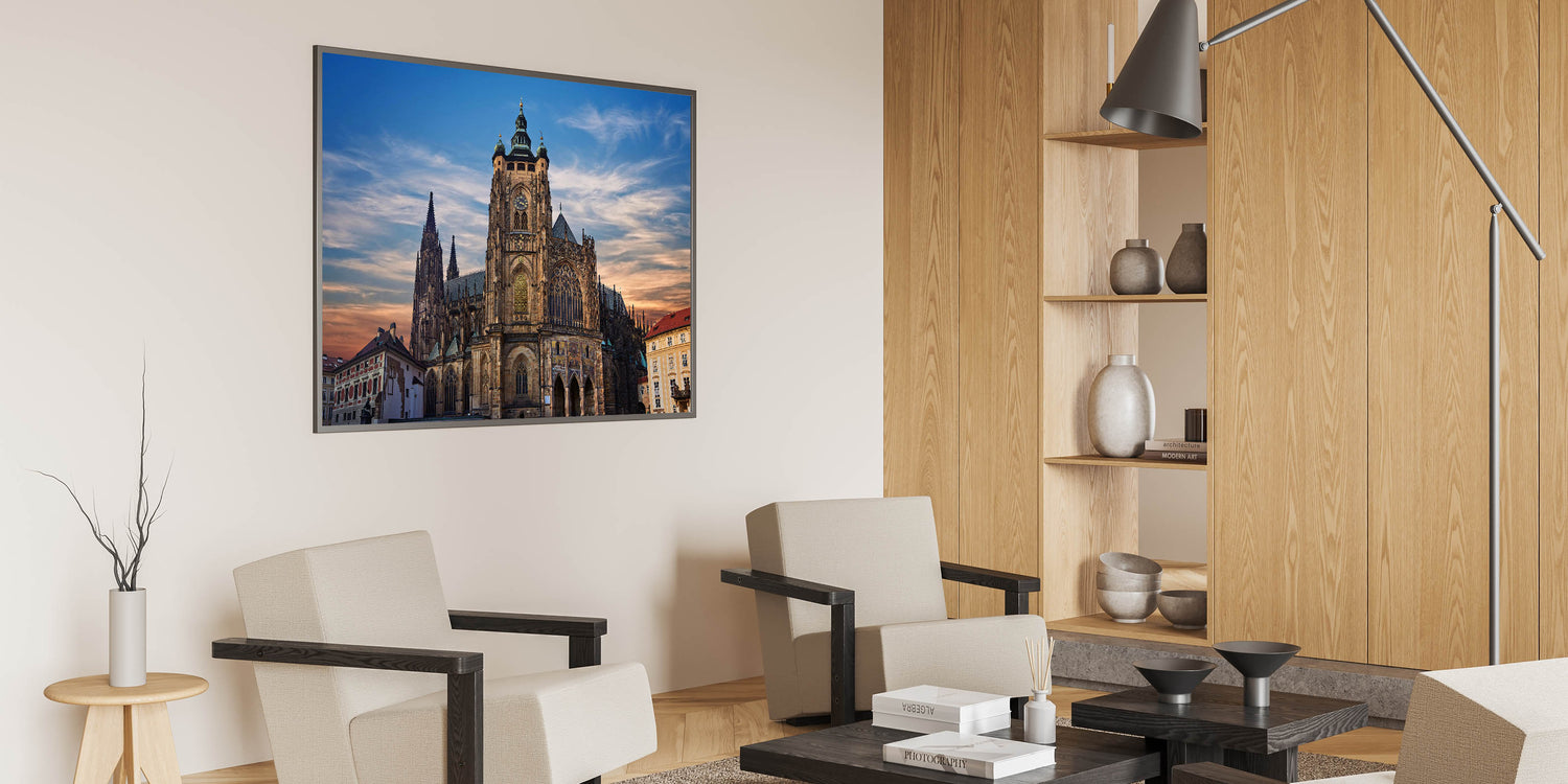 Our "Majestic Cathedral at Sunset" print captures the stunning architectural splendor of one of Prague’s most iconic landmarks. This breathtaking image features the cathedral's intricate facades and soaring spires silhouetted against a softly lit evening sky, providing a dramatic and spiritual ambiance.