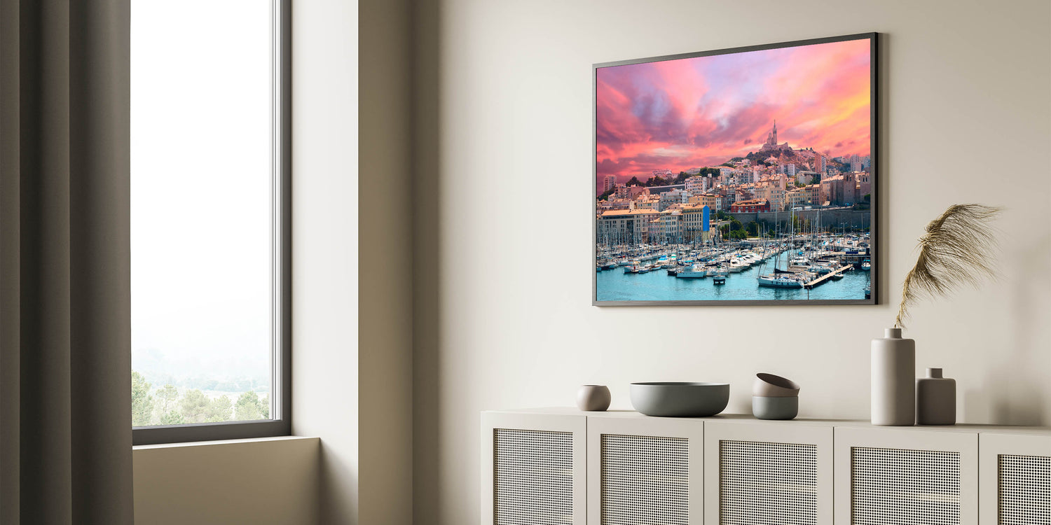 - High-resolution print of a Provence harbor at sunset with the city skyline