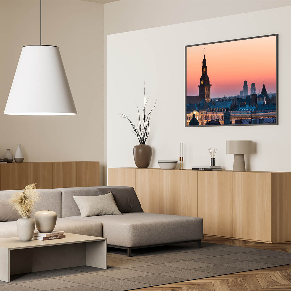 Capture the elegance of Riga’s cityscape with this stunning piece of Riga cityscape art. As the sun sets behind the historic skyline, the vibrant colors blend beautifully with the iconic architecture, making this artwork a perfect addition to any room. The detailed depiction of Riga’s towers and buildings against the glowing sky brings a touch of the Baltic region to your home.