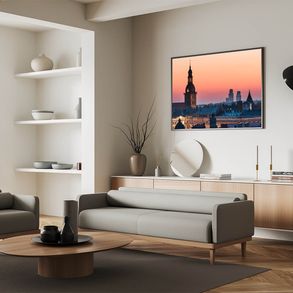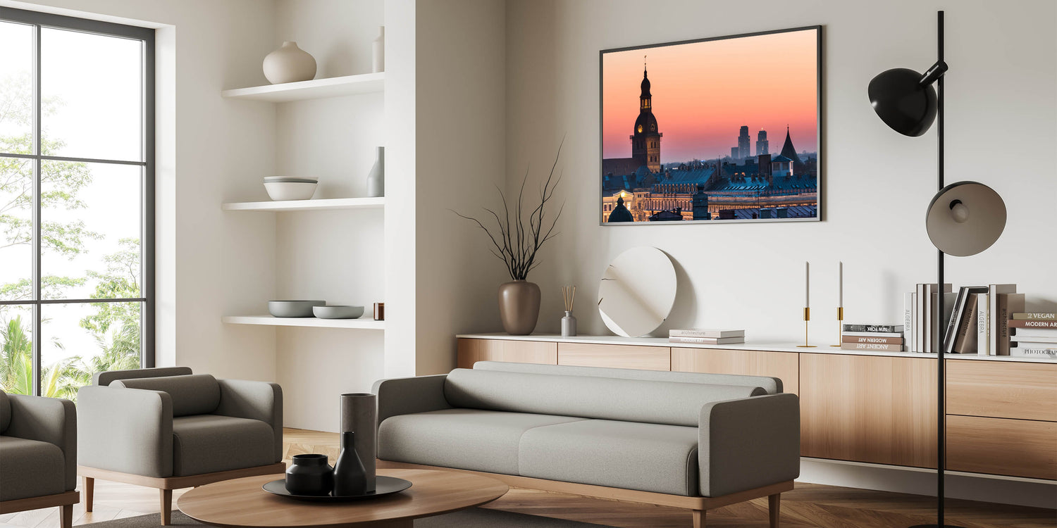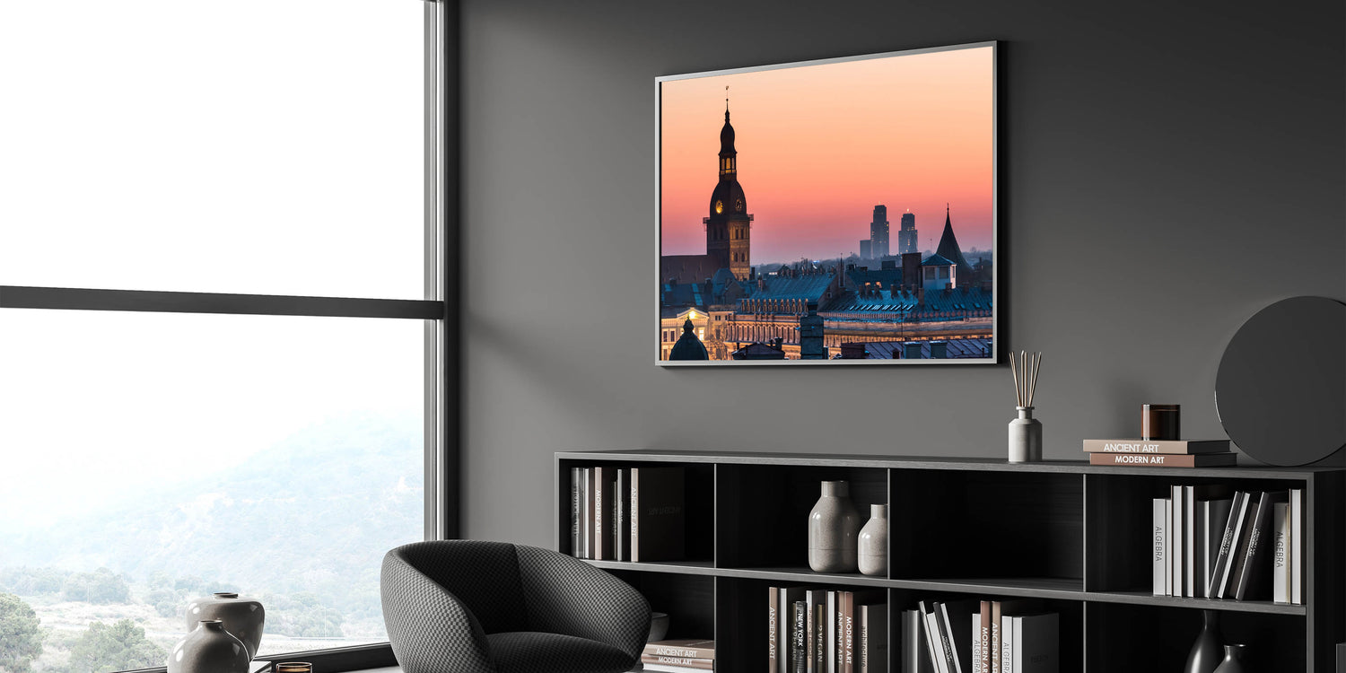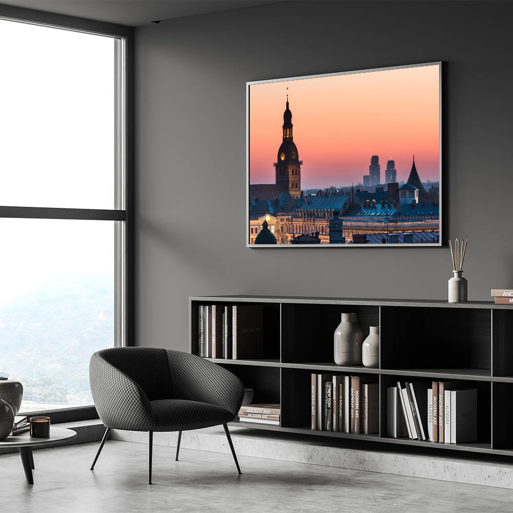 - Offers high-quality Latvia prints of the Riga cityscape at sunset.