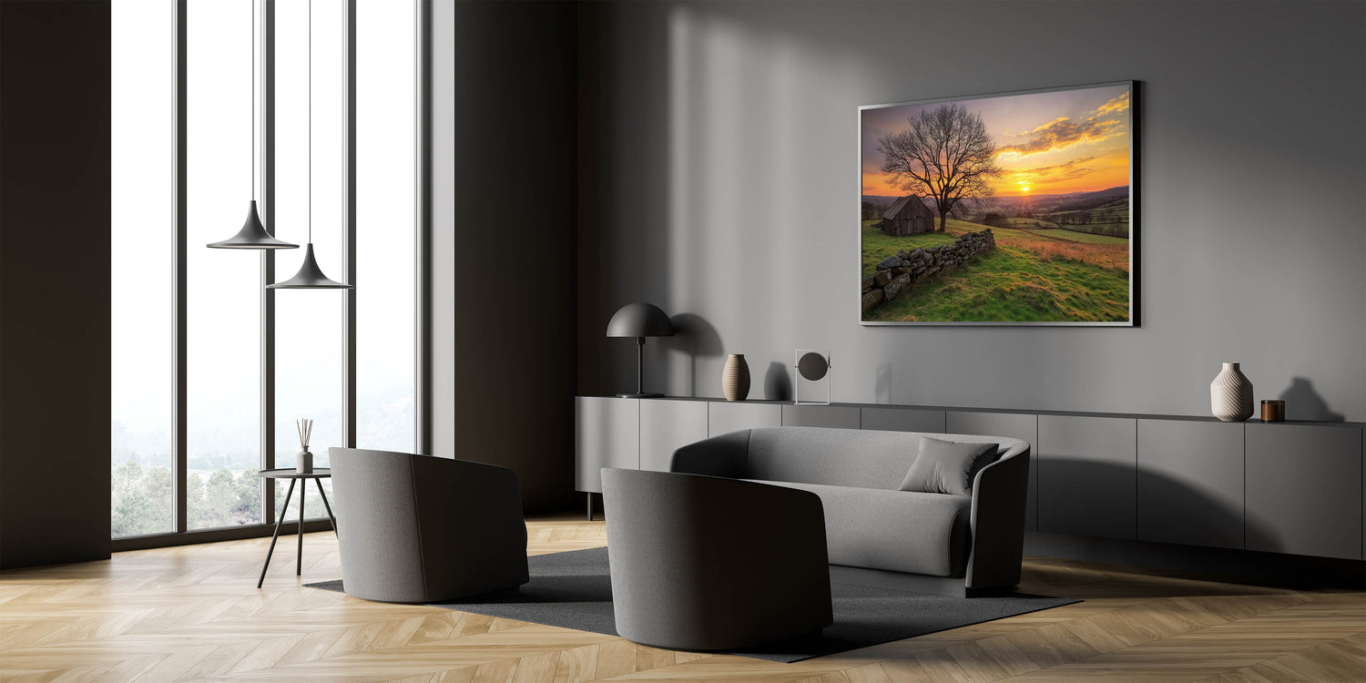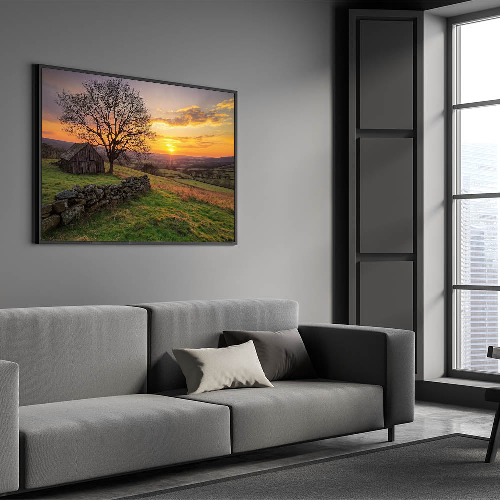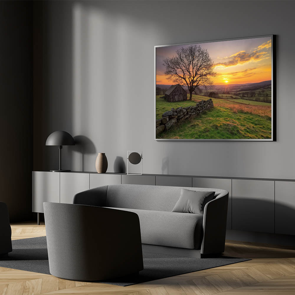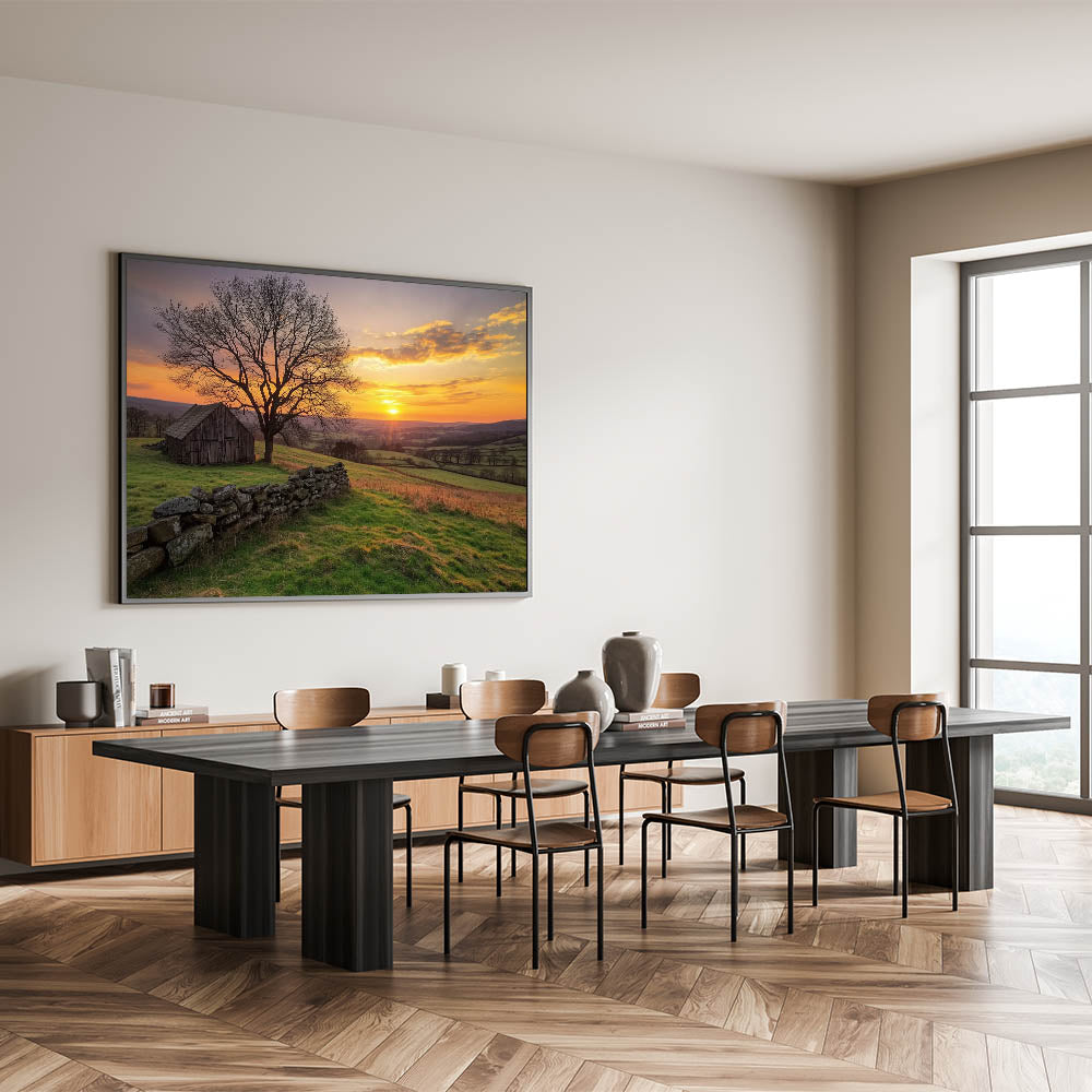 Capture the breathtaking beauty of a countryside sunset with this rustic barn wall art. This photograph features a weathered wooden barn, a bare tree silhouetted against the golden glow of the setting sun, and a stone wall leading into rolling green hills. The vibrant hues of the sunset and the lush landscape create a tranquil and timeless atmosphere, perfect for farmhouse or rustic-inspired interiors.