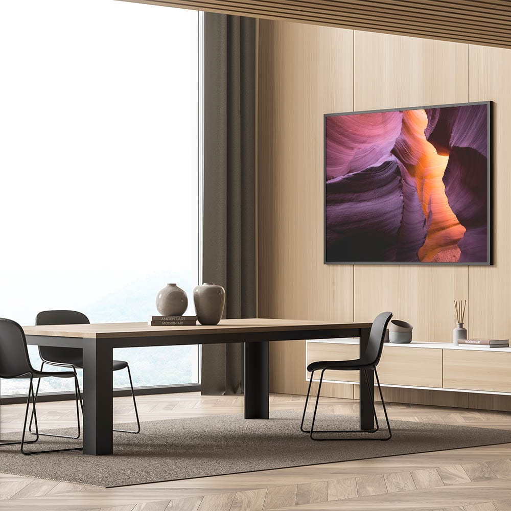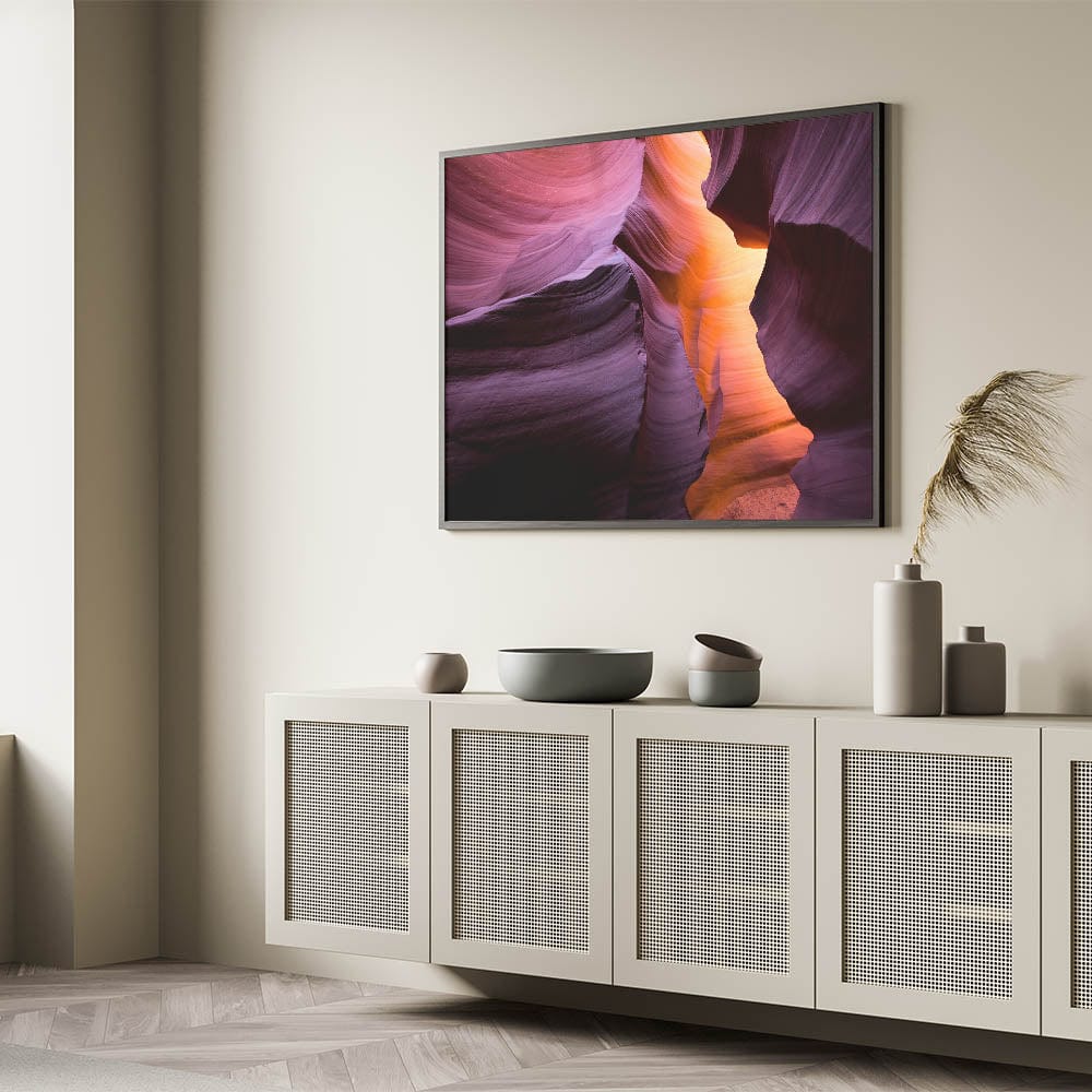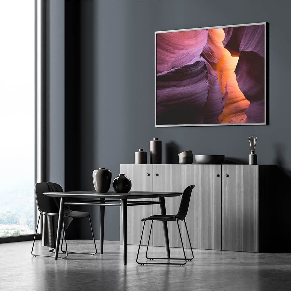 Immerse yourself in the beauty of nature with this striking fine art photography canvas print. Capturing the breathtaking curves of a sandstone canyon, this piece showcases vibrant orange and deep violet tones illuminated by natural light. The smooth, flowing rock formations create a mesmerizing contrast, making this artwork an extraordinary addition to any space.