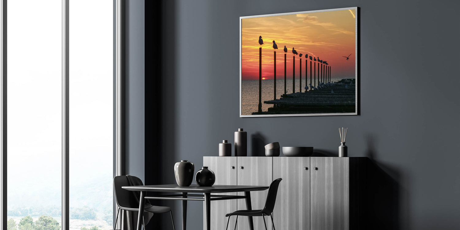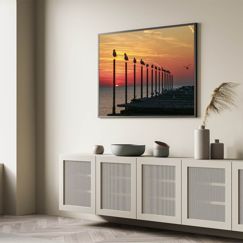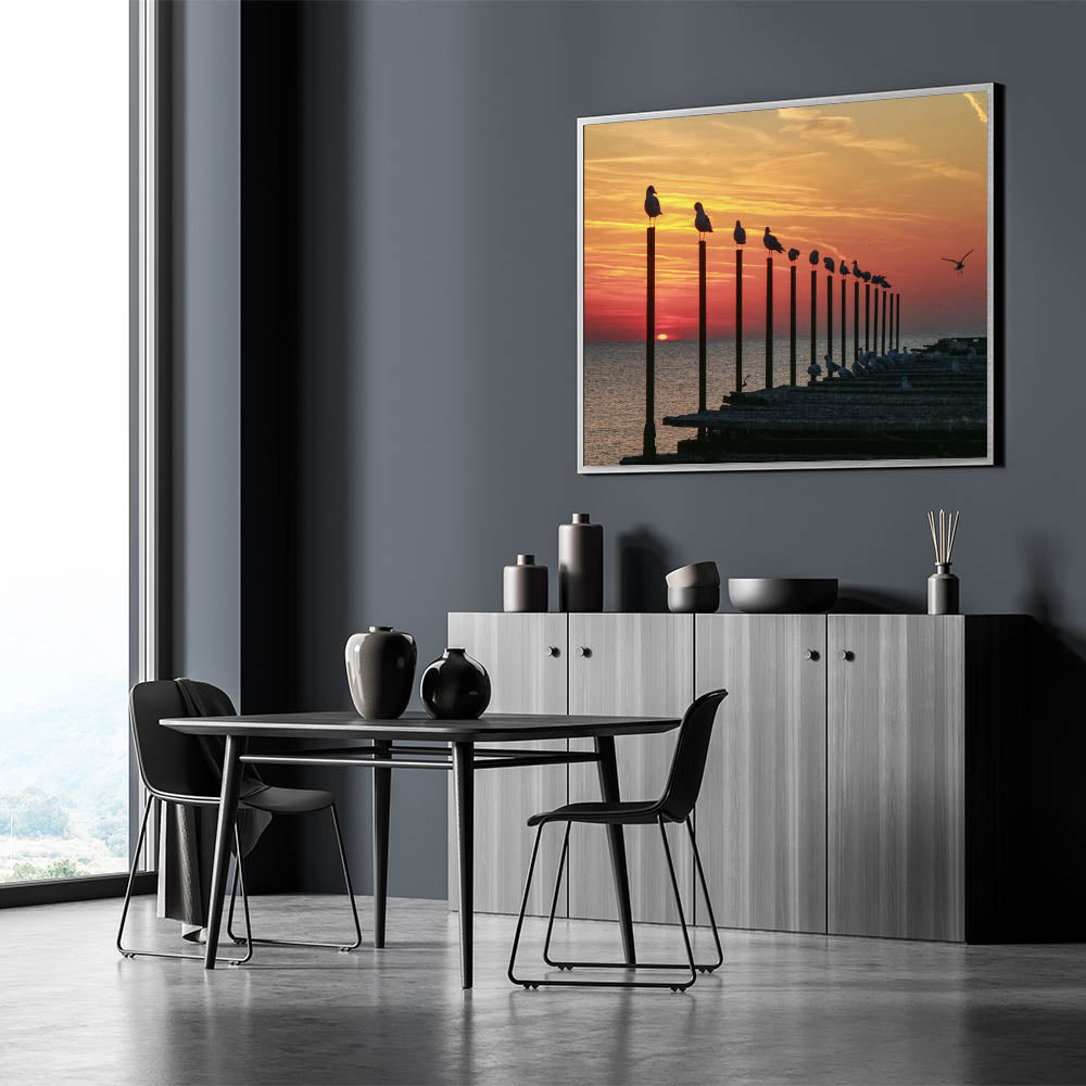 • Vibrant Colors: The artwork vividly displays the rich, warm hues of the sunset, perfectly contrasting with the silhouetted seagulls.