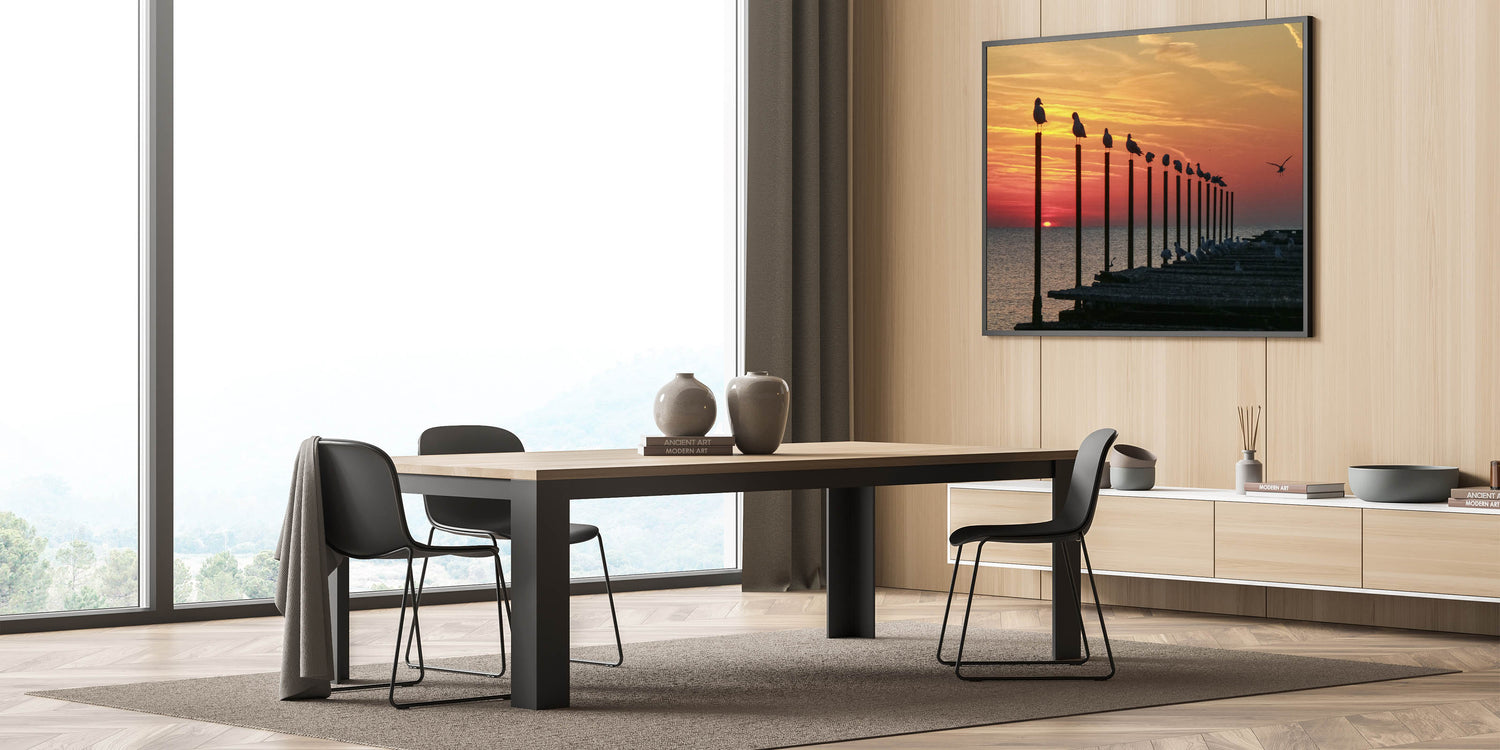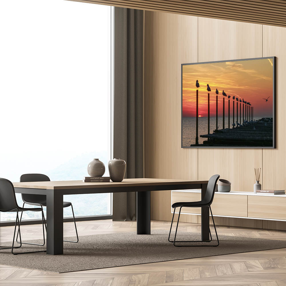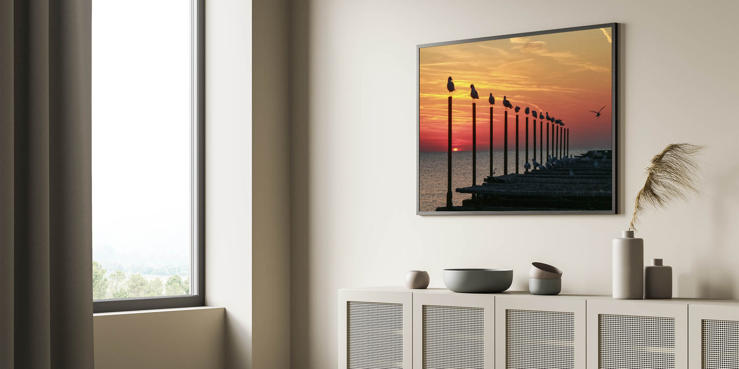 • Vibrant Colors: The artwork vividly displays the rich, warm hues of the sunset, perfectly contrasting with the silhouetted seagulls.