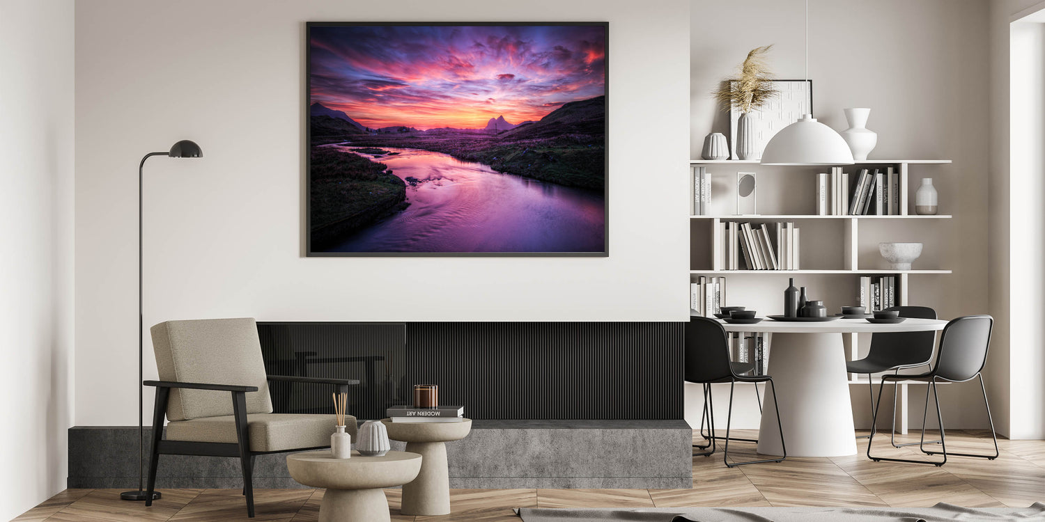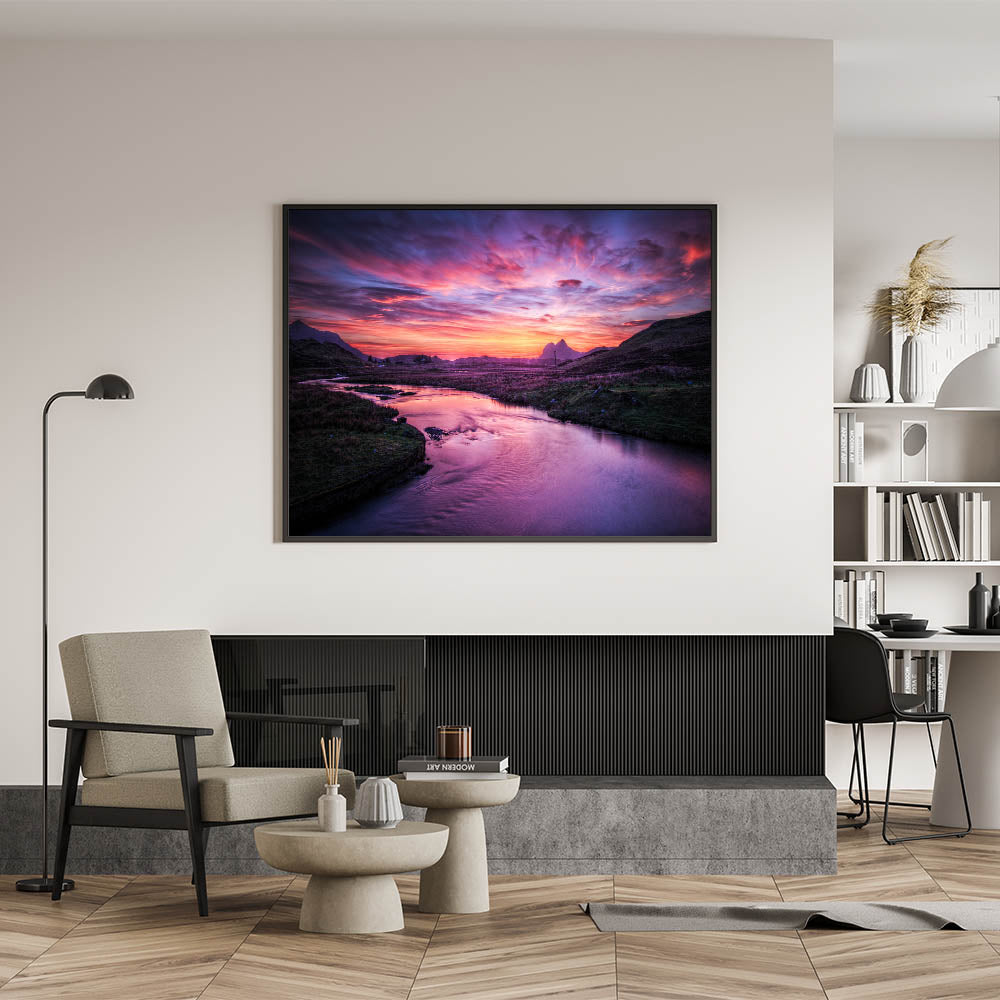 This mesmerizing Scenic Scotland Print captures the vibrant beauty of a Scottish Highlands sunset. The sky is ablaze with shades of purple, pink, and orange, reflecting on the gentle waters below. This captivating piece of Stunning Scotland Wall Art brings the tranquility and grandeur of Scotland’s natural beauty into any space, making it perfect for nature lovers and admirers of Beautiful Scottish Landscapes.
