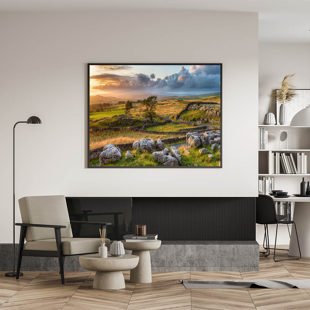 Immerse yourself in the tranquility of the countryside with this breathtaking wall art. The design captures a serene rural landscape, featuring rolling hills, winding stone walls, and a peaceful sunset. This artwork is perfect for those who appreciate the beauty of nature and want to bring a sense of calm and serenity into their living space.