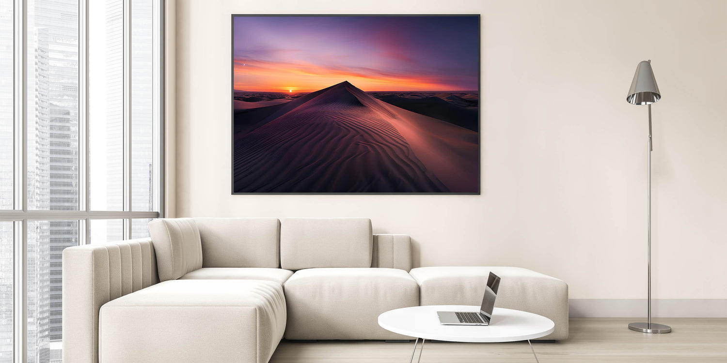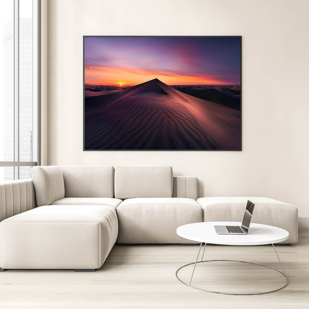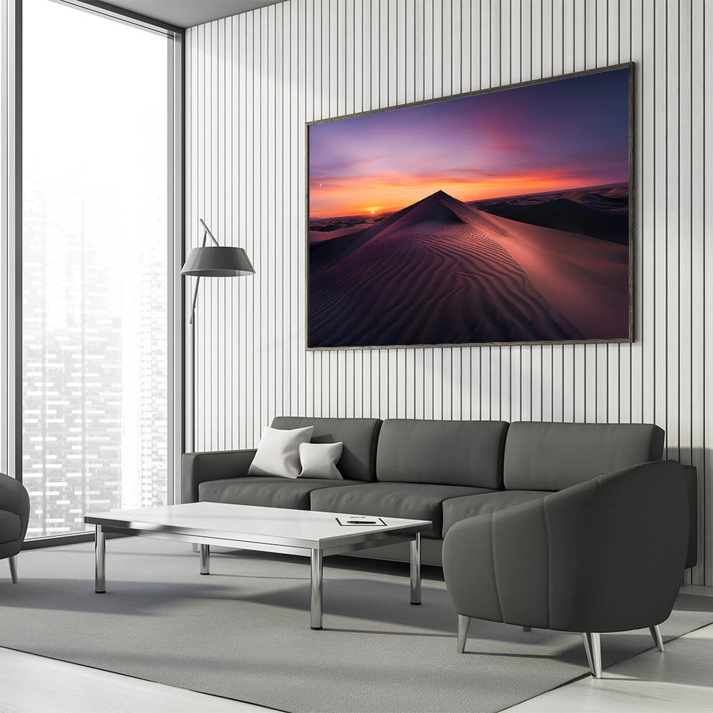 Embrace the peaceful beauty of the desert with this elegant wall art, showcasing a serene sunrise over the sand dunes. The soft gradient of colors from deep purples to warm oranges perfectly captures the tranquility of the early morning light as it gently illuminates the rolling dunes. This stunning piece is ideal for bringing a calming and sophisticated touch to any room in your home.