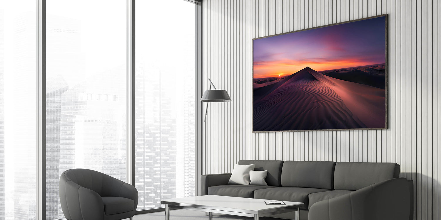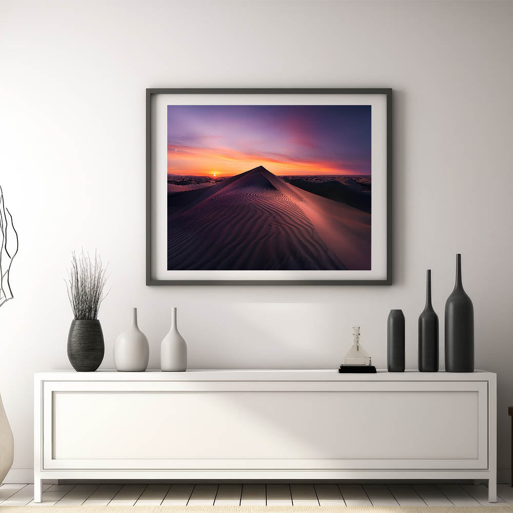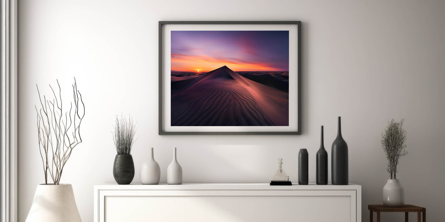 Embrace the peaceful beauty of the desert with this elegant wall art, showcasing a serene sunrise over the sand dunes. The soft gradient of colors from deep purples to warm oranges perfectly captures the tranquility of the early morning light as it gently illuminates the rolling dunes. This stunning piece is ideal for bringing a calming and sophisticated touch to any room in your home.