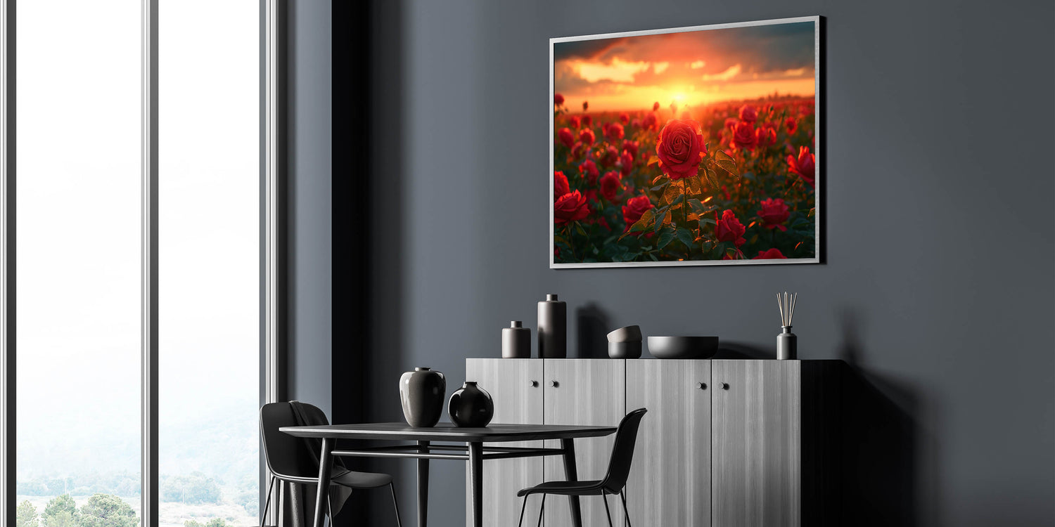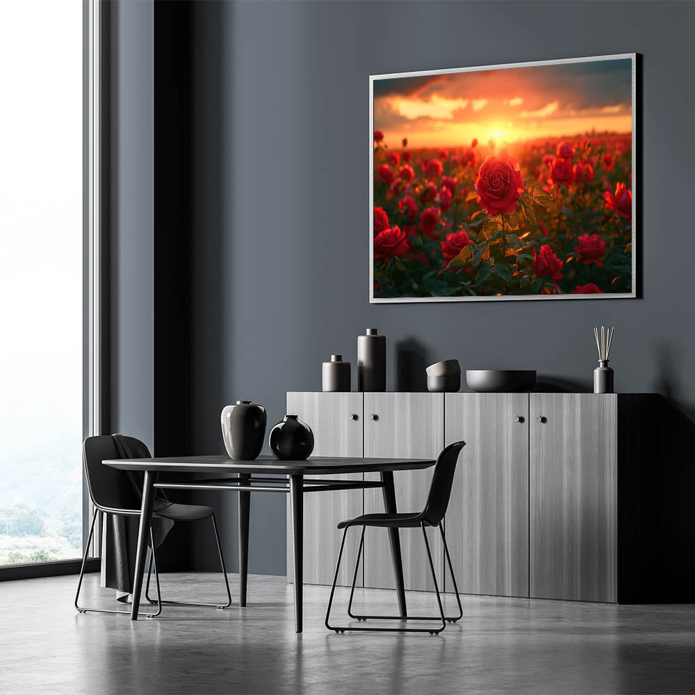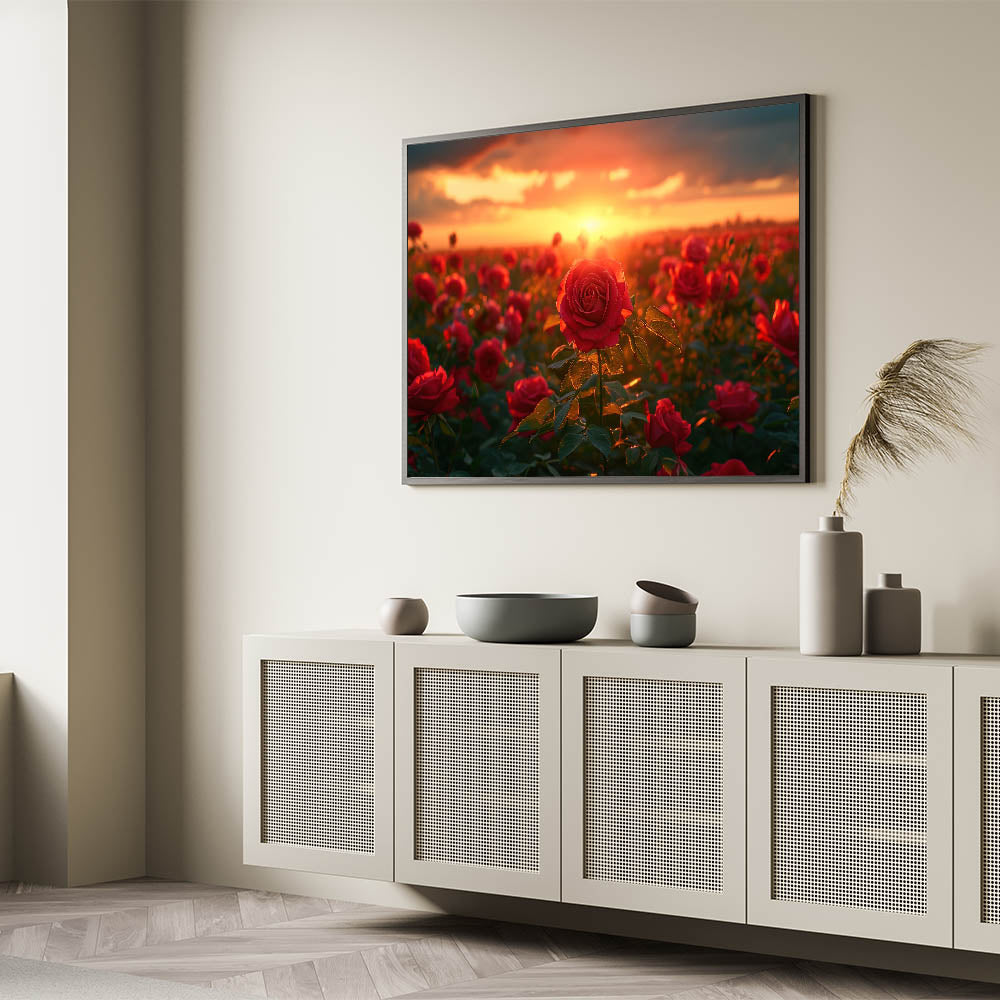 Immerse yourself in the captivating beauty of nature with this stunning Serene Fields Art Print. Featuring a vibrant field of roses bathed in the warm, golden glow of a setting sun, this artwork brings a sense of romance and tranquility to any space. The rich reds of the roses against the backdrop of a fiery sunset create a breathtaking scene that is both dramatic and serene.