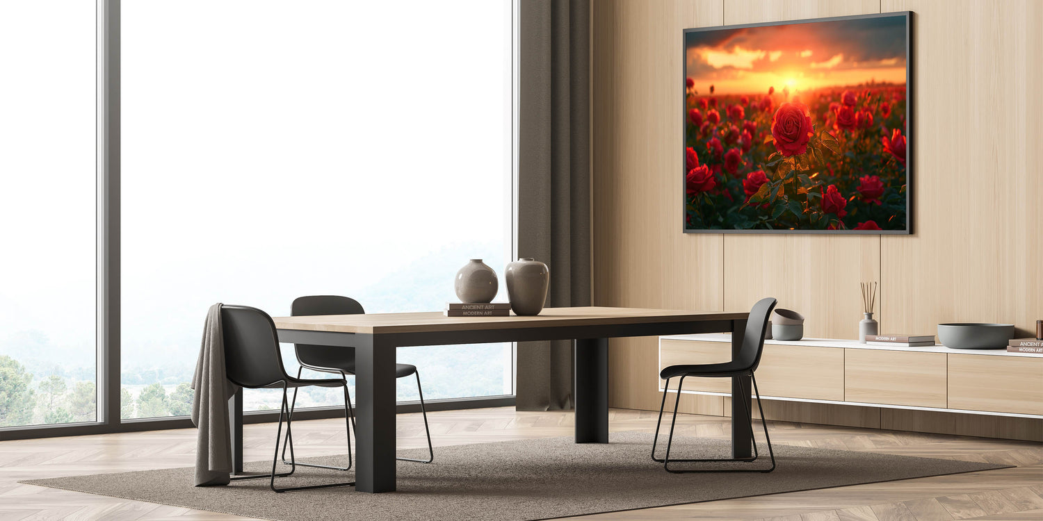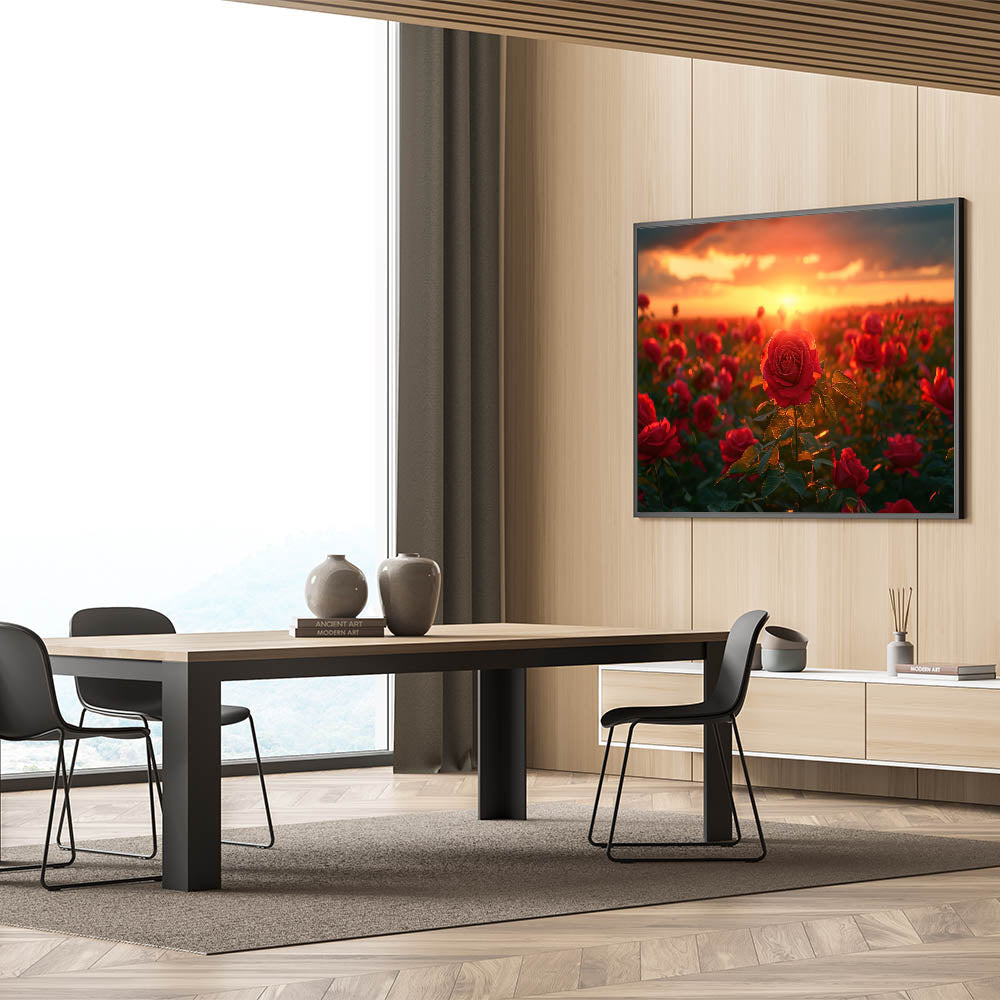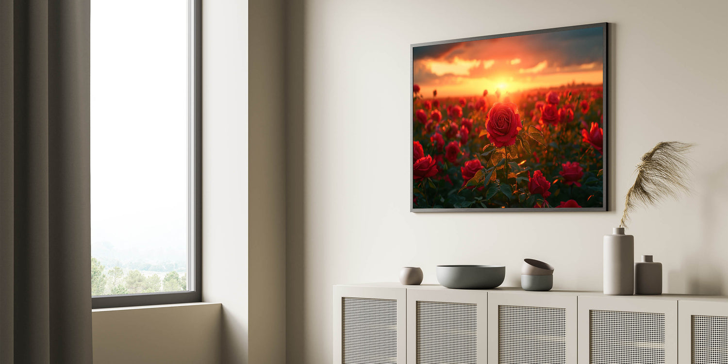 Immerse yourself in the captivating beauty of nature with this stunning Serene Fields Art Print. Featuring a vibrant field of roses bathed in the warm, golden glow of a setting sun, this artwork brings a sense of romance and tranquility to any space. The rich reds of the roses against the backdrop of a fiery sunset create a breathtaking scene that is both dramatic and serene.
