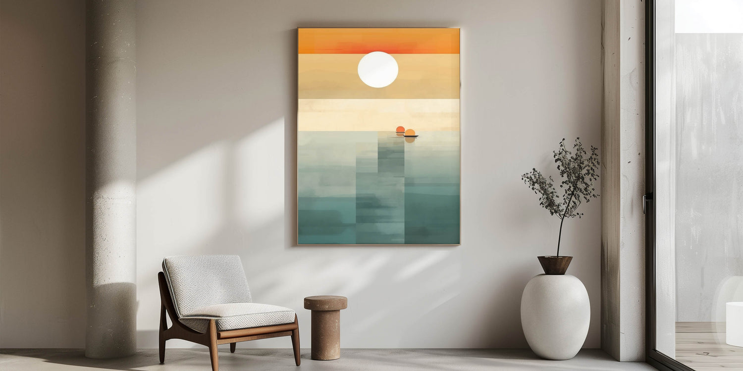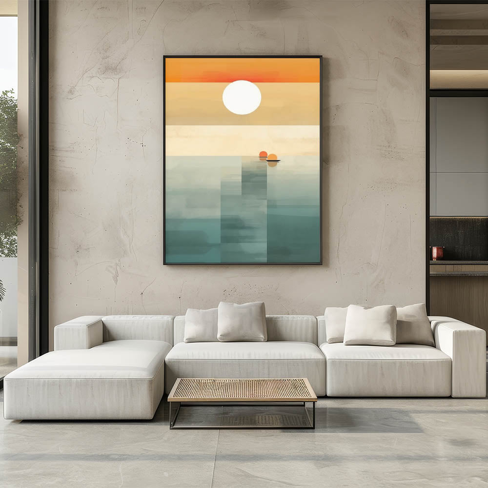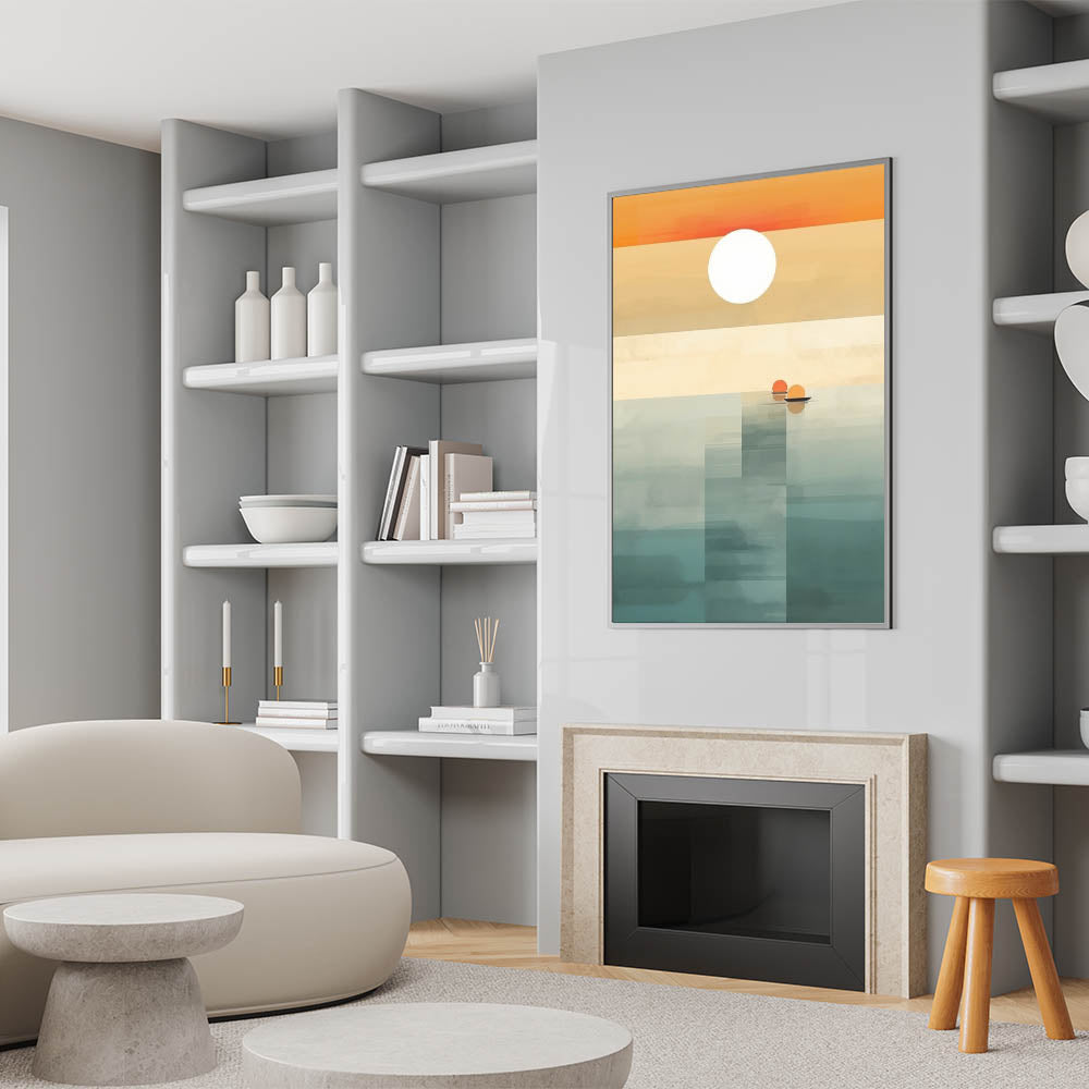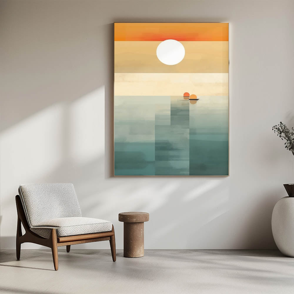 Capture the warmth of a breathtaking sunset with this serene landscape artwork, featuring a glowing sun over a tranquil water scene. The soft gradients of orange and green create a peaceful scenery framed art, bringing a sense of calm and balance to any space.