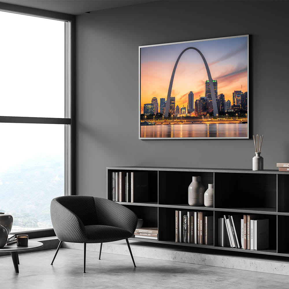 This artwork is a must-have for any lover of cityscapes and sunsets, bringing the tranquil and vibrant energy of St. Louis into your living space.