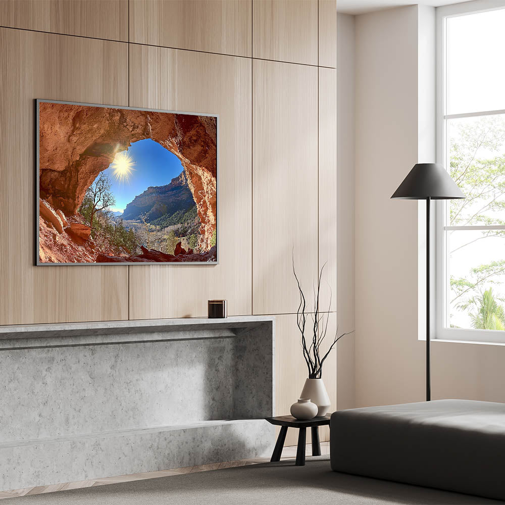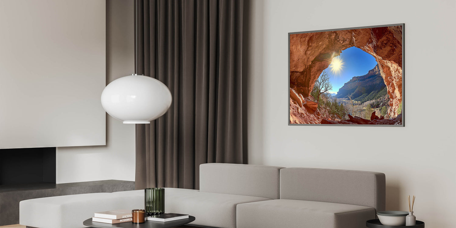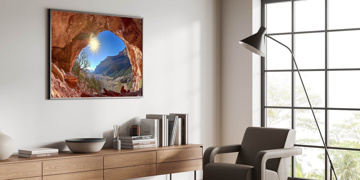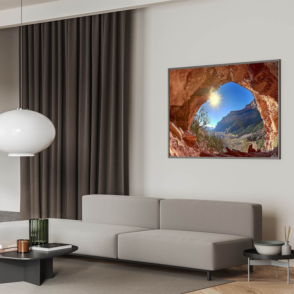 - Breathtaking Detail: High-resolution desert landscape photography brings the textures of the rocky cave and the vivid colors of the valley to life.