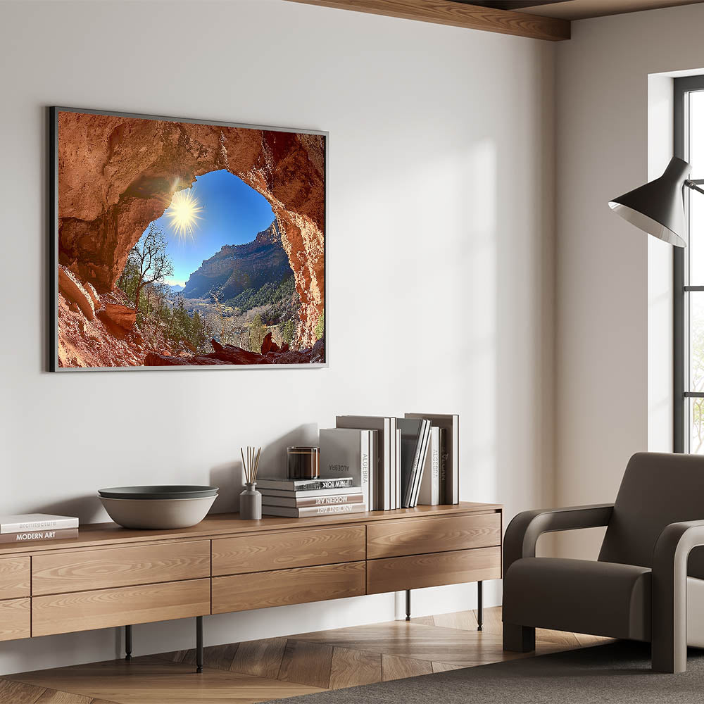 Illuminate your space with the Sunlit Desert Cave Wall Art. This striking artwork captures the glowing sunburst framed by rugged rock formations, overlooking a vibrant desert valley. A perfect representation of desert scenery prints, it evokes a sense of wonder and natural beauty, ideal for transforming your interior decor.