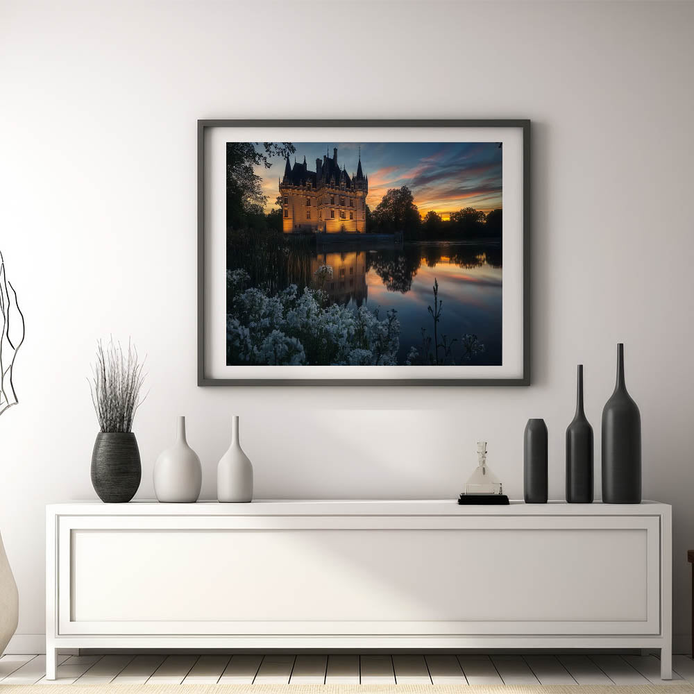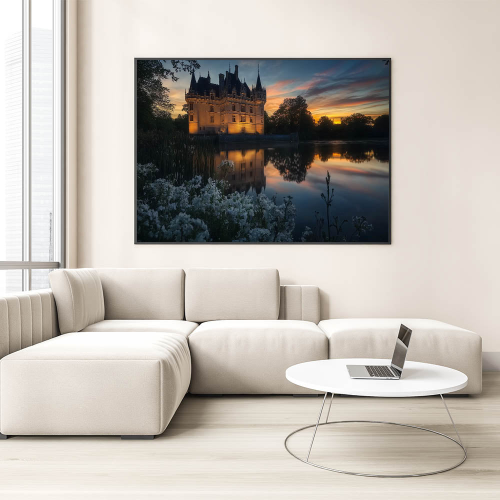 Immerse yourself in the enchanting beauty of this sunset castle wall art, featuring a majestic castle glowing warmly against the hues of a golden sunset. Perfectly mirrored in the tranquil waters and surrounded by blooming wildflowers, this breathtaking scene captures the essence of elegance and tranquility. The soft blend of vibrant colors in the sky and the castle’s illuminated facade creates a stunning focal point for any room.