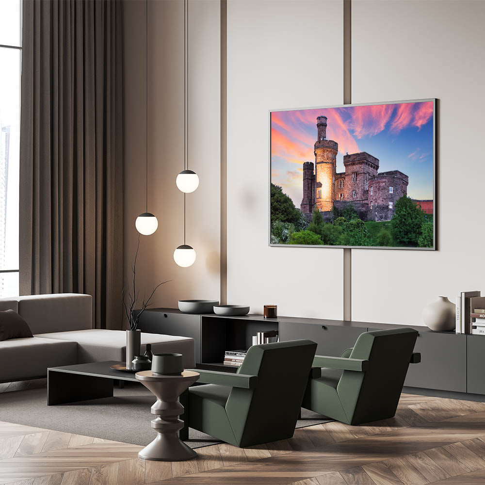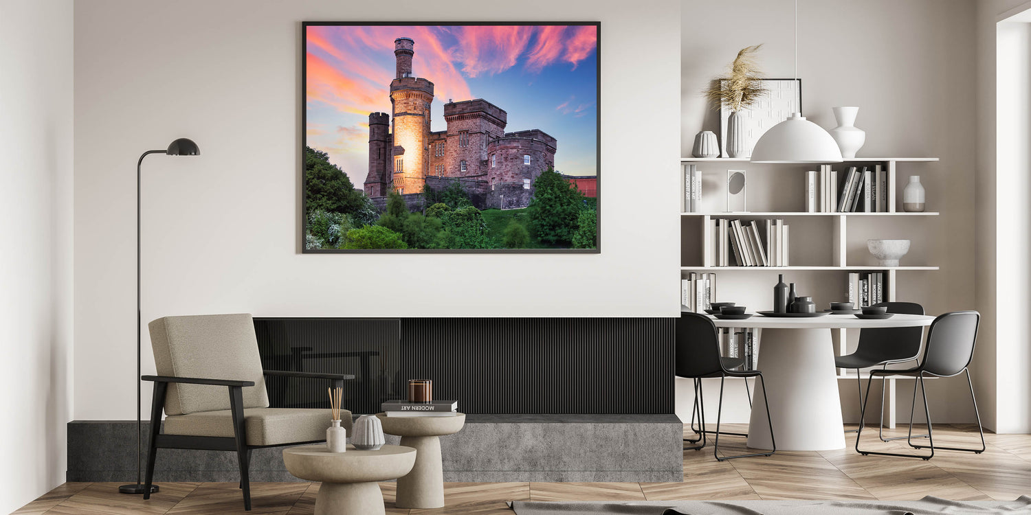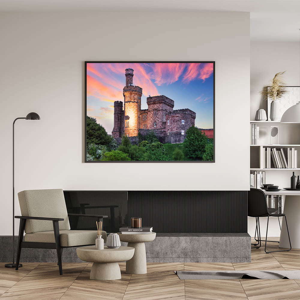 Experience the enchanting beauty of a historic castle illuminated under a stunning sunset with this vibrant wall art. The rich colors of the sky, combined with the warm glow highlighting the castle’s architecture, create a captivating scene that is both majestic and serene. Perfect for those who appreciate the grandeur of history, this artwork is an ideal addition to any room in need of a touch of elegance and warmth.