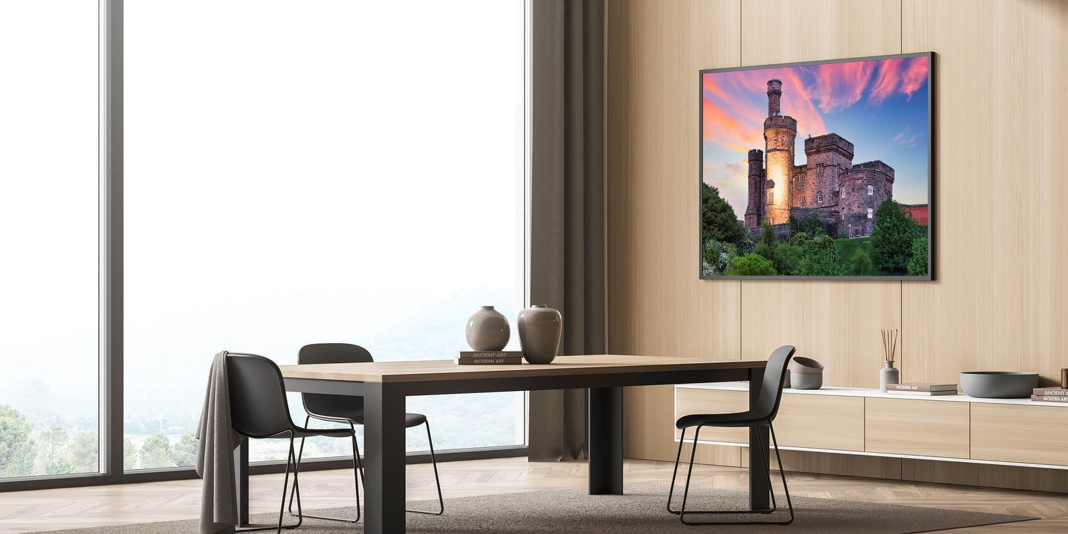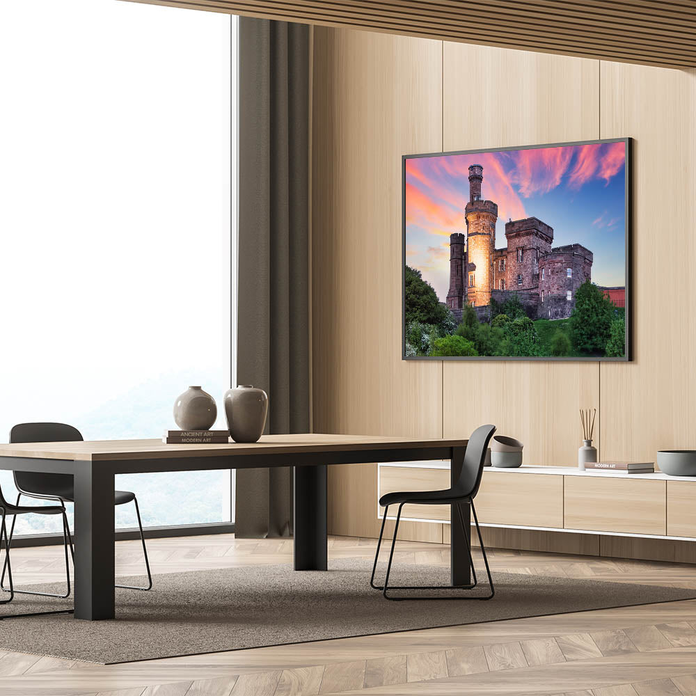 Elevate your space with this stunning castle wall art, showcasing the beauty of historic architecture bathed in the warm glow of a setting sun. This artwork is sure to be a conversation starter and a timeless addition to any art collection.