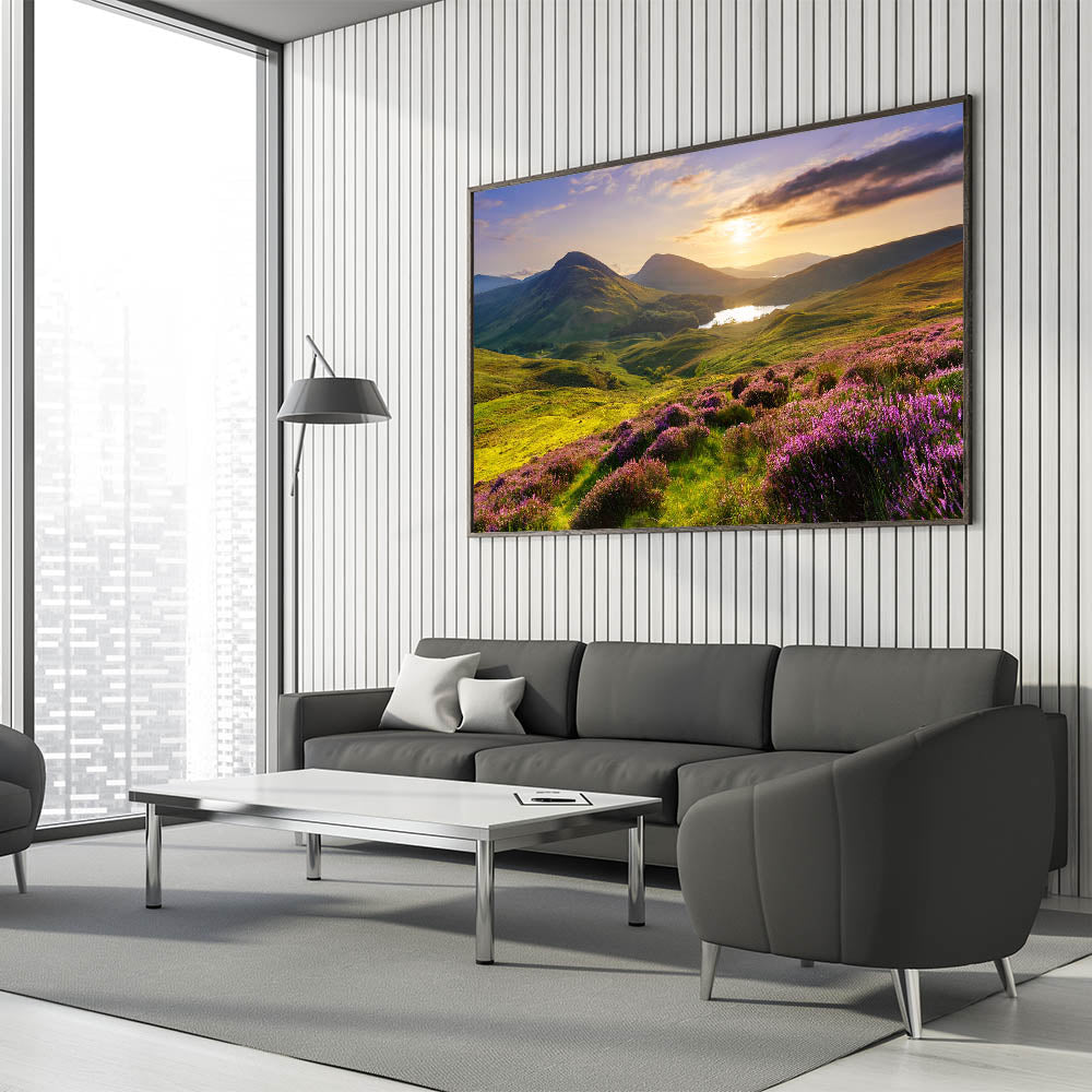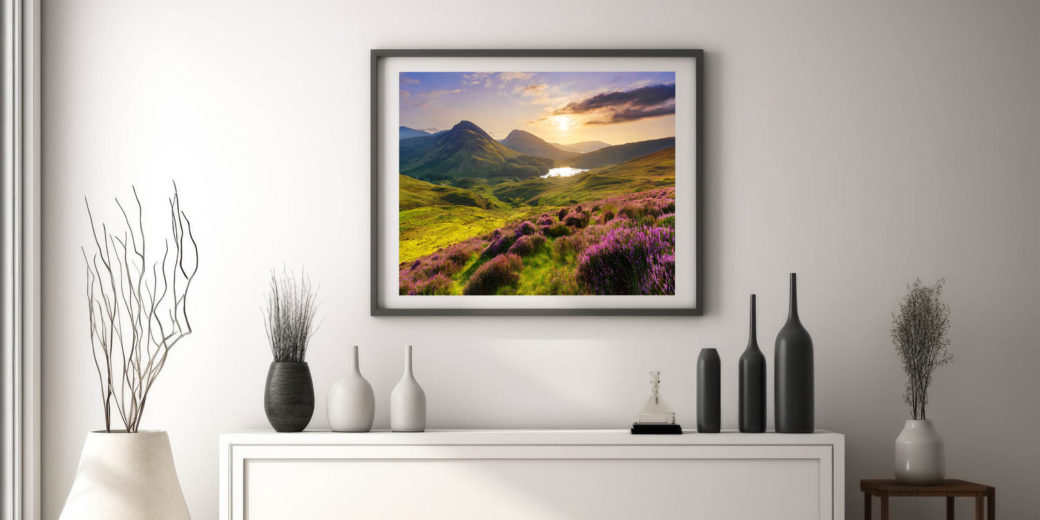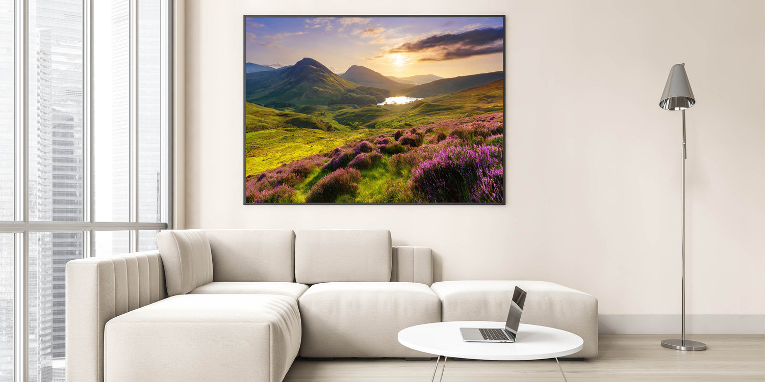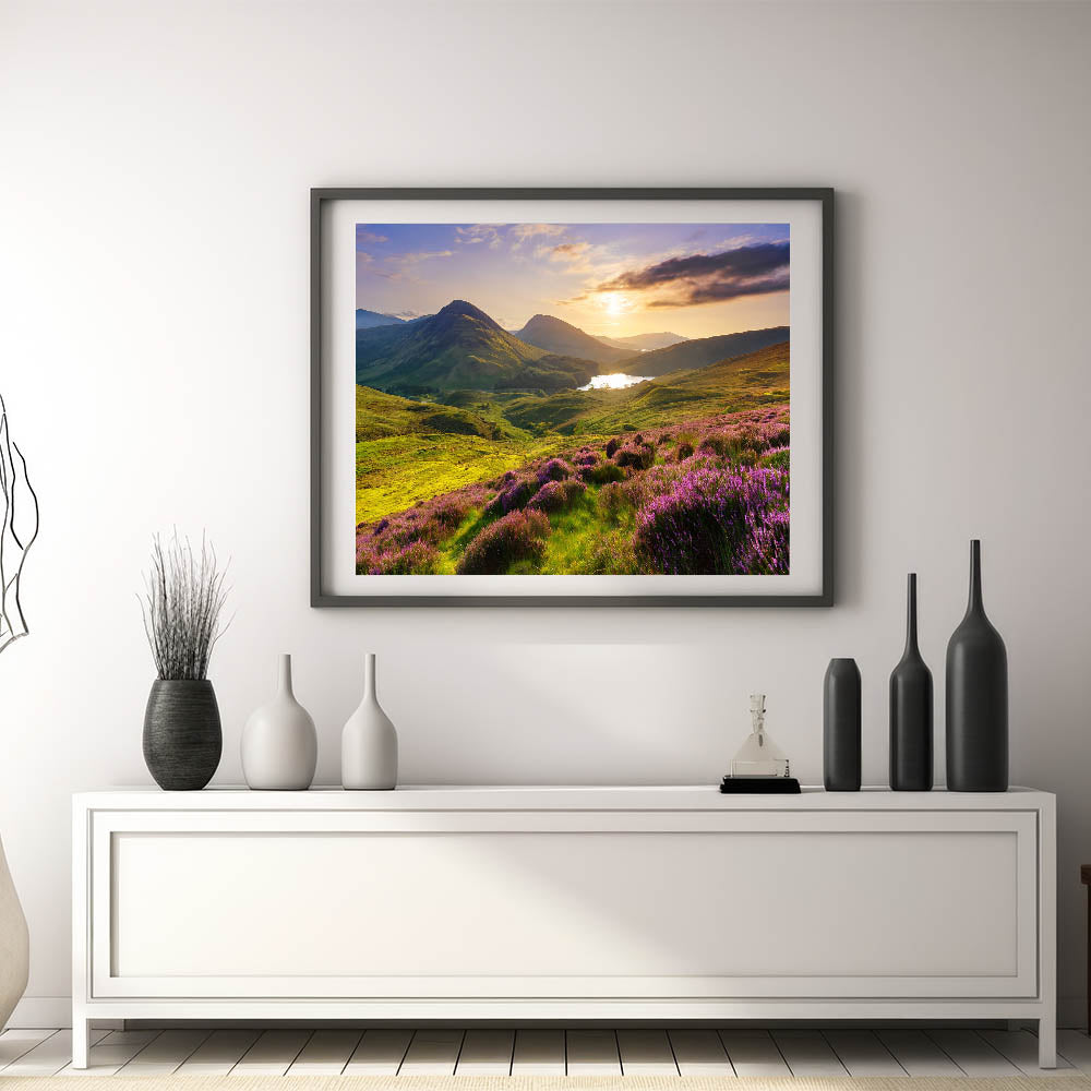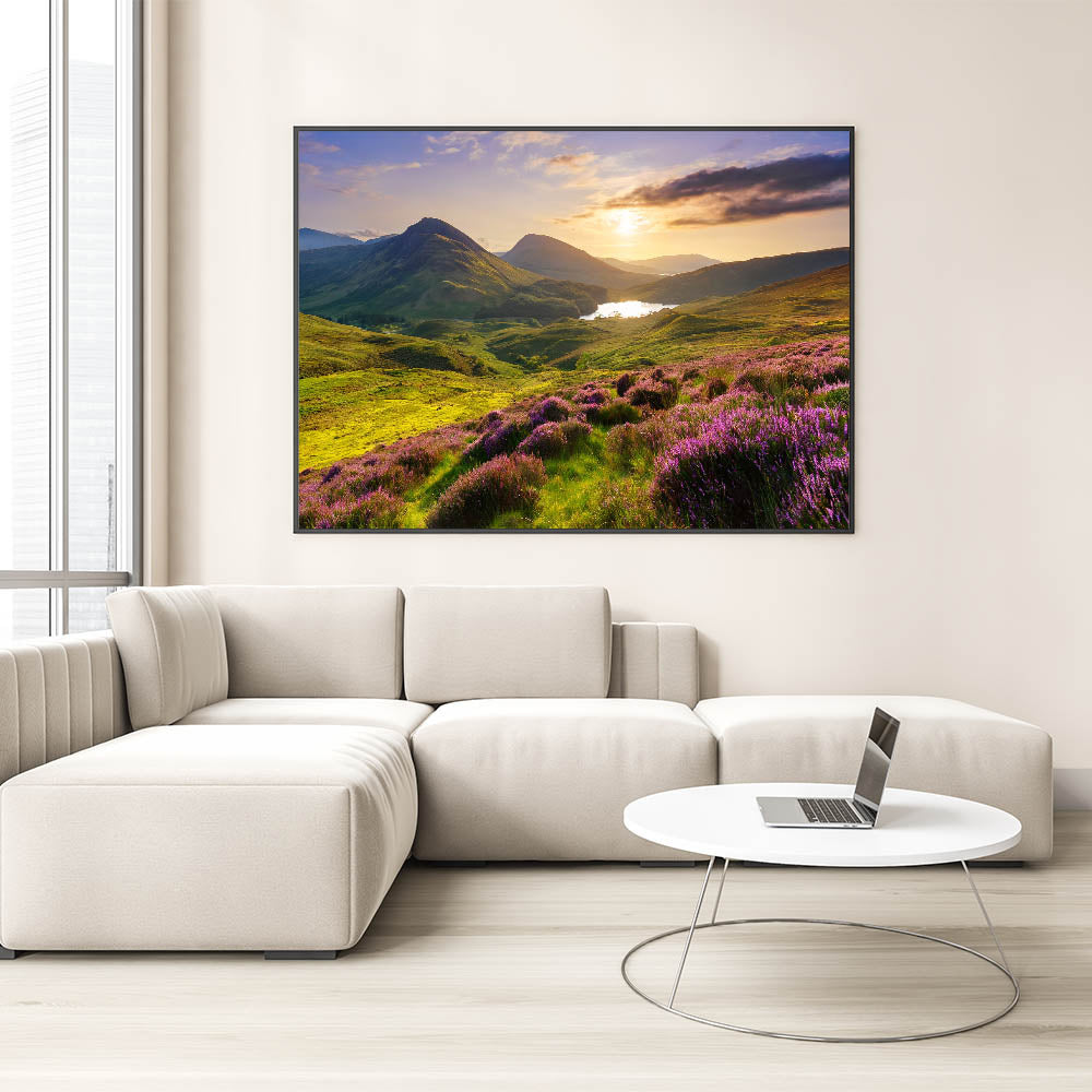Experience the tranquil beauty of the countryside with this stunning wall art featuring rolling hills and vibrant heather fields, bathed in the warm glow of a setting sun. This piece captures the serene charm of nature, with the purple heather contrasting beautifully against the lush green hills and the golden light of the sunset. Perfect for those who appreciate the peacefulness and grandeur of wide-open landscapes, this artwork brings a touch of natural elegance to any room.