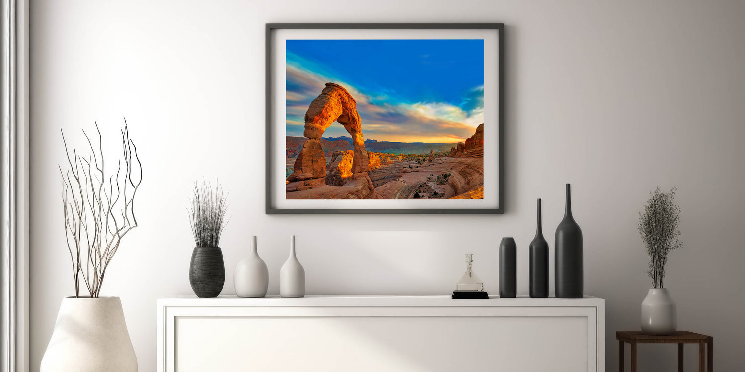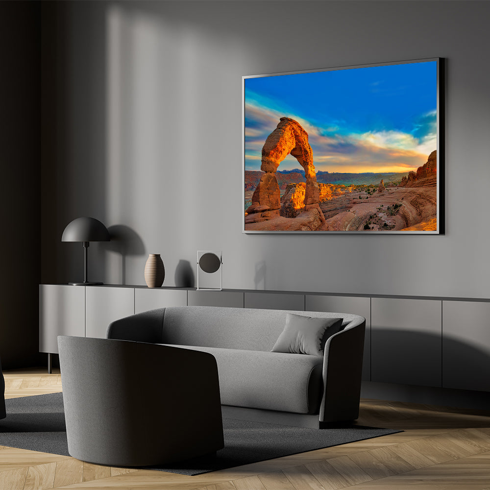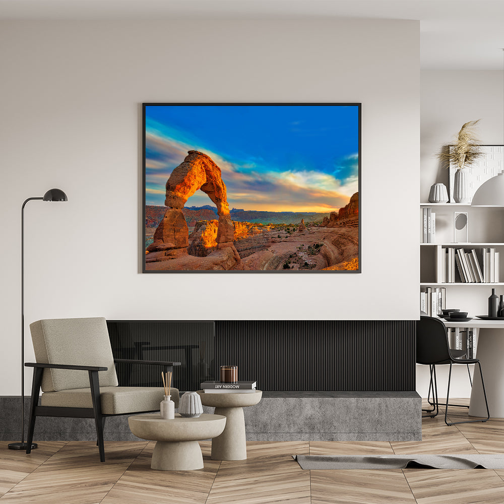 Experience the breathtaking beauty of nature with this vibrant wall art featuring the iconic Delicate Arch at sunset. The vivid colors of the sky, paired with the warm tones of the rocky landscape, create a stunning visual masterpiece that brings the serenity and grandeur of the desert into your home. This artwork is perfect for those who appreciate the raw beauty of natural landmarks and want to add a touch of the great outdoors to their decor.