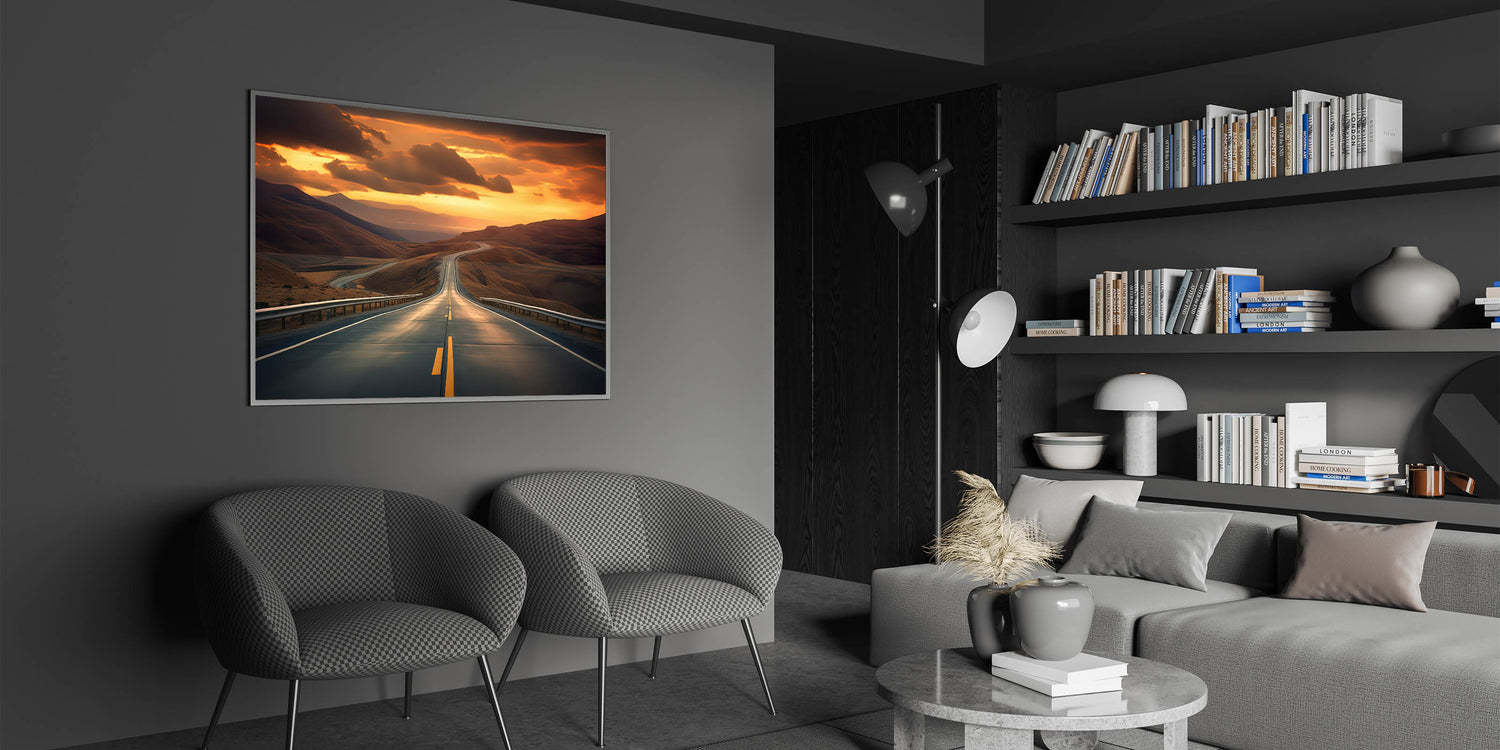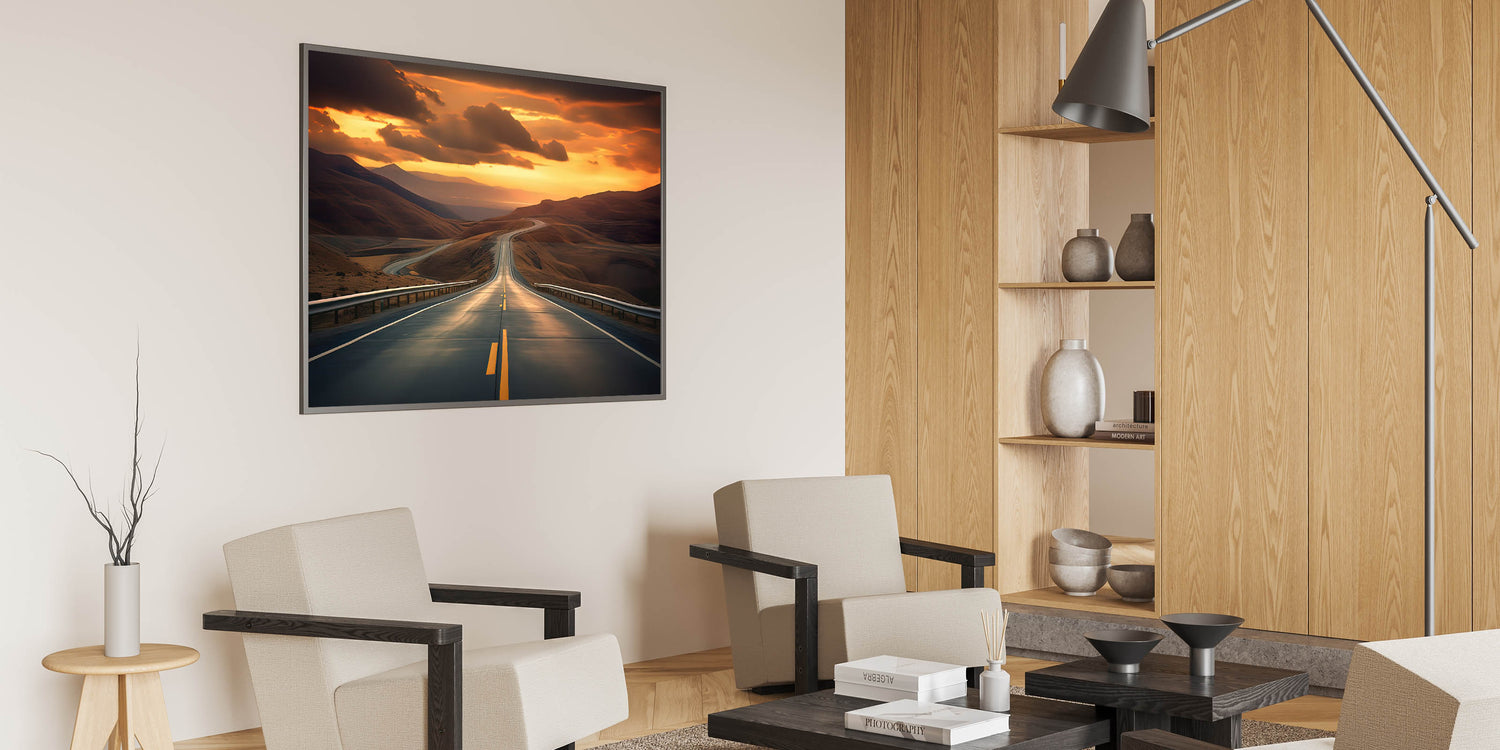 Immerse yourself in the breathtaking beauty of a sunset over a winding desert highway with this stunning artwork. The golden sands and deep shadows create a mesmerizing contrast, while the road leads your eye toward the horizon, inviting you to embark on an endless journey. Perfect for those who love the serenity and mystery of the desert, this piece will add a touch of warmth and adventure to any room.