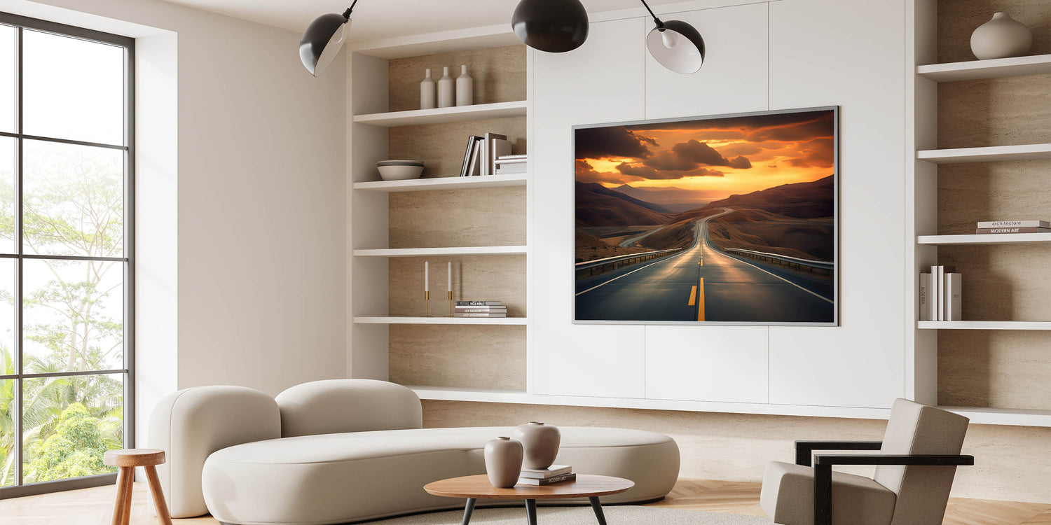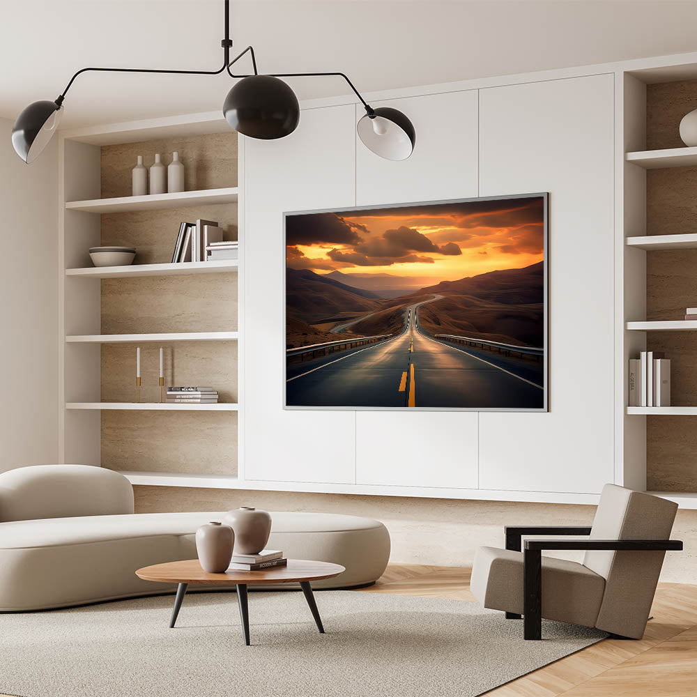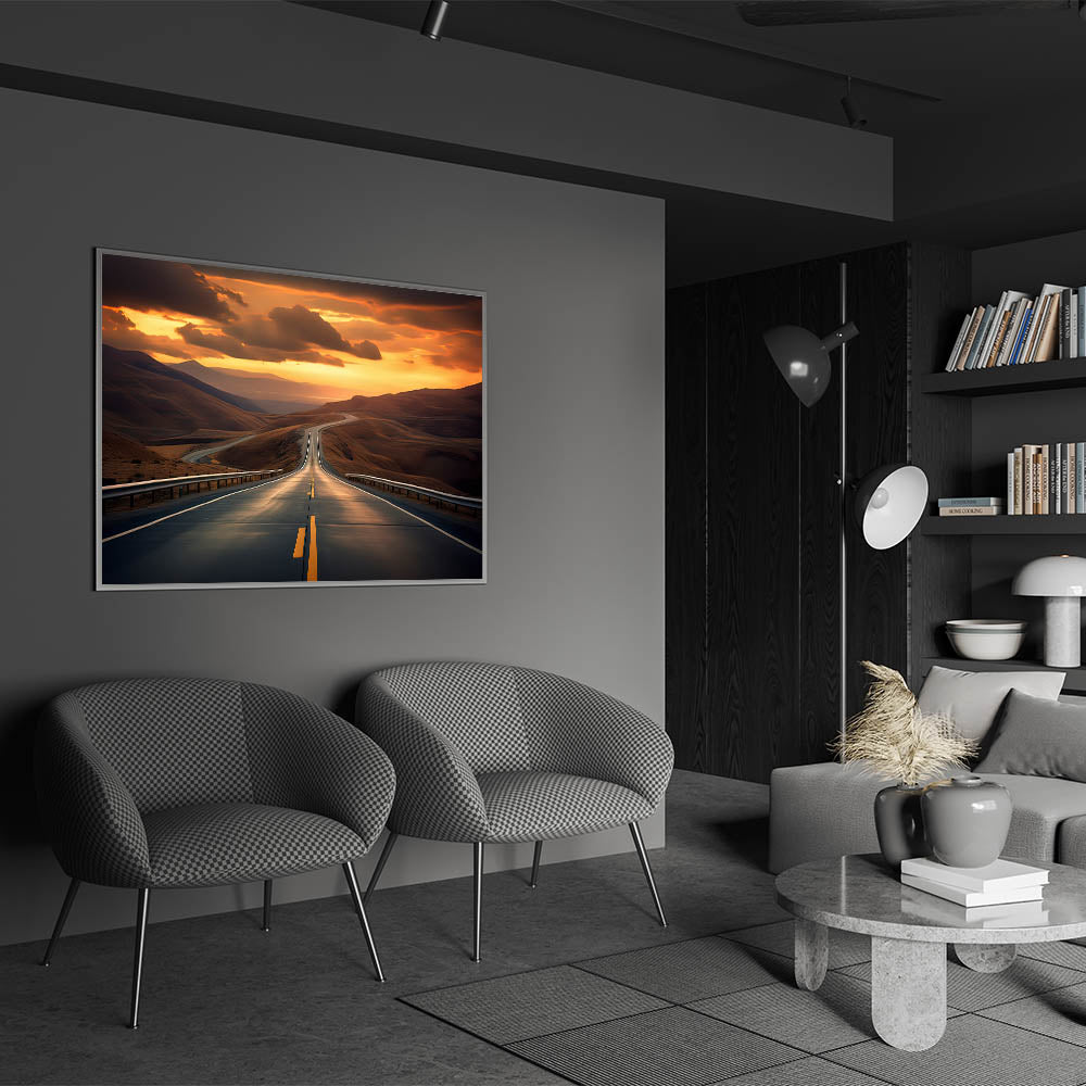 • High-Quality Landscape Photography: Captures the enchanting sunset over a winding desert highway, emphasizing the contrast between the golden sands and the darkening sky.