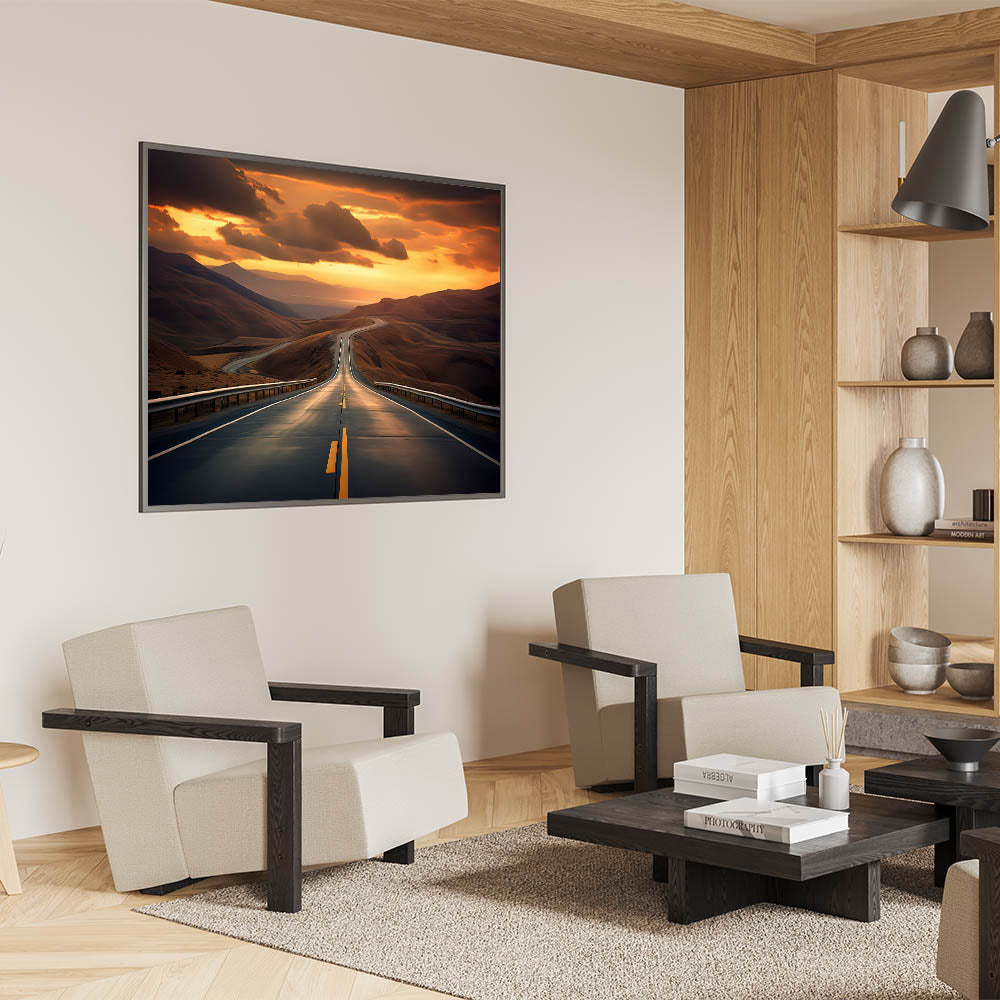 Add this captivating desert highway artwork to your collection, and let it transport you to a place of calm and endless possibilities. This piece is sure to inspire wanderlust and a love for the open road.