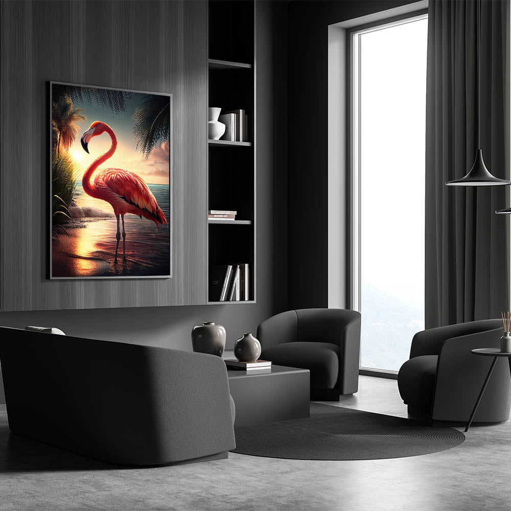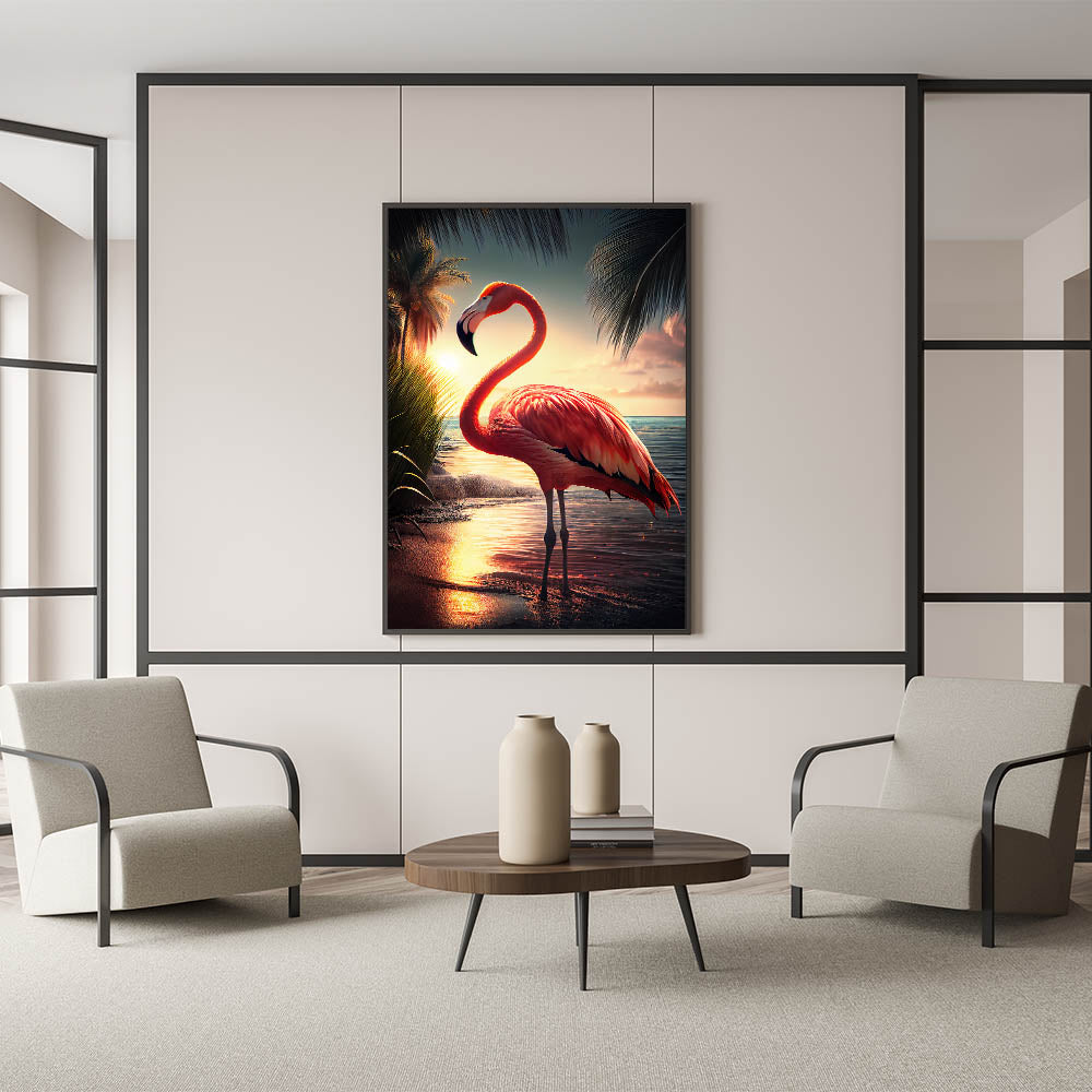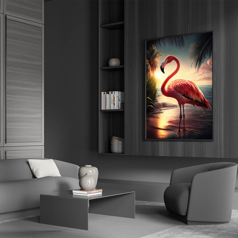 - Vivid Colors: The sunset tones blend seamlessly with the flamingo's pink feathers, offering a captivating visual experience.
