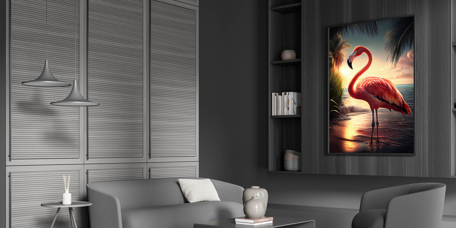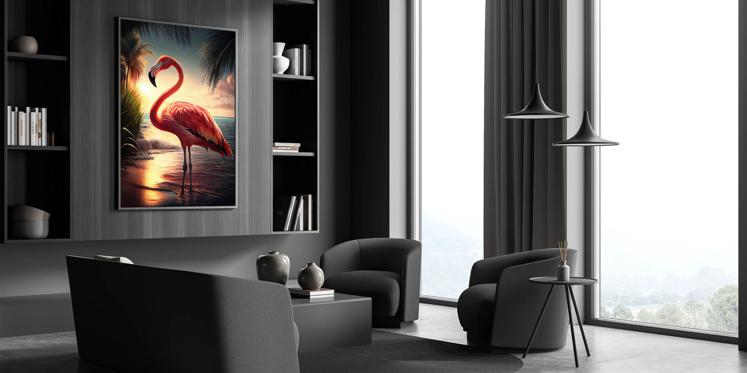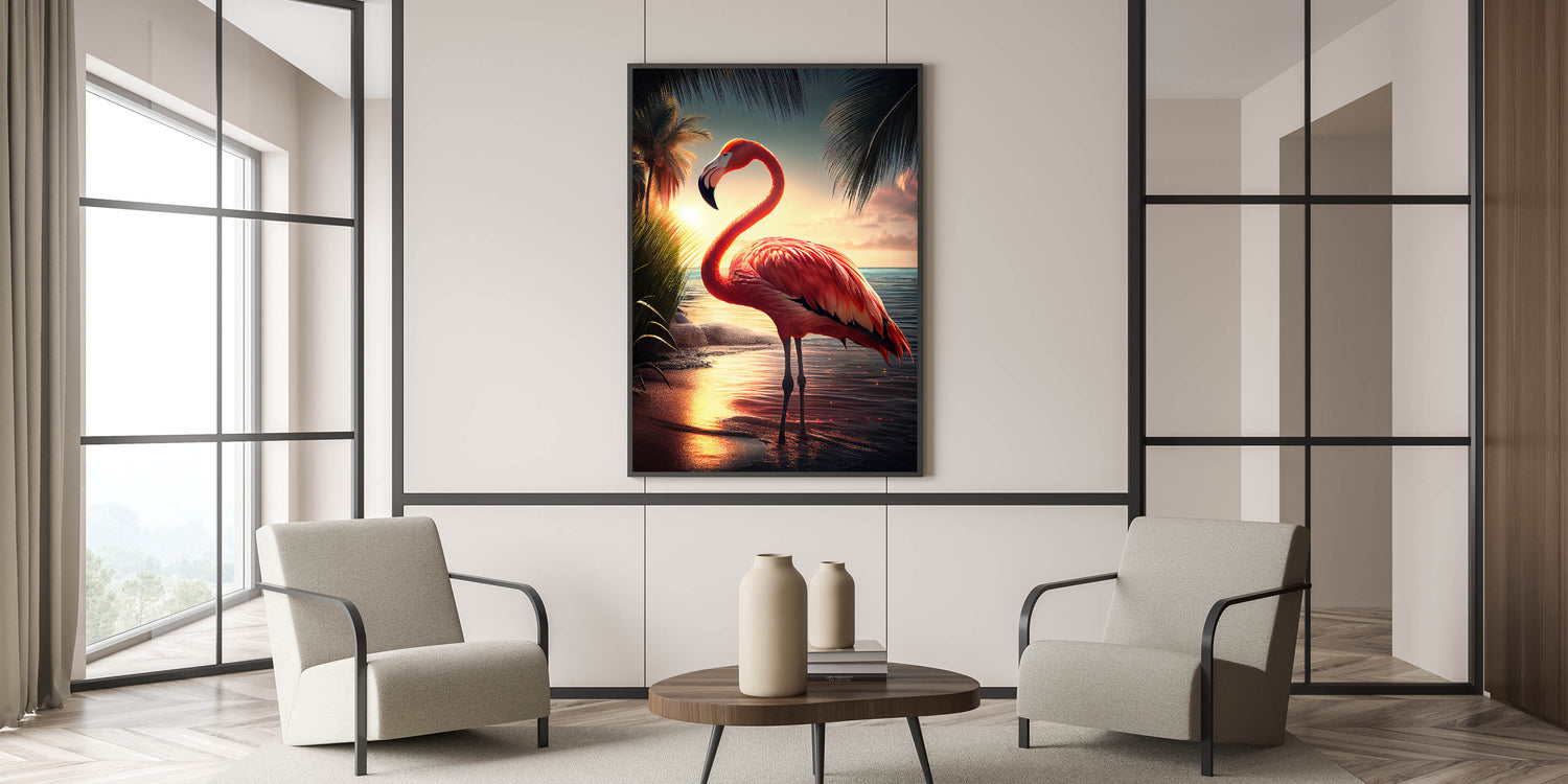 - Vivid Colors: The sunset tones blend seamlessly with the flamingo's pink feathers, offering a captivating visual experience.