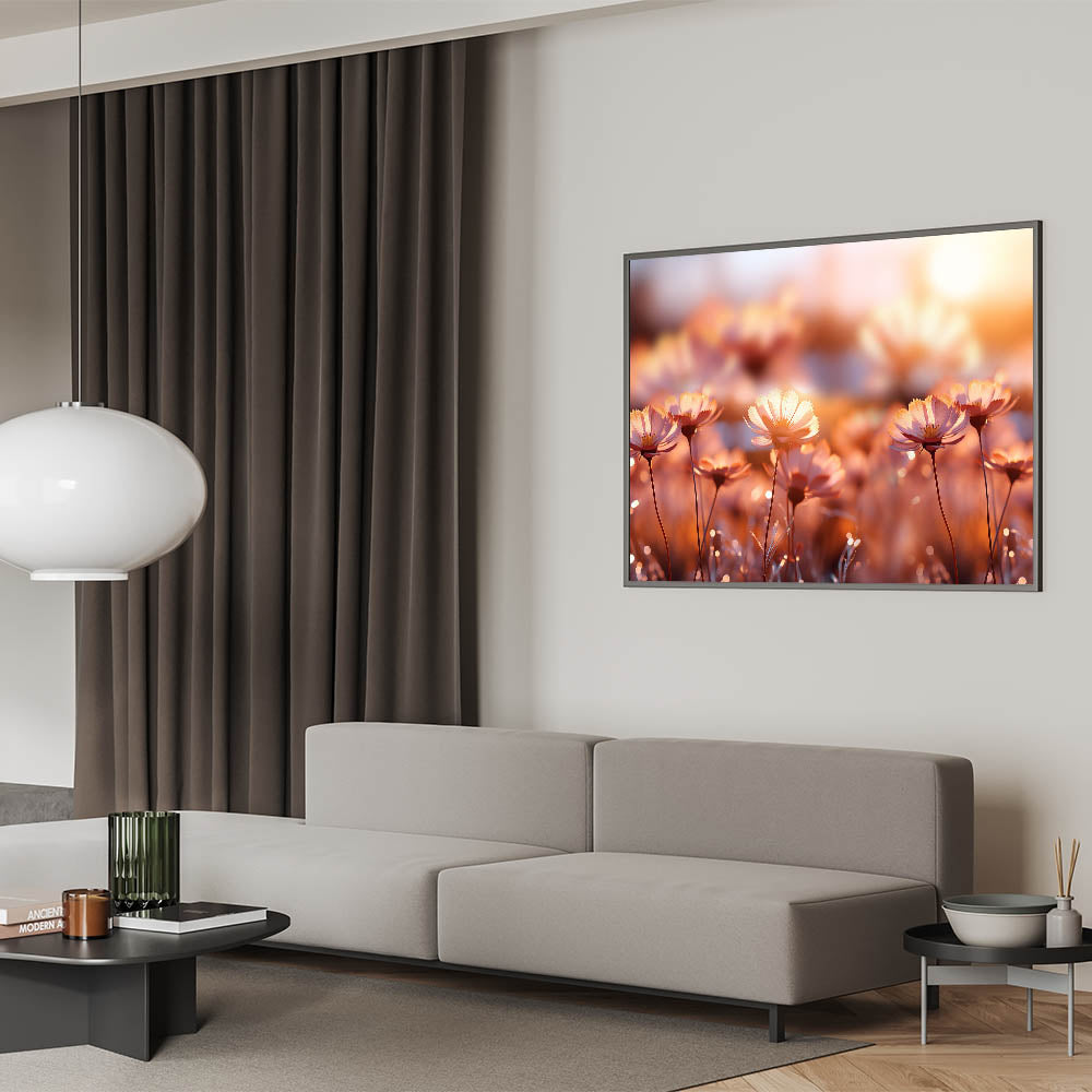 Infuse your home with warmth and serenity through this stunning floral wall art. The design captures the delicate beauty of blooming flowers illuminated by a warm, golden sunset. This nature-inspired artwork brings a sense of peace and elegance to any space, making it a perfect addition to your living room, bedroom, or office. Available in various premium formats, including stretched canvas, framed acrylic glass, and more, this piece offers flexibility for different decor styles.