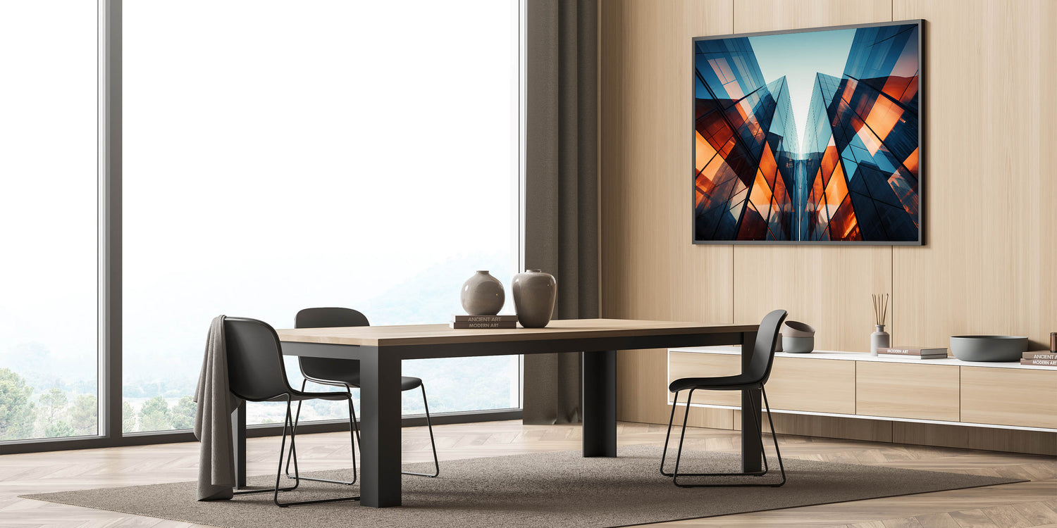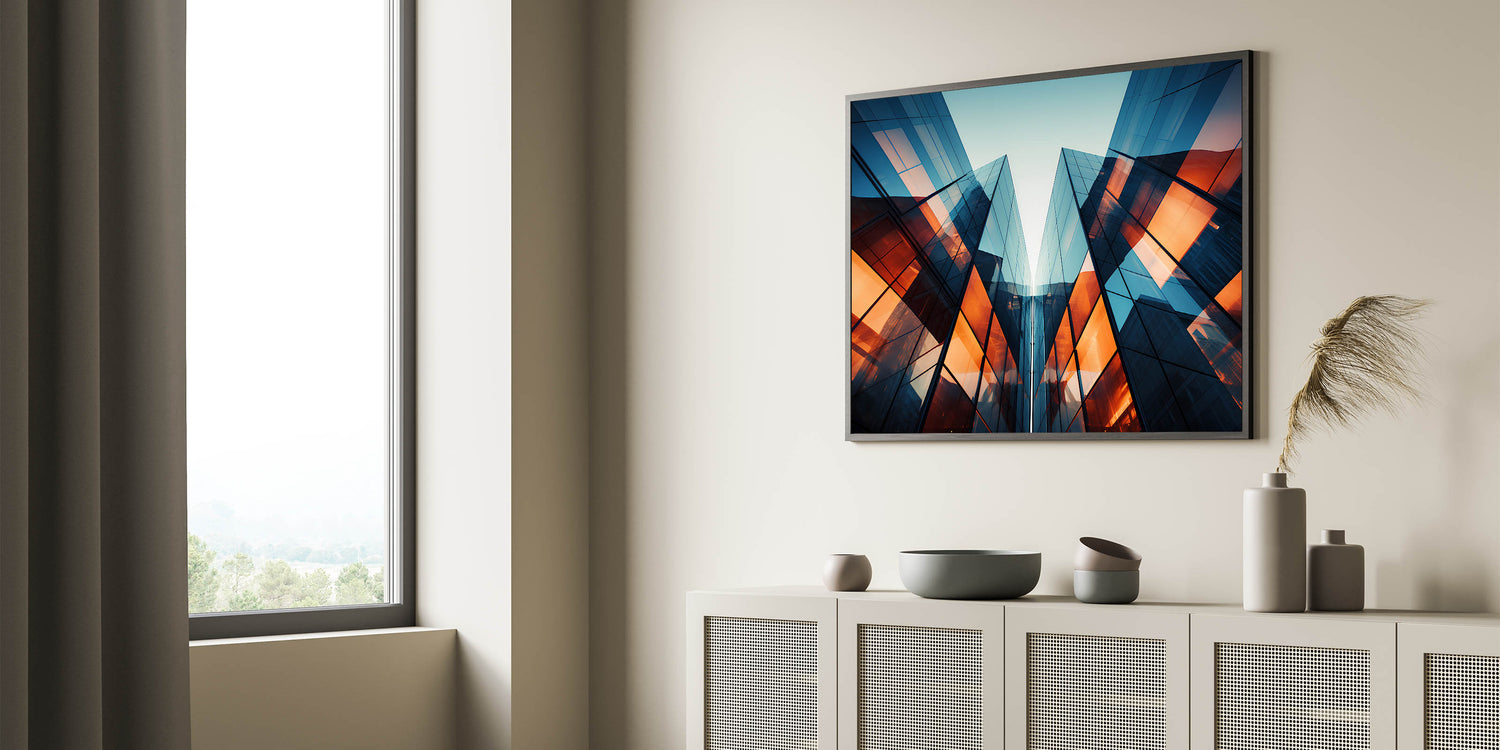 - High-resolution geometric architecture prints that highlight dynamic color transitions