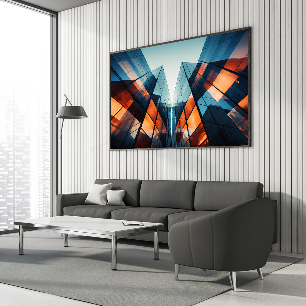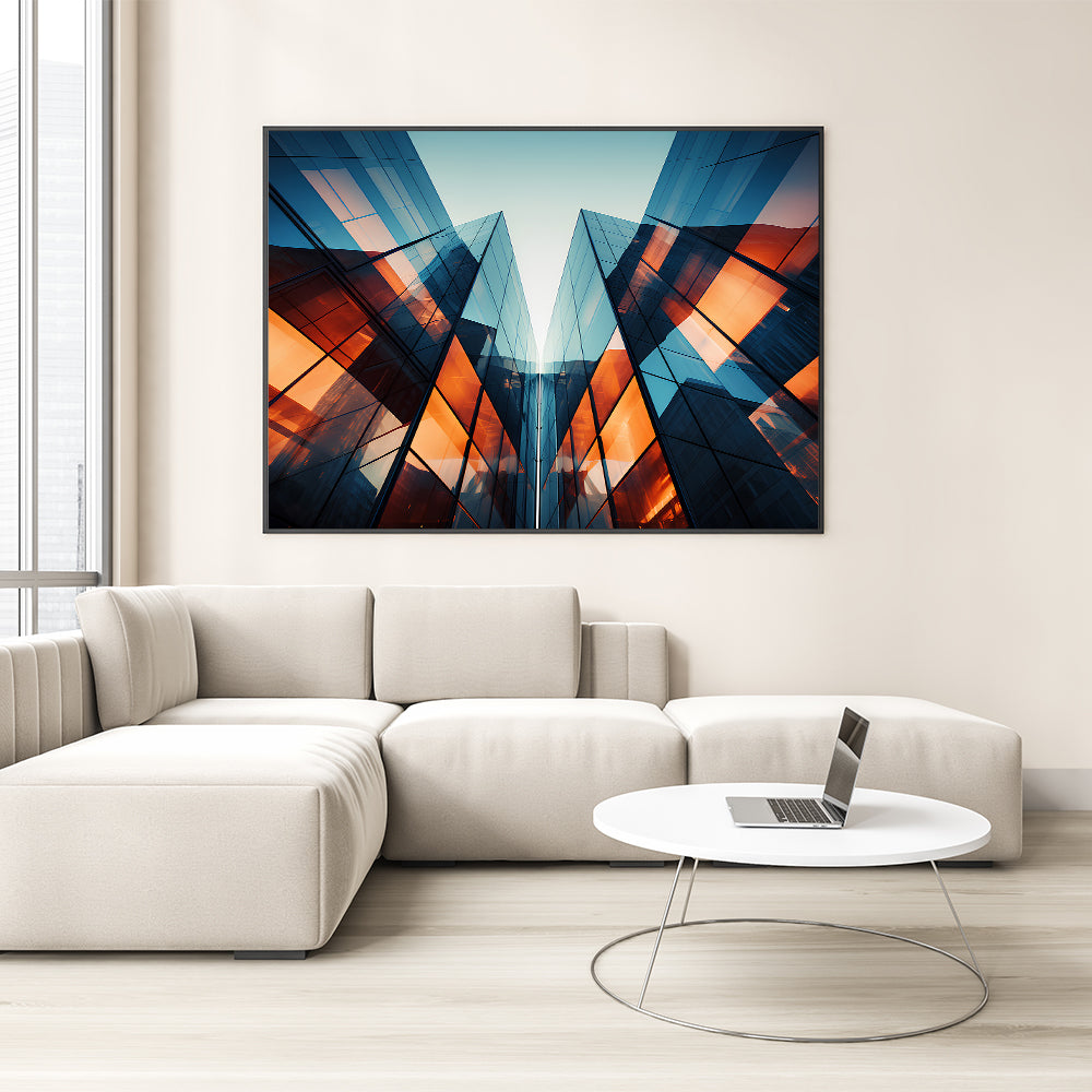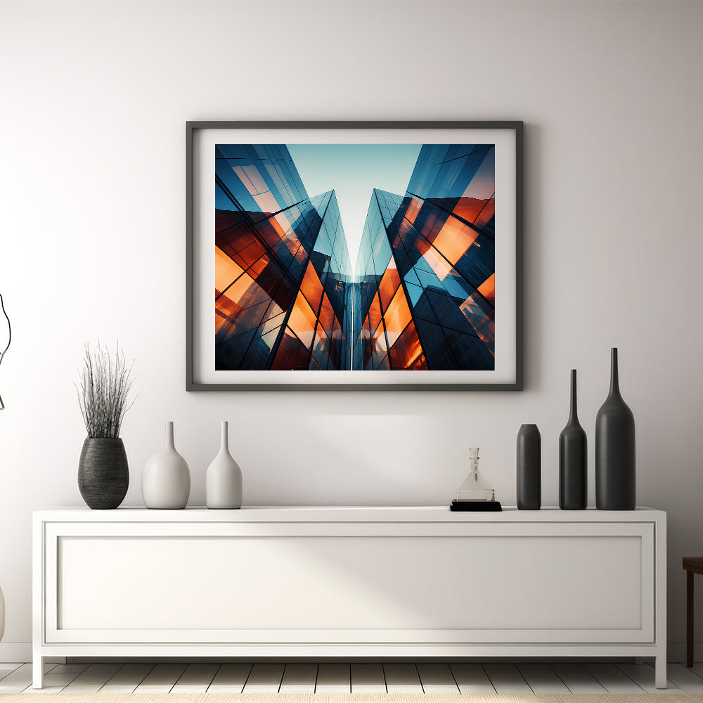 Dive into a world of color and geometry with our Sunset Glow Geometric Architecture Print, a vivid representation of modern buildings bathed in the warm hues of a sunset. This artwork uses bold colors and sharp angles to create a stunning visual impact that captures the essence of contemporary design.