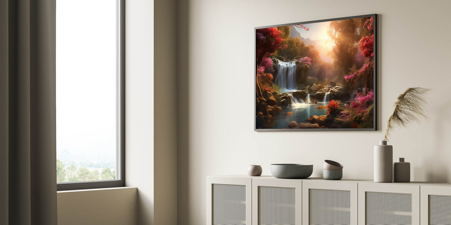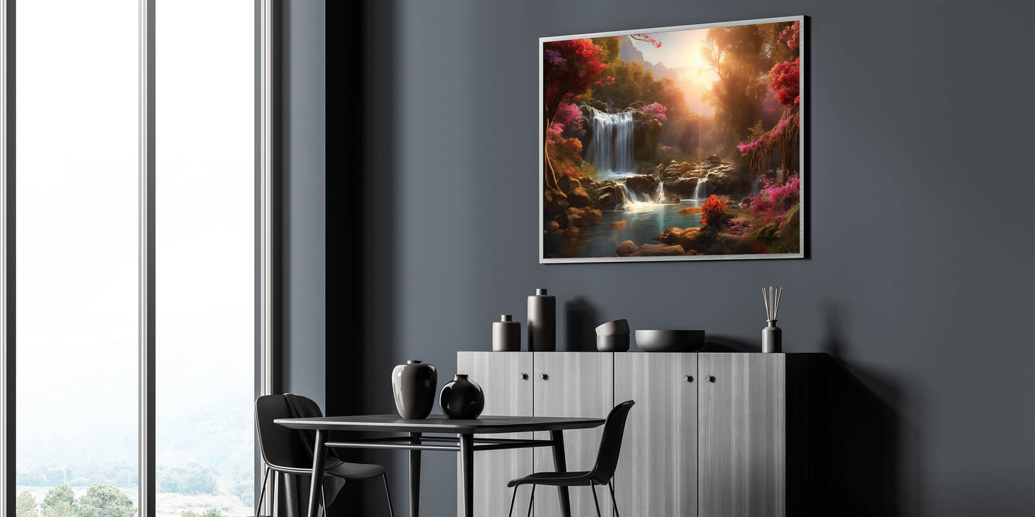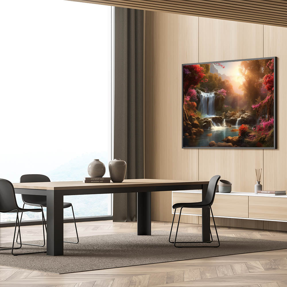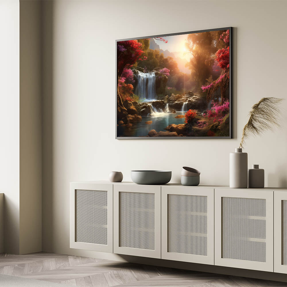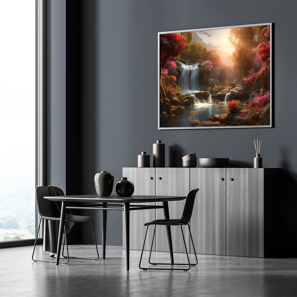 Transform your living space with this stunning waterfall painting that captures the essence of a vibrant sunset. Whether displayed in a contemporary setting or a more traditional space, this artwork will infuse your decor with warmth and tranquility.